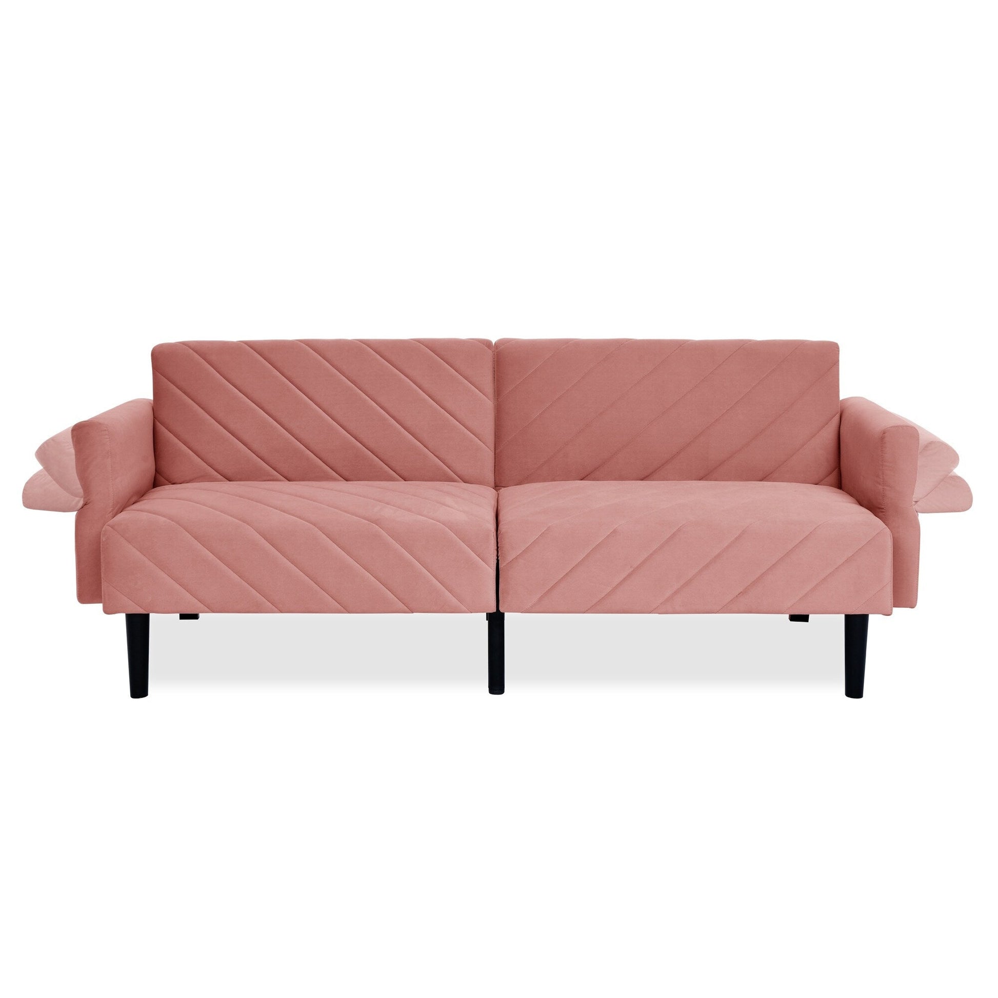 Elevate your living space with this timeless and versatile velvet futon sofa bed. Combining modern lines with mid-century modern details, such as chevron tufting and tapered plastic legs, this piece adds style to any decor. The velvet upholstery not only looks elegant but also adds extra comfort and durability, allowing you to enjoy its softness and warmth. The multi-angle adjustable armrests and backrests provide customized comfort, with the backrest adjustable in 6 positions (90° to 180° reclining), making it perfect for reading, entertainment, or sleeping. Simply pull to switch it between a sofa, bed, and recliner. Built for long-term use, the frame is made of iron and solid wood, ensuring a stable structure, while the high-density foam provides firm and comfortable support that will not deform. The adjustable armrests offer more sleeping space, allowing you to stretch comfortably on the sofa bed instead of curling up. The sleeper area measures 87' x 39.5' x 17.5', providing ample space for relaxation.