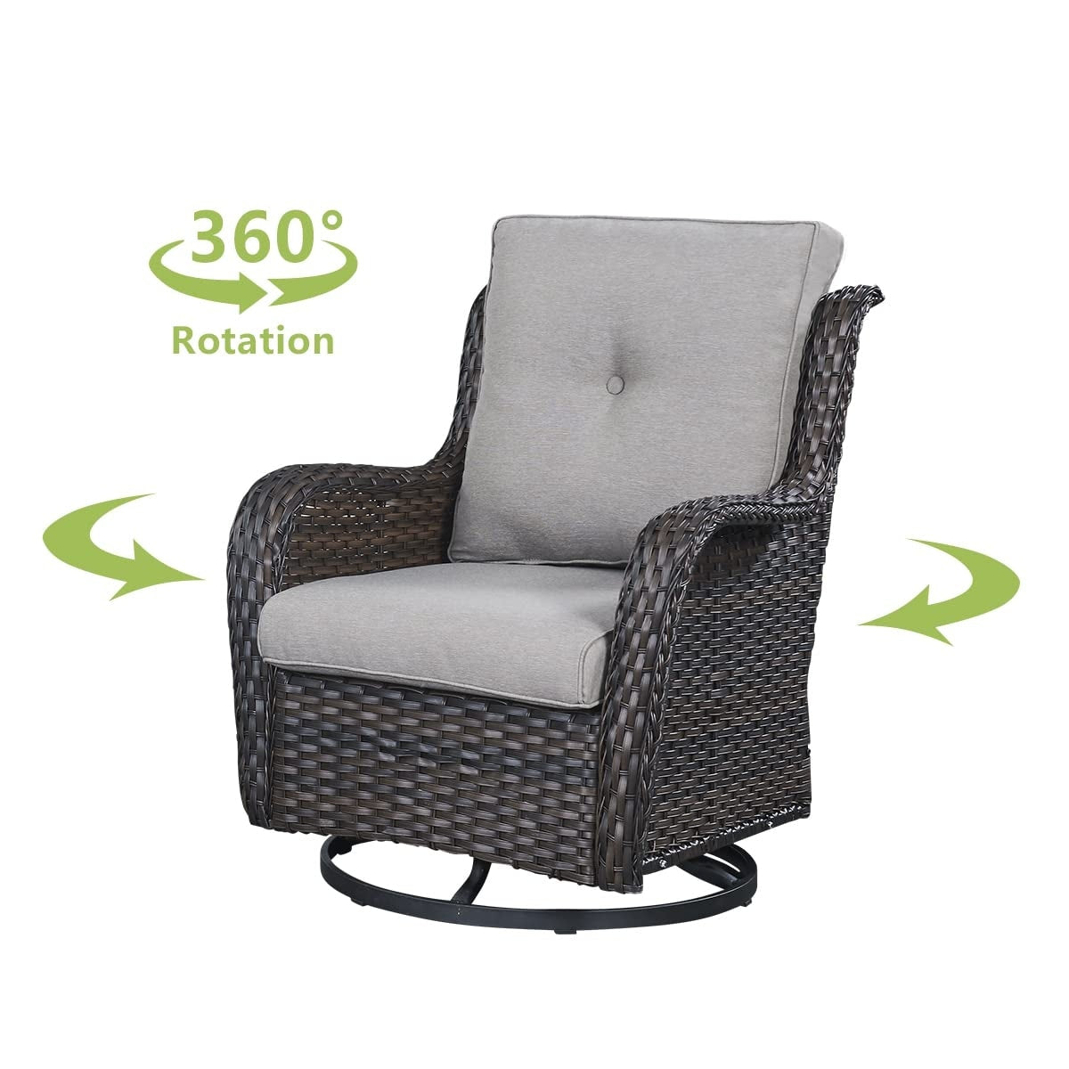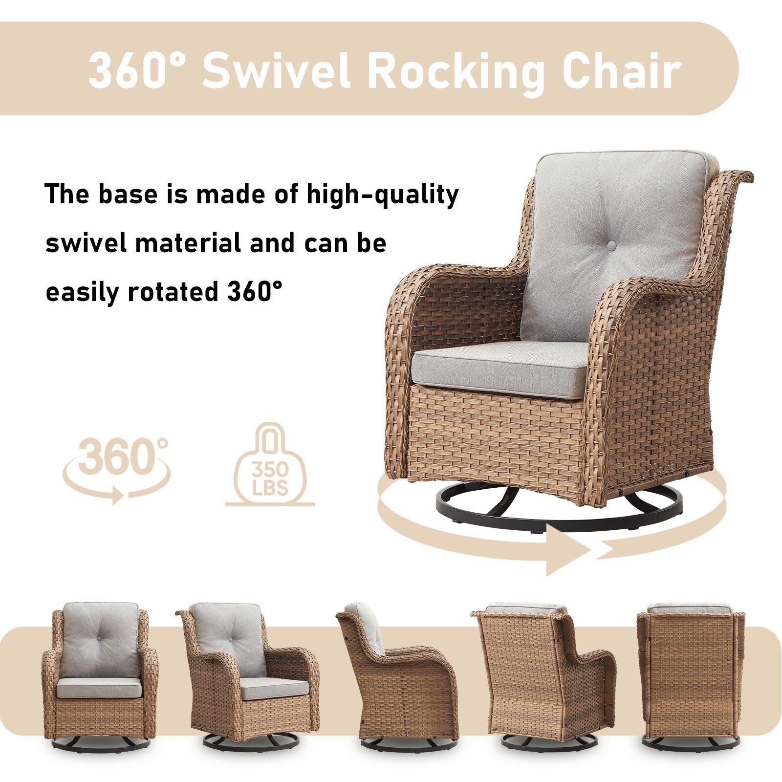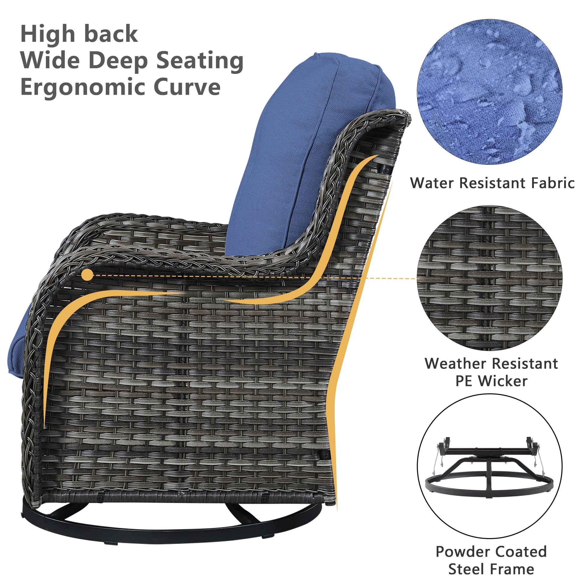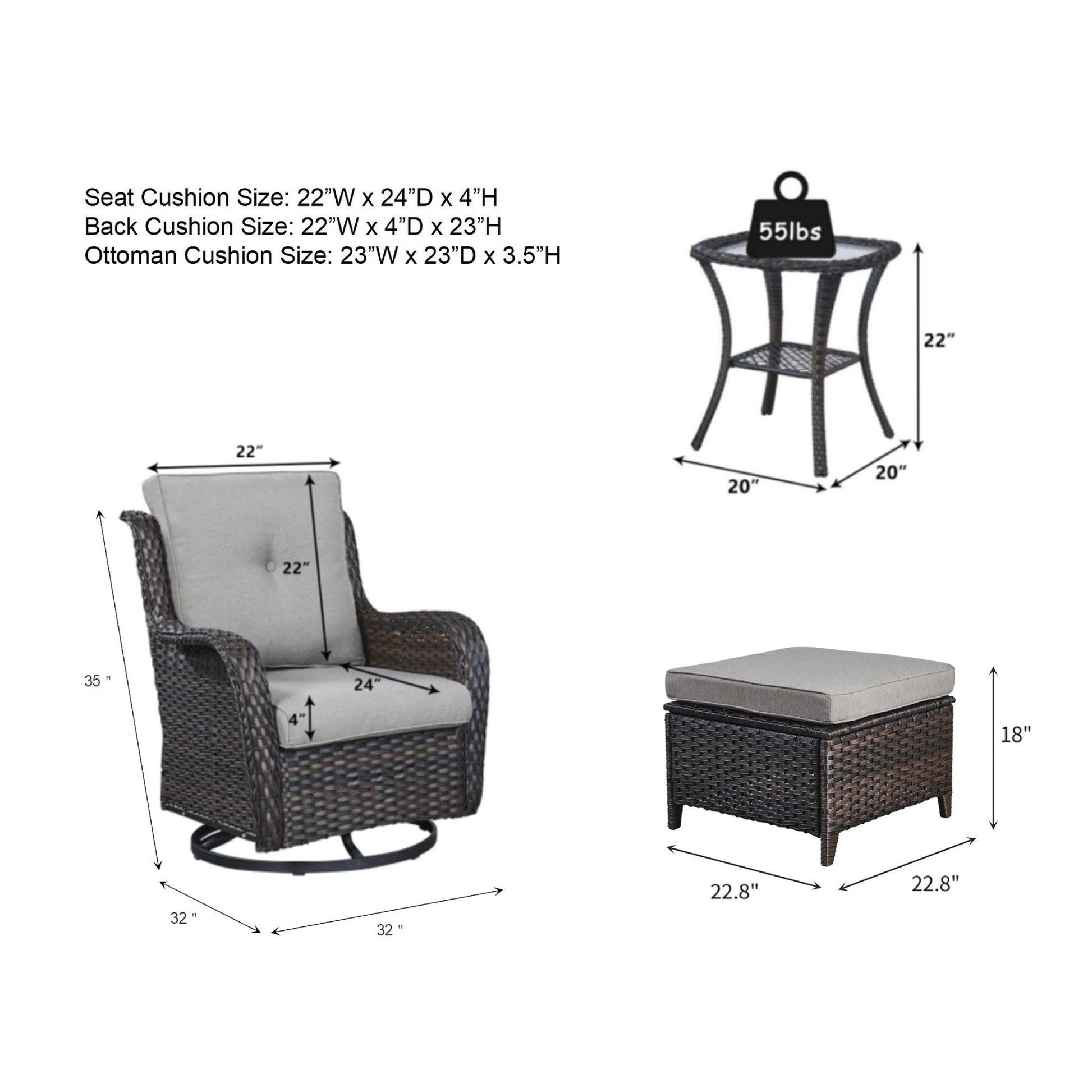 Relax in style with the Pocassy 5-Piece Outdoor Furniture Set, featuring swivel chairs with ottomans and a glass side table. Perfect for spending quality time outdoors with loved ones, this set is made of durable rattan material and a sturdy steel frame that can support up to 350 pounds. The thick padded cushions, made of soft sponge with removable covers, provide ultimate comfort and are easy to clean. With 360-degree swivel and rocking features, deep seating and ergonomic high backrests, these chairs offer unparalleled relaxation. The set comes with a side table with 2-tiers of storage and is available in brown or grey wicker with blue, beige, or grey cushions.?