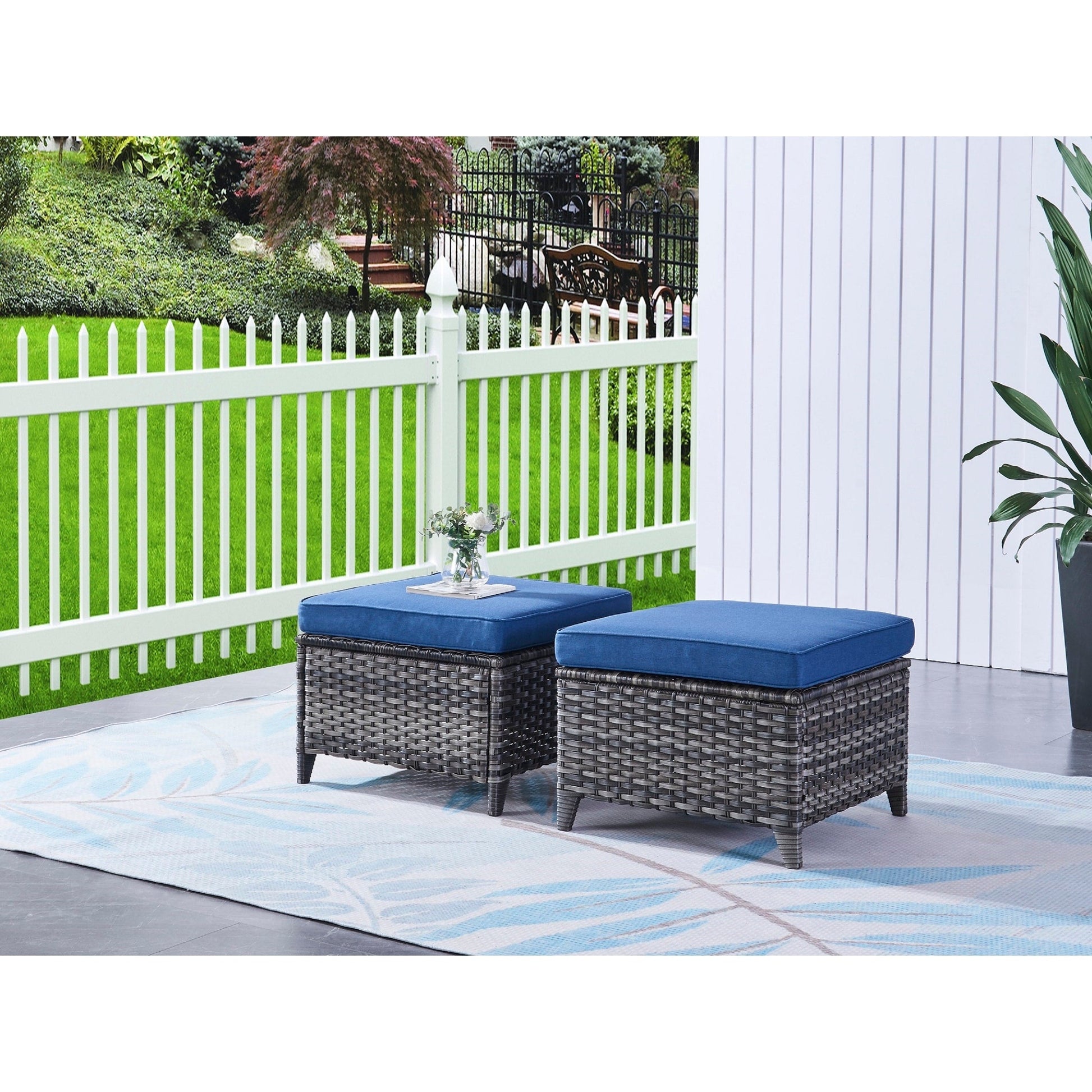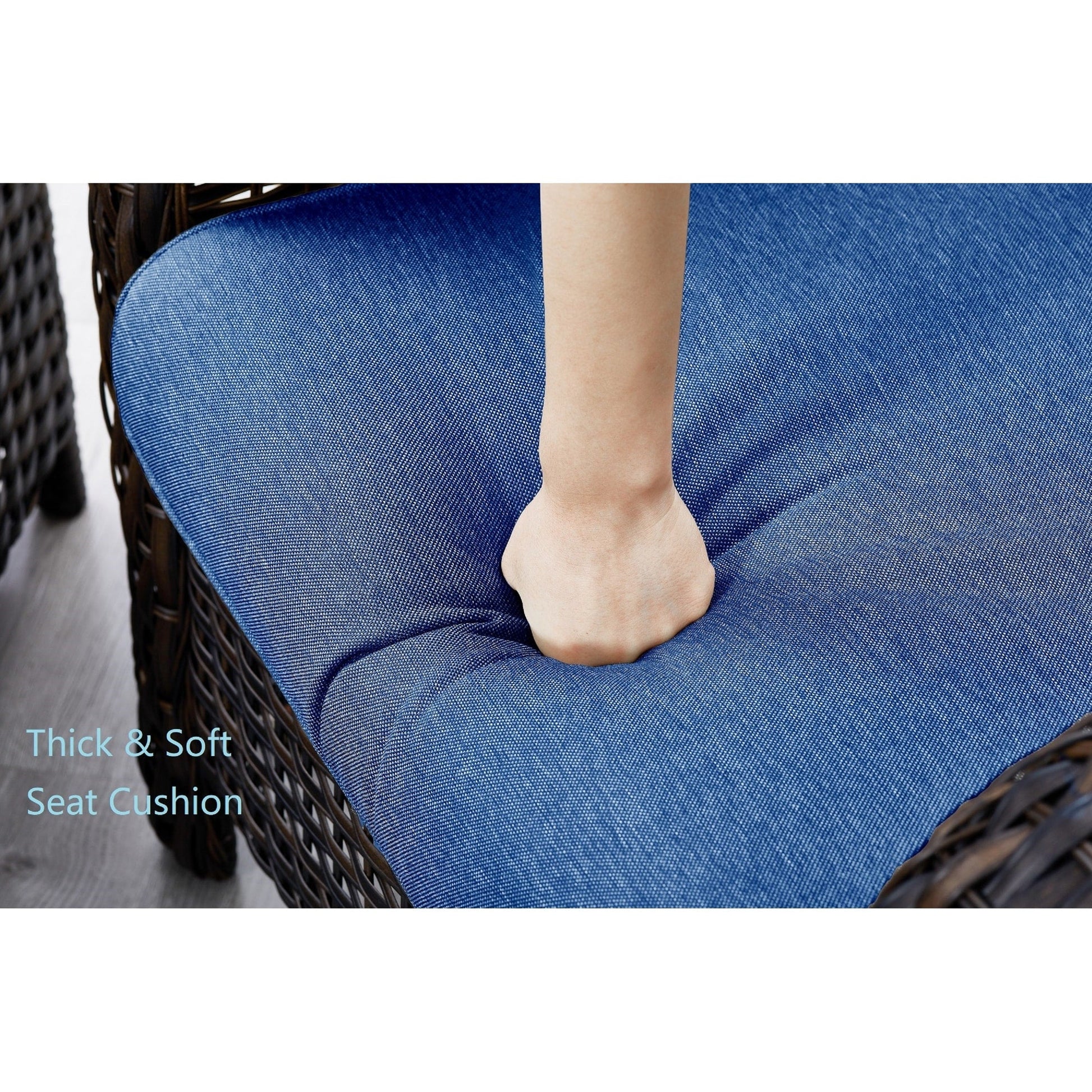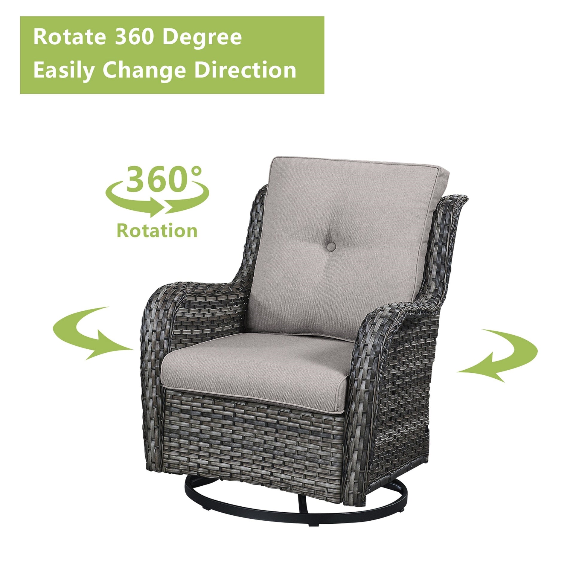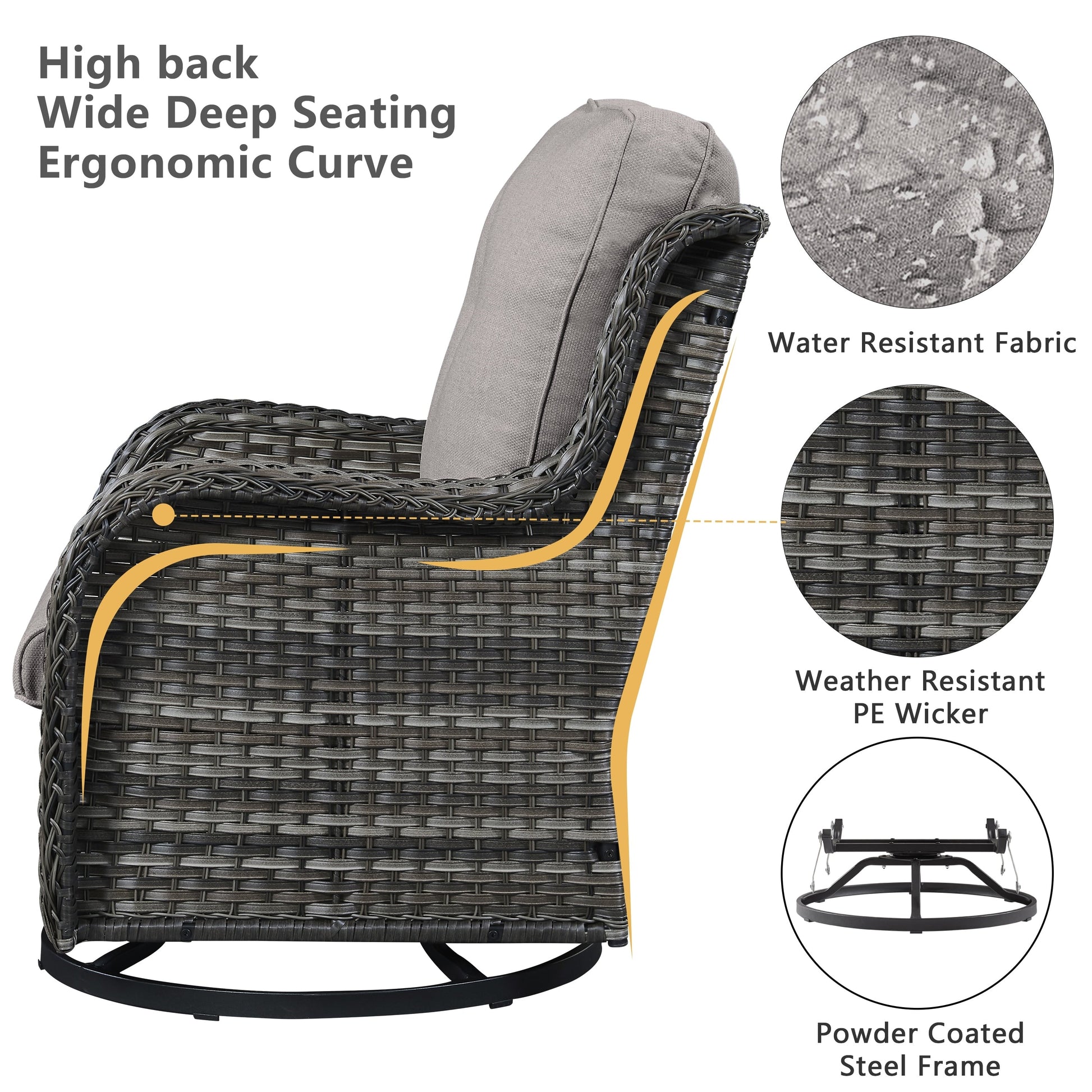 Relax in style with the Pocassy 5-Piece Outdoor Furniture Set, featuring swivel chairs with ottomans and a glass side table. Perfect for spending quality time outdoors with loved ones, this set is made of durable rattan material and a sturdy steel frame that can support up to 350 pounds. The thick padded cushions, made of soft sponge with removable covers, provide ultimate comfort and are easy to clean. With 360-degree swivel and rocking features, deep seating and ergonomic high backrests, these chairs offer unparalleled relaxation. The set comes with a side table with 2-tiers of storage and is available in brown or grey wicker with blue, beige, or grey cushions.?