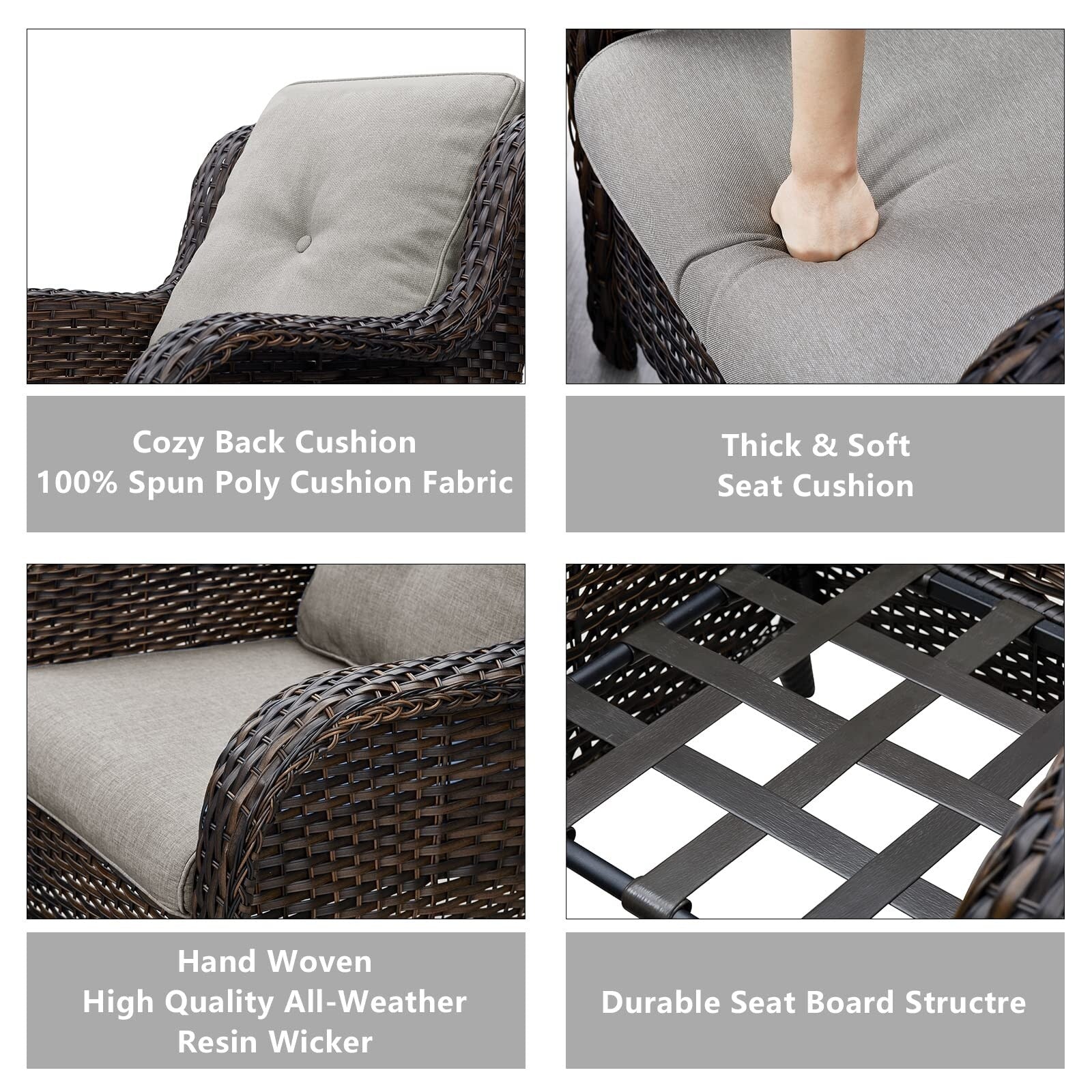 WATER RESISTANT CUSHIONS: The outdoor-rated cushion covers are PU-coated polyester fabric that is UV-ray, stain, and moisture-resistant and is softer than standard polyester. The 4'' cushions of this outdoor conversation set, providing excellent support and reduces fatigue, allowing you to relax and immerse yourself in comfort for extended periods of time. In addition, the removable cushions with smooth zipper make cleaning a breeze.