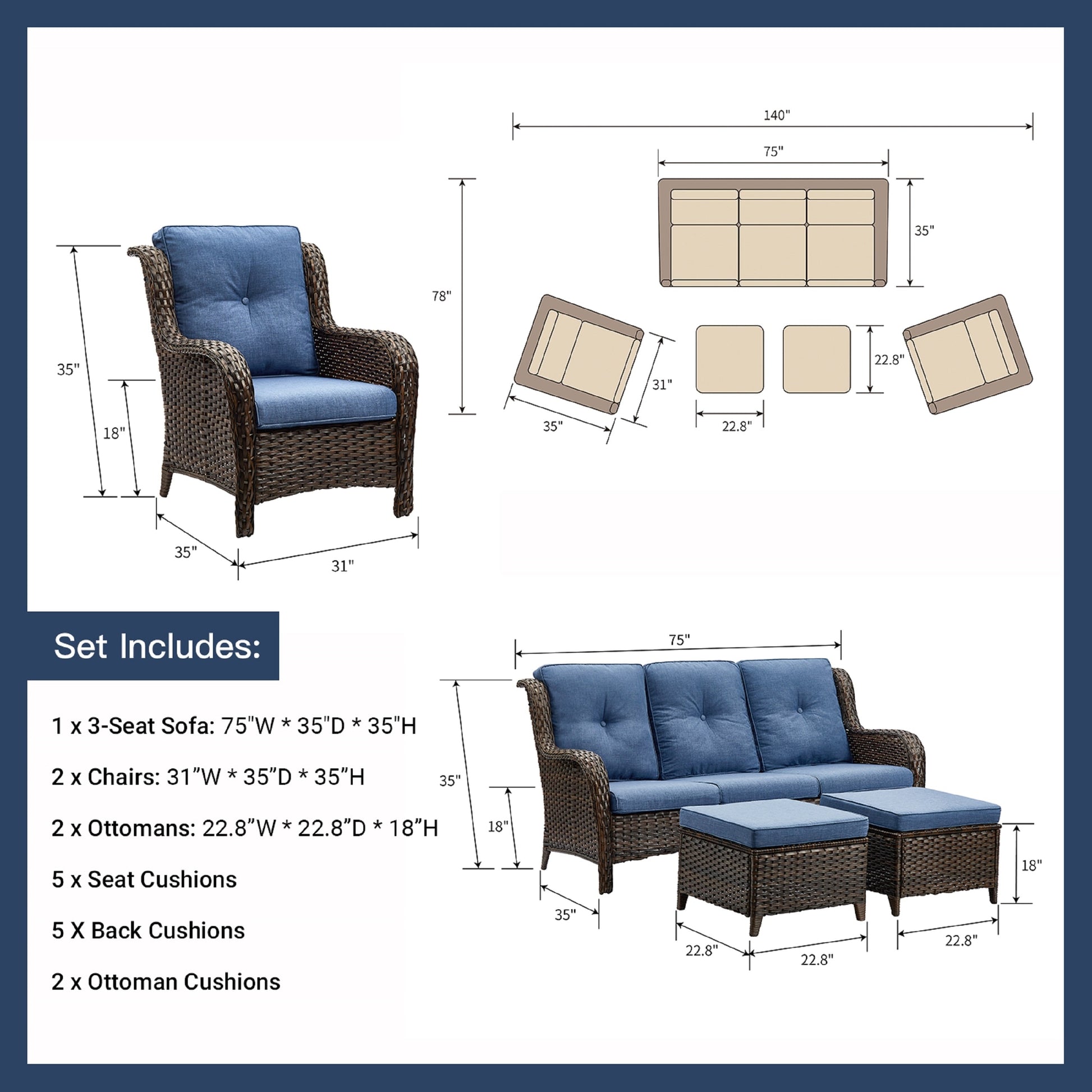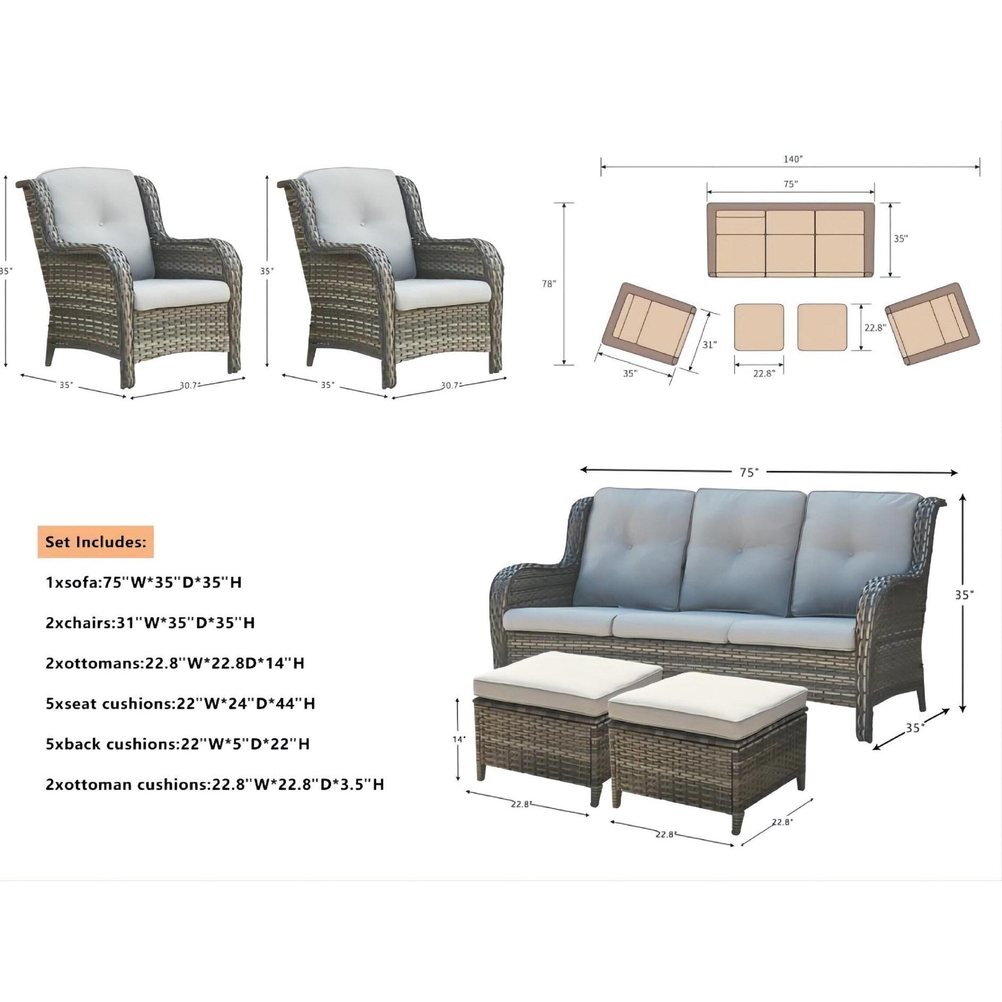 Dimensions: ?1 x 3-Seater Sofa: 75'W * 35'D * 35'H ?2 x Chairs: 31'W * 35'D * 35'H ?2 x Ottomans: 22.8'W * 22.8'D * 18'H ?