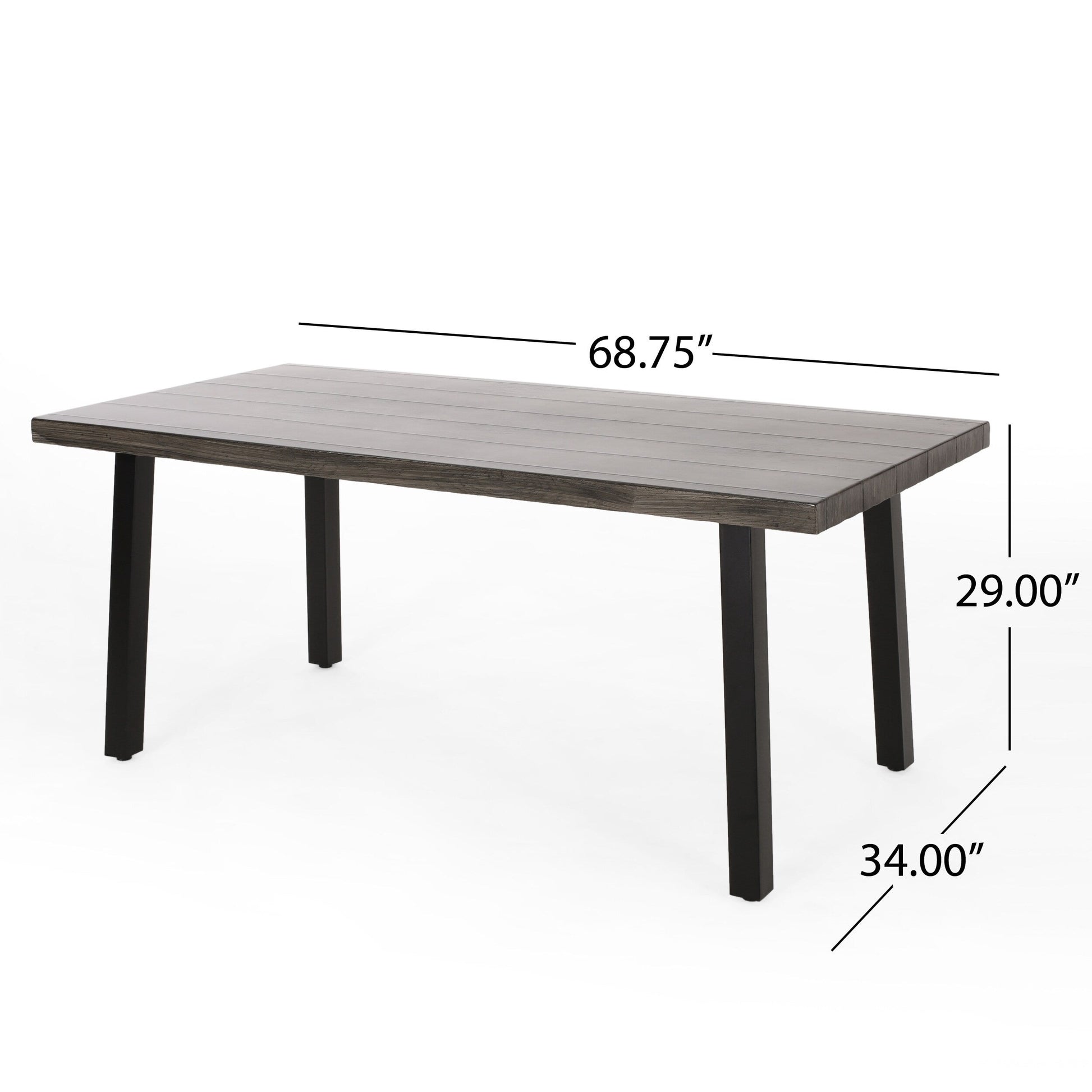 Bring your outdoor space to life with a sleek blend of modern and traditional materials. Our charming dining set brings a perfect amount of stylish comfort and edgy aesthetics to your backyard or patio space. This offers a sleek aluminum top with a wood finish for a natural touch and beautifully woven wicker seating to complete the look. Excellent for any patio, deck, or backyard space, our set brings refinement to any outdoor get-together or dinner party you may host.