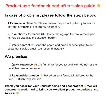 For any inquiries or issues, simply email us with photos and a description of the problem. Our dedicated support team will respond promptly to resolve your concerns.
