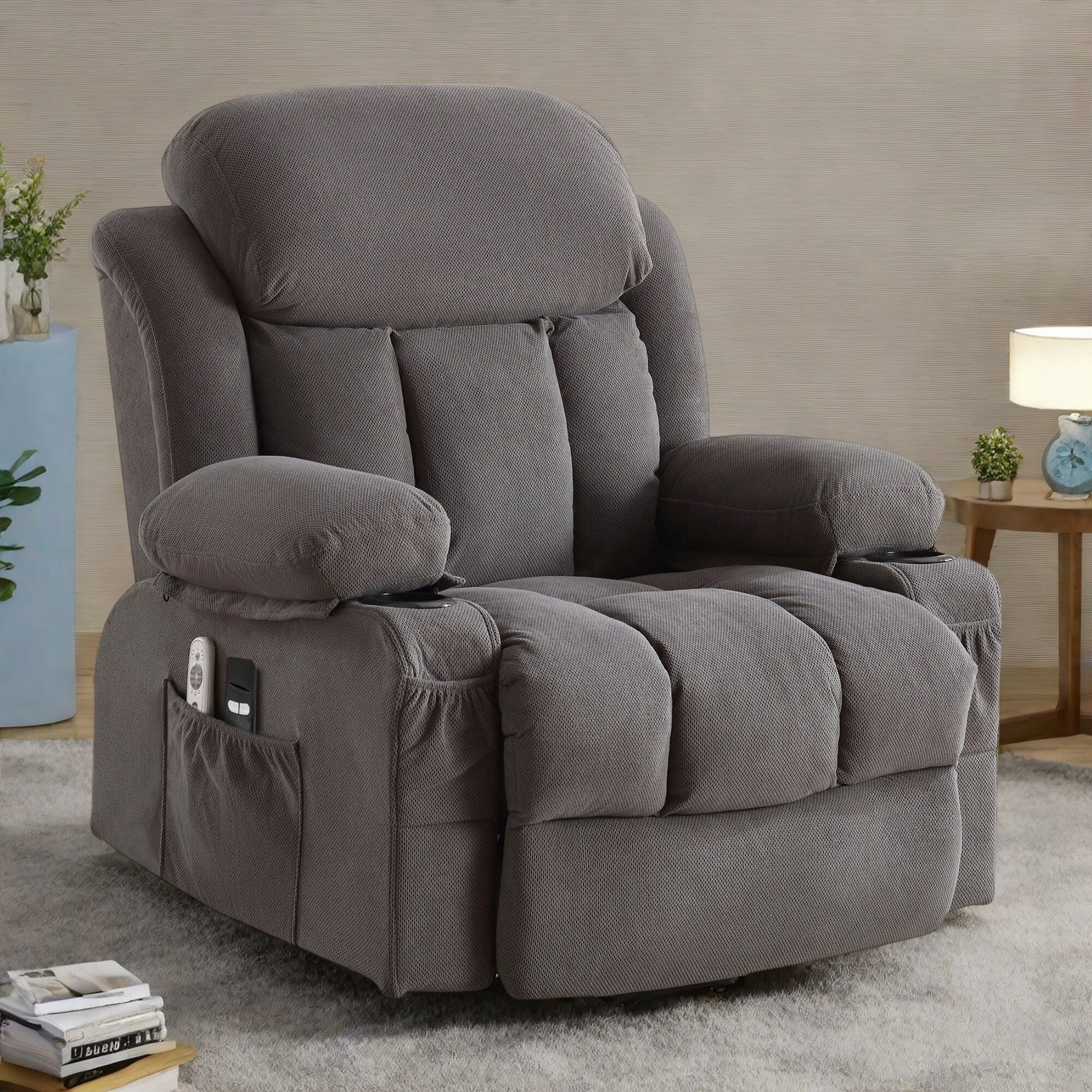 • Convenient Features: Equipped with two side cup holders and dual storage pockets for easy access to drinks, magazines, and remotes. A built-in USB port allows you to charge your phone or electronic devices while relaxing.