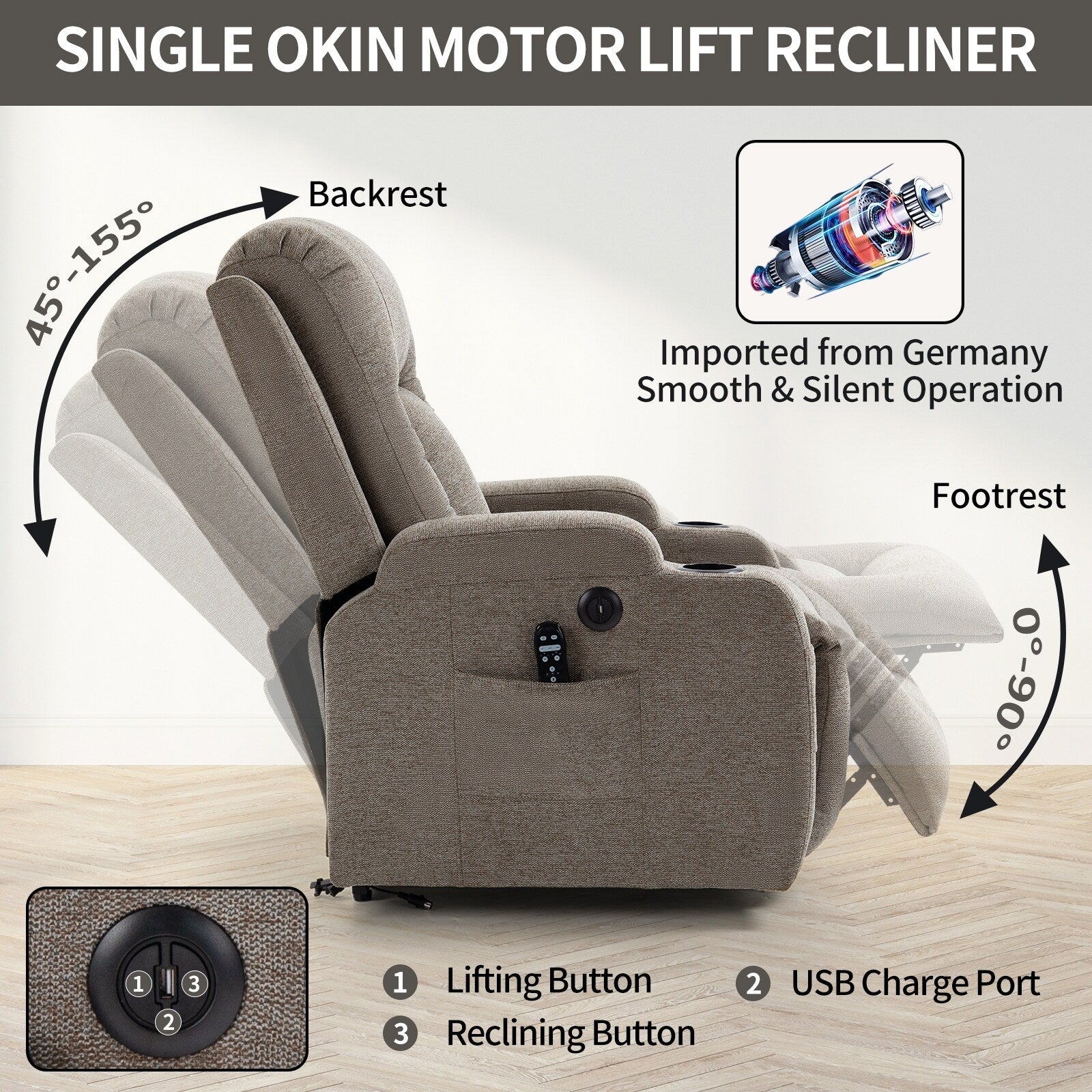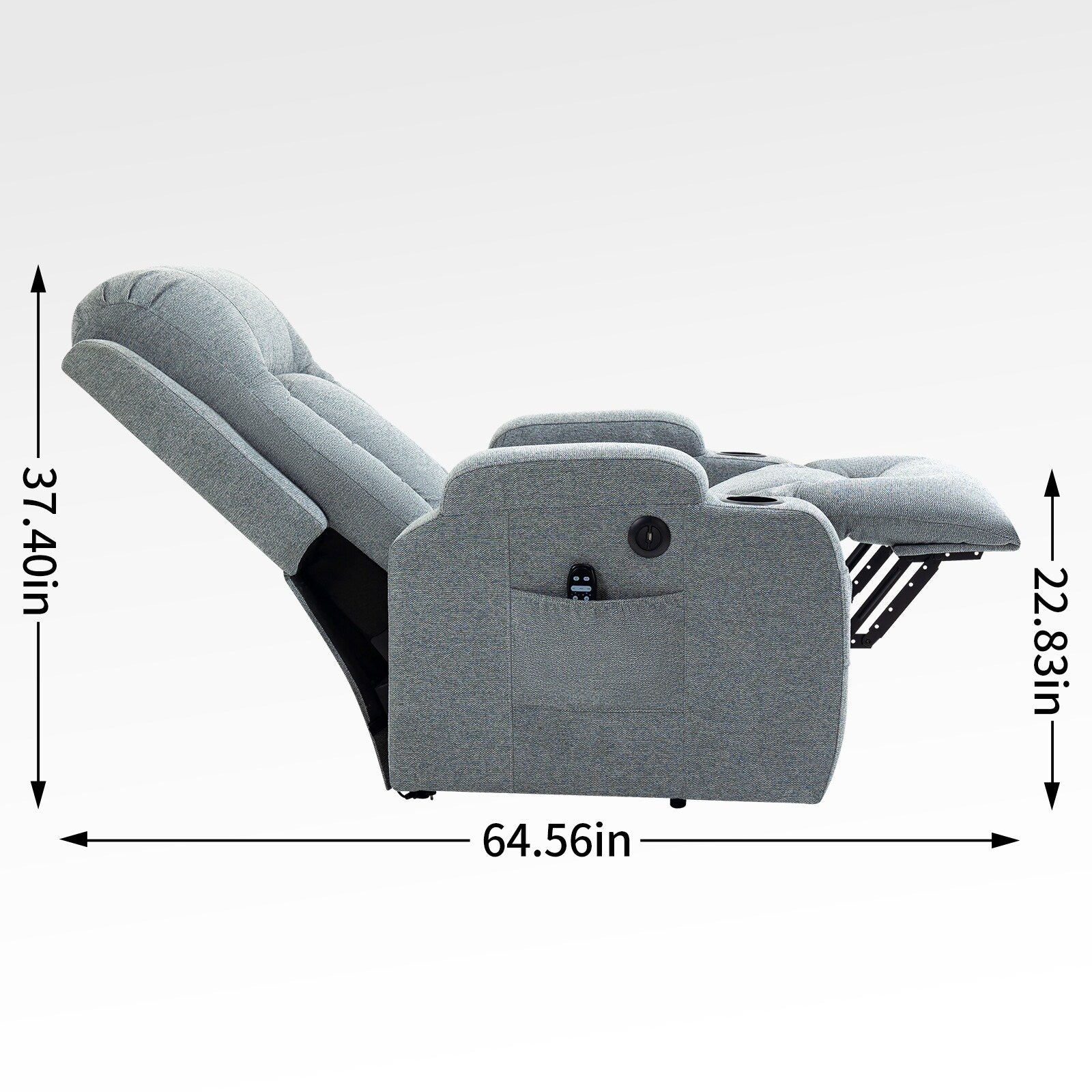 USB Charging Dual Cup Holders: A built-in USB port (for low-power devices like phones) keeps your essentials charged. Two cup holders let you enjoy drinks while lounging or watching TV.