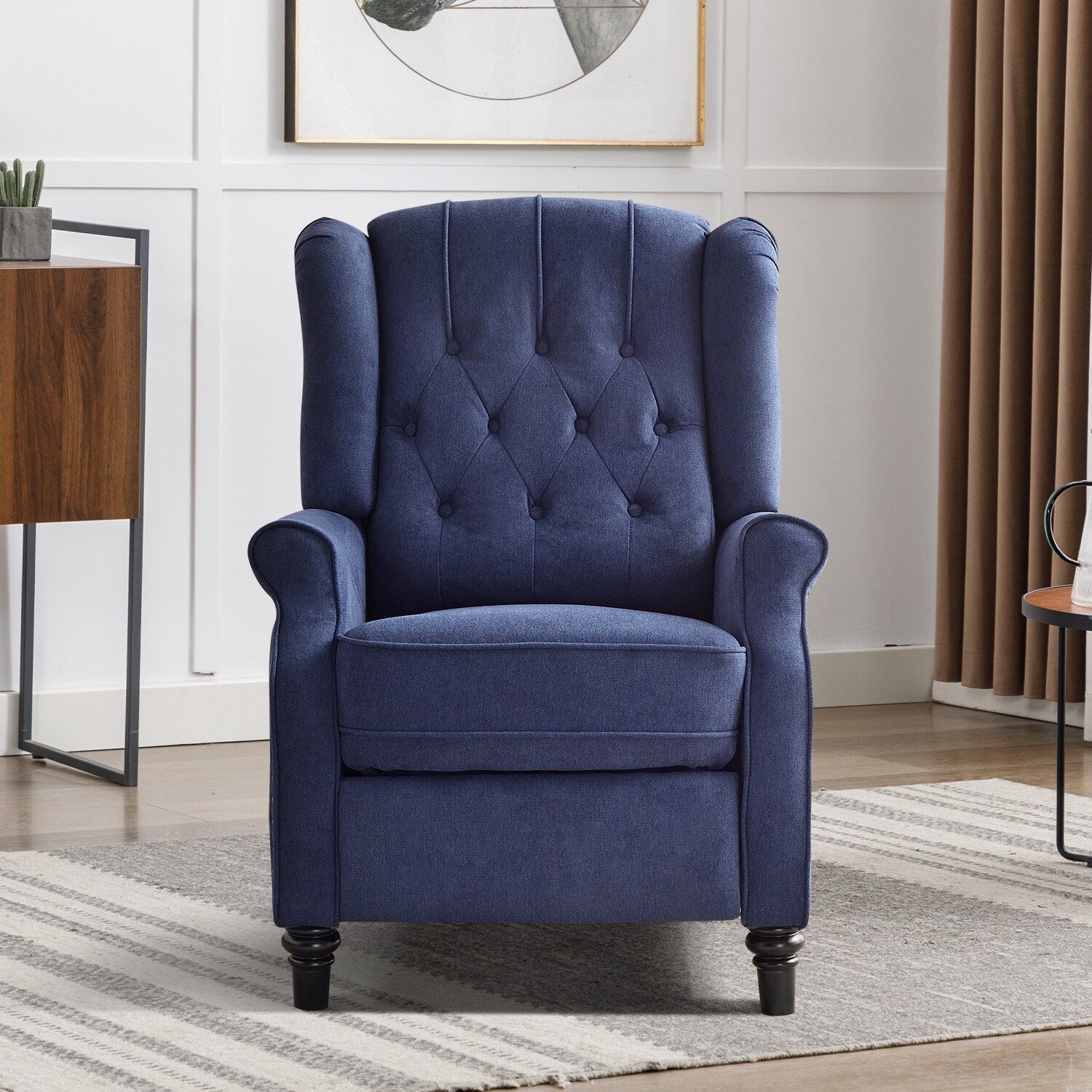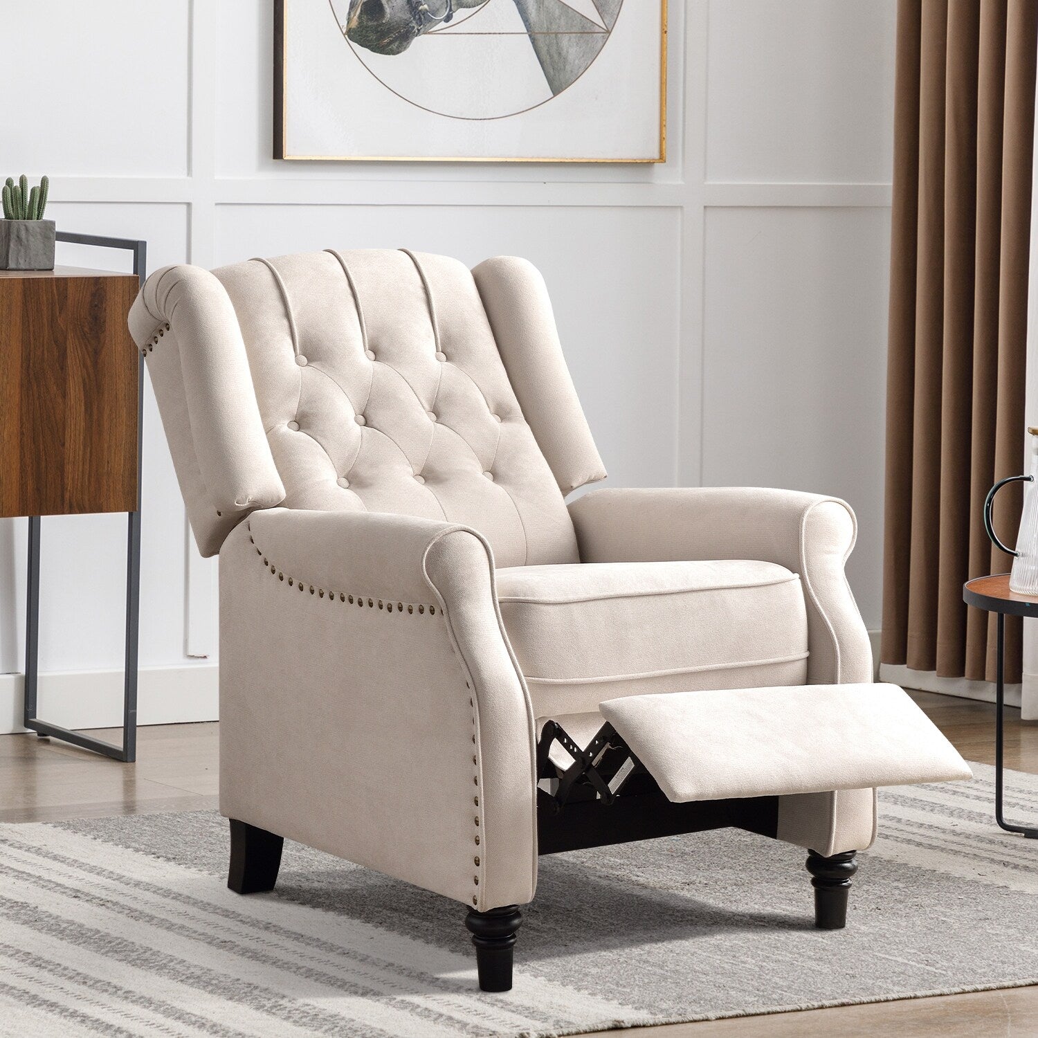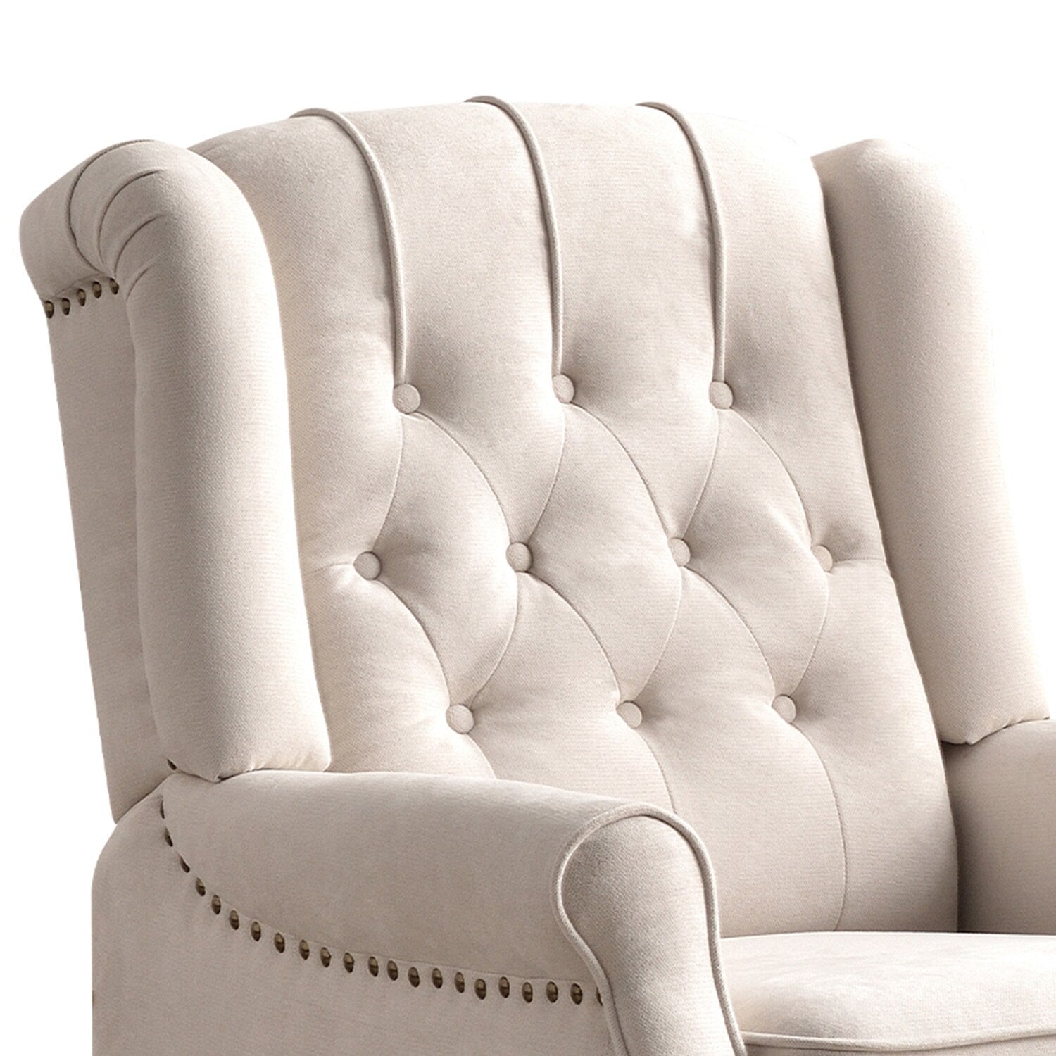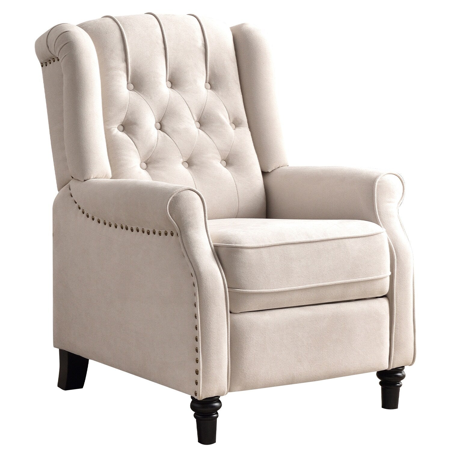Sit back and relax in the Elizabeth Recliner. to fully recline this chair, just push on arms and lean against the back of the Recliner to find your most comfortable positioning. Enjoy the highest caliber of comfort and relaxation with this classy recliner. ?With its tufted diamond design, it offers a refreshing air of sophistication to your home. Set it in your living room, office, bedroom, or sitting room. Its light beige color will complement most furniture sets.?