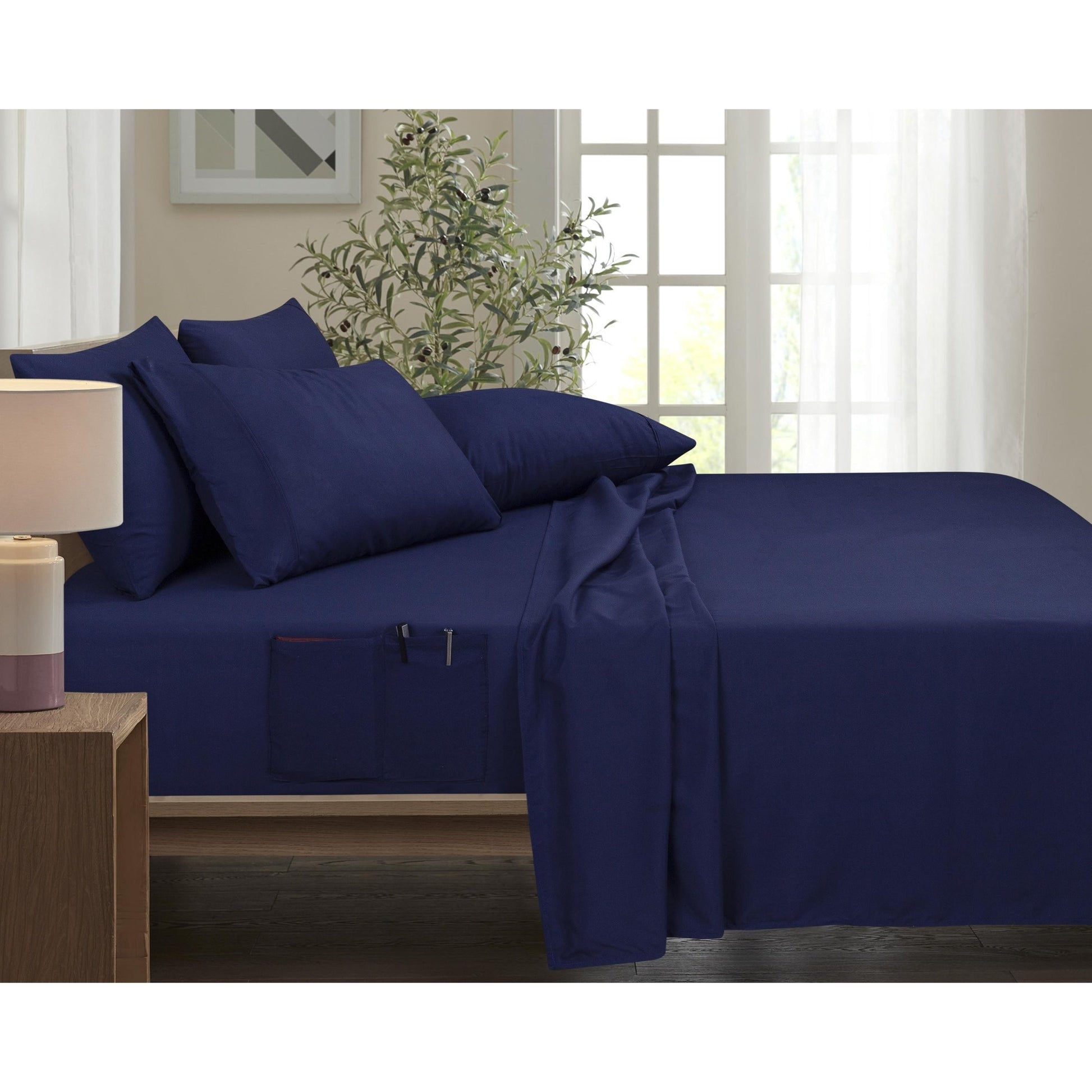Upgrade your bedding with the innovative and luxurious Smart Sheets Rayon from Bamboo 6-Piece Sheet Set designed with built-in side pockets for smart, clutter-free living. Say goodbye to messy nightstands and hello to bedside convenience. These exclusive 8' deep pockets on either side of the fitted sheet give you instant access to your phone, remote, notebook, glasses, or tissues, perfect for modern lifestyles. Crafted from a premium 60% microfiber and 40% Rayon from Bamboo blend, these sheets offer the silky softness of high-thread-count bedding with the added benefits of moisture-wicking and cooling breathability. The fabric is hypoallergenic, antibacterial, and wrinkle-resistant, making it a smart choice for allergy sufferers and busy households alike. With deep-pocket construction for mattresses up to 16 inches and durable stitching throughout, this 1800-thread-count sheet set offers long-lasting luxury and functionality in one. Ideal for master bedrooms, guest rooms, or dorms, this set makes the perfect gift or personal upgrade.