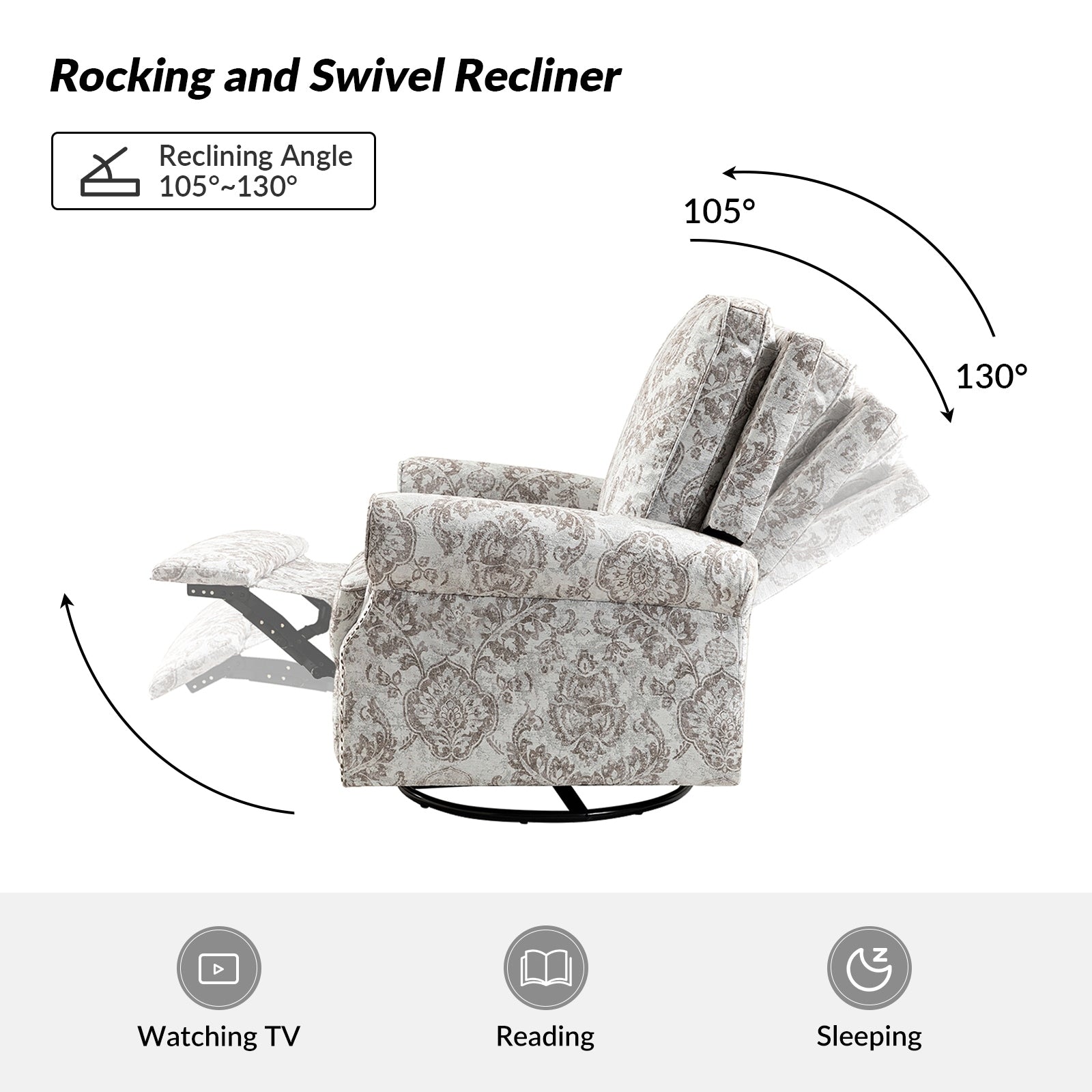 Crafted with human needs in mind, this recliner features 360° swivel motion, a gliding function, and pop-up leg rest to provide comfort for resting. Ideal for discovering the perfect position that is most comfortable for you, this recliner will quickly become your new favorite seat in the house. Constructed of soft and durable polyester fabric decorated with chic nail head trims, it offers a timeless design and can be used well for years. This recliner can be used on many occasions, such as you can sit on it in the living room to enjoy watching TV or you can put it in your study room to enjoy reading books.?