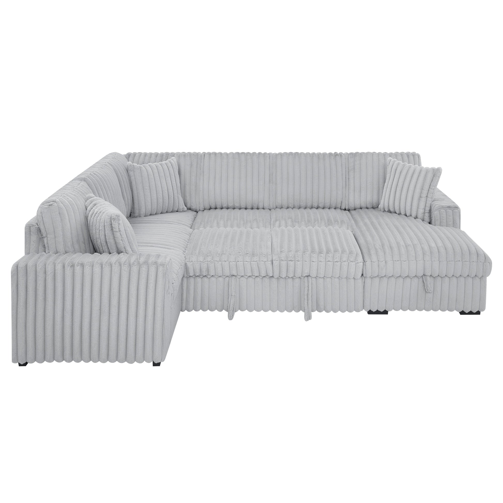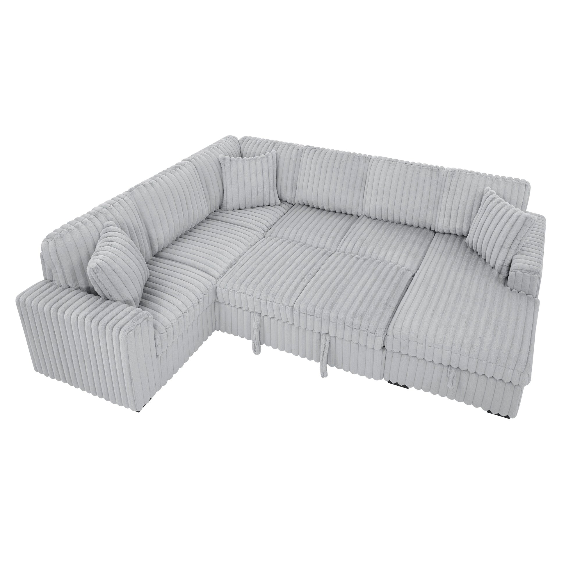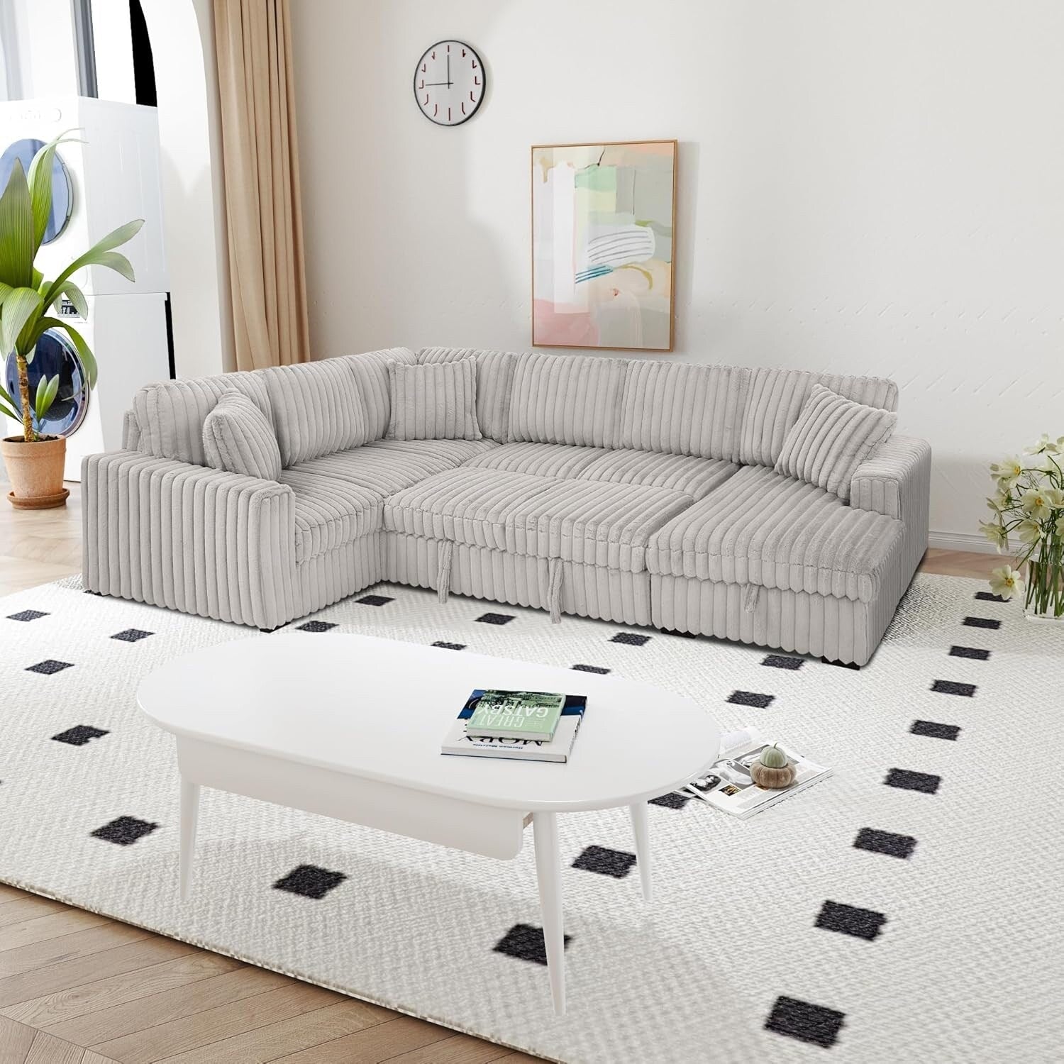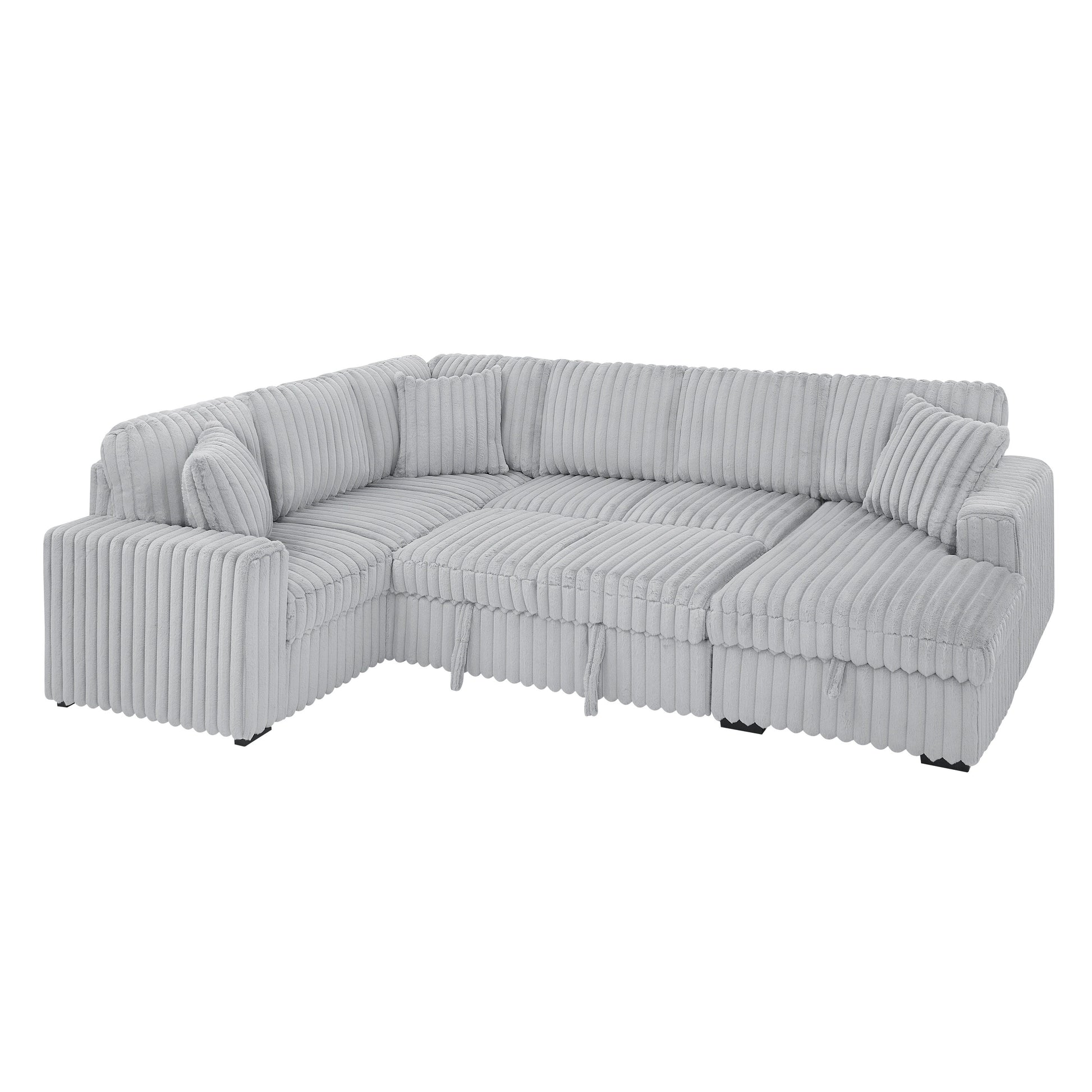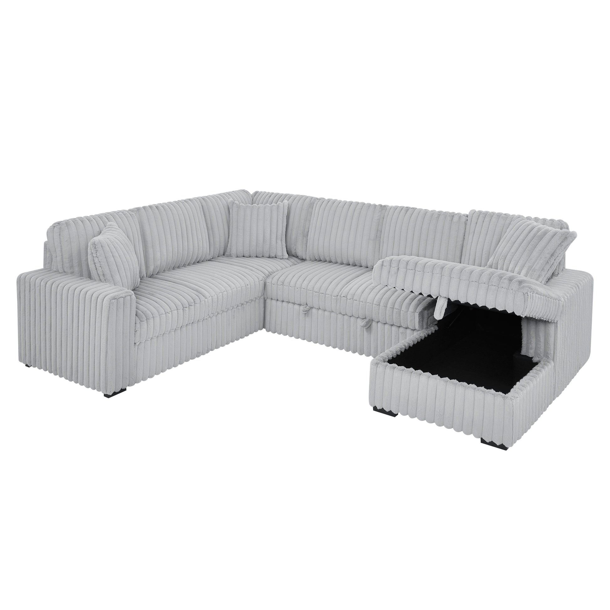 ? Product Dimension: L 122.00” x W 95.60” x H 38.60”. Weight: 386.00 lbs. ? Easy to clean and assemble with all the parts, tools and instructions included. ? This sectional sleeper sofa comprises four parts: a chaise lounge, an armless loveseat with a pull-out bed, a loveseat with arms, and a corner sofa. Easily assemble it into a U-shaped sofa or a pull-out sleeper, perfect for daily use or accommodating unexpected guests. Ideal for small spaces like apartments or living rooms. ? The sectional sofa includes a right storage chaise and a pull-out bed, making it a stylish and functional addition to any home, office, or club. Its sleek design and practical features enhance any living space, while the removable back cushions make cleaning and maintenance easy. ? Transform the sofa into a sleeper bed with ease using the hidden bed mechanism. The pull-out bed provides extra seating or sleeping space for guests, ensuring comfort and convenience for sleepovers or everyday use. Simply pull out and push in with the straps for a seamless transition. ? Enjoy ultimate relaxation with the upholstered backrest and supportive springs. The storage chaise offers a convenient space to store small items like blankets, magazines, pillows, and linens, helping you keep your living room organized and clutter-free while maintaining a comfortable seating area. ? The sectional sofa comes with detailed instructions and all necessary tools, making assembly a breeze. Spend just 15-20 minutes to put it together. Easily convert the U-shaped sectional into a full-size bed by pulling out the straps on the sofa’s edge, perfect for accommodating overnight guests. ? This sofa bed is upholstered in plush fabric, offering a soft and cozy feel. The inclusion of USB ports adds modern convenience, allowing you to charge your devices while relaxing. The combination of luxurious fabric, sturdy construction, and functional design ensures a comfortable and durable addition to your living room.