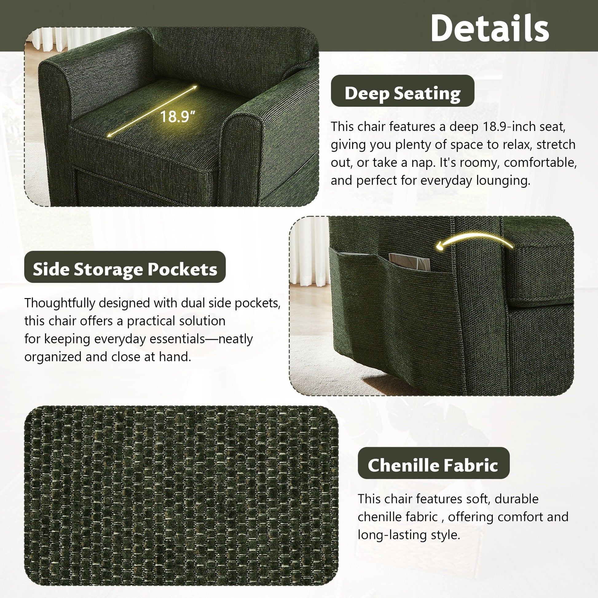 Full 360ç°?swivel base offers seamless movement in any direction?î¯erfect for multitasking, reading, or chatting without ever needing to reposition the chair.