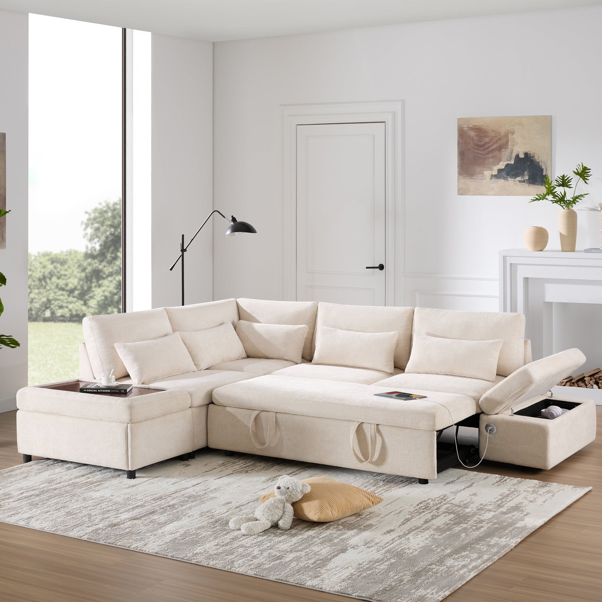 Roomfitters Modular Pull-Out Sofa with Storage Ottoman, L-Shaped Oversized Chenille Sectional for Apartment
