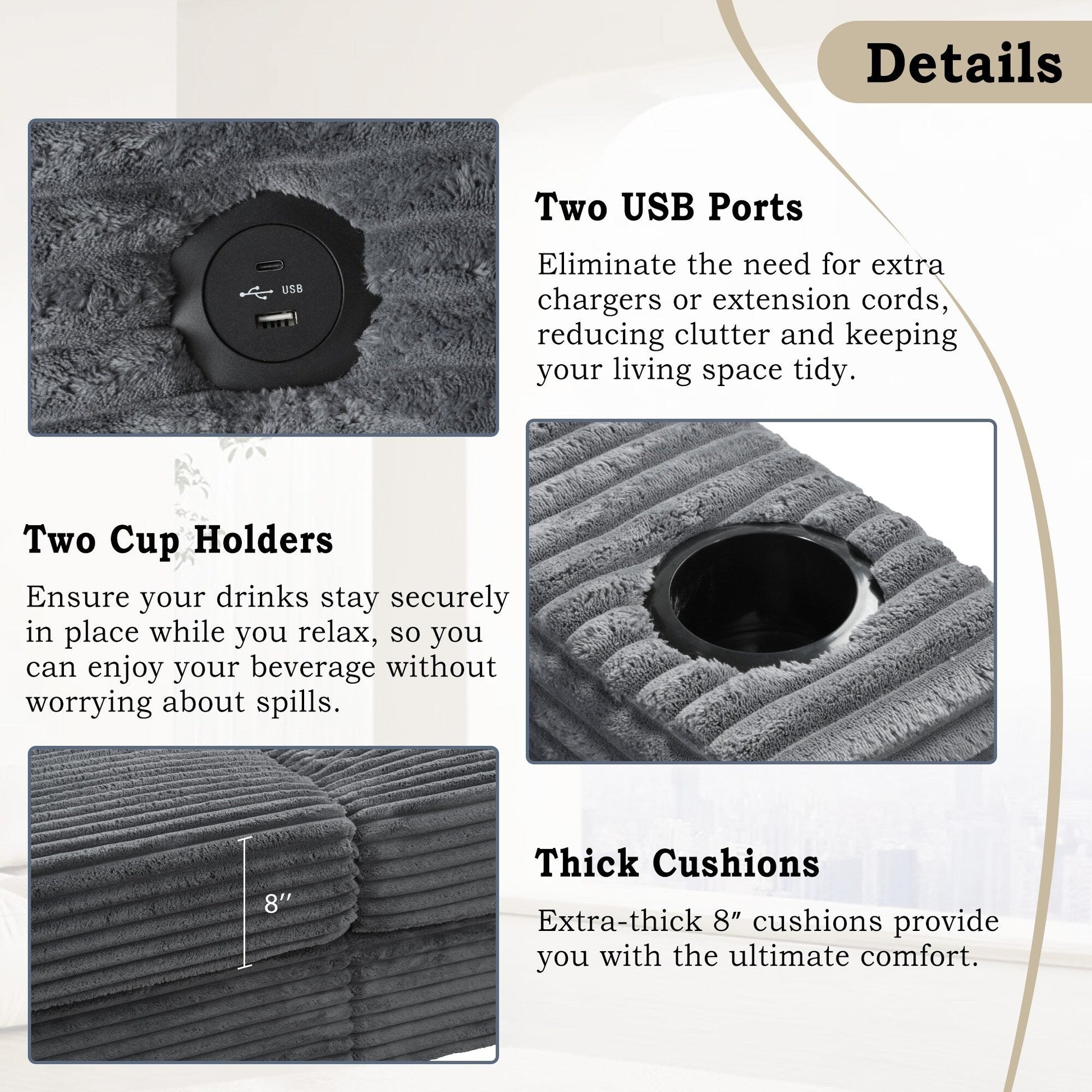 USB Charging Ports: Stay connected with two built-in USB ports, allowing you to charge your devices conveniently while lounging without extra cords or clutter.