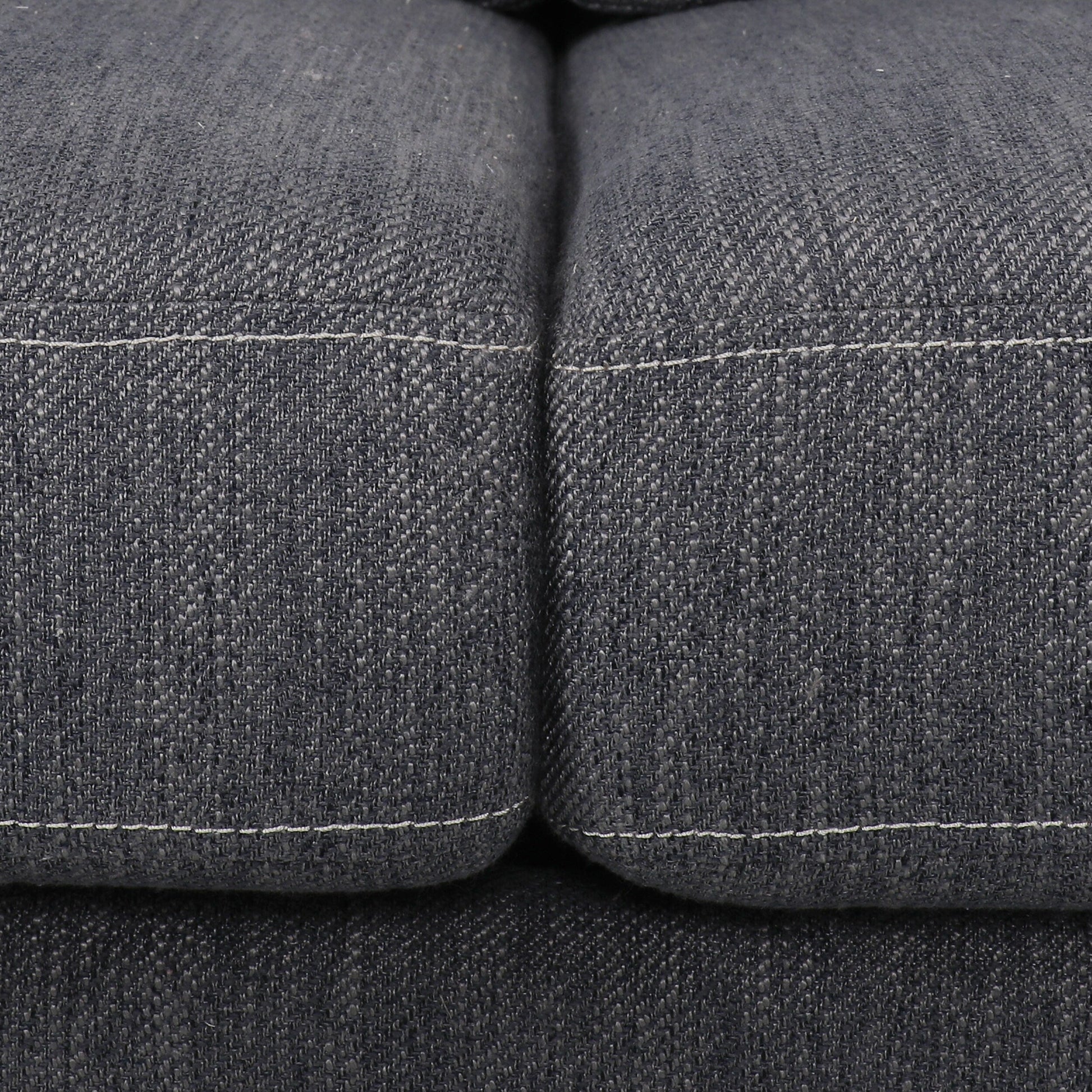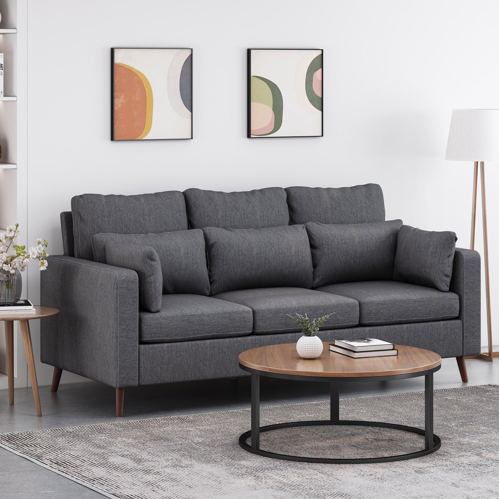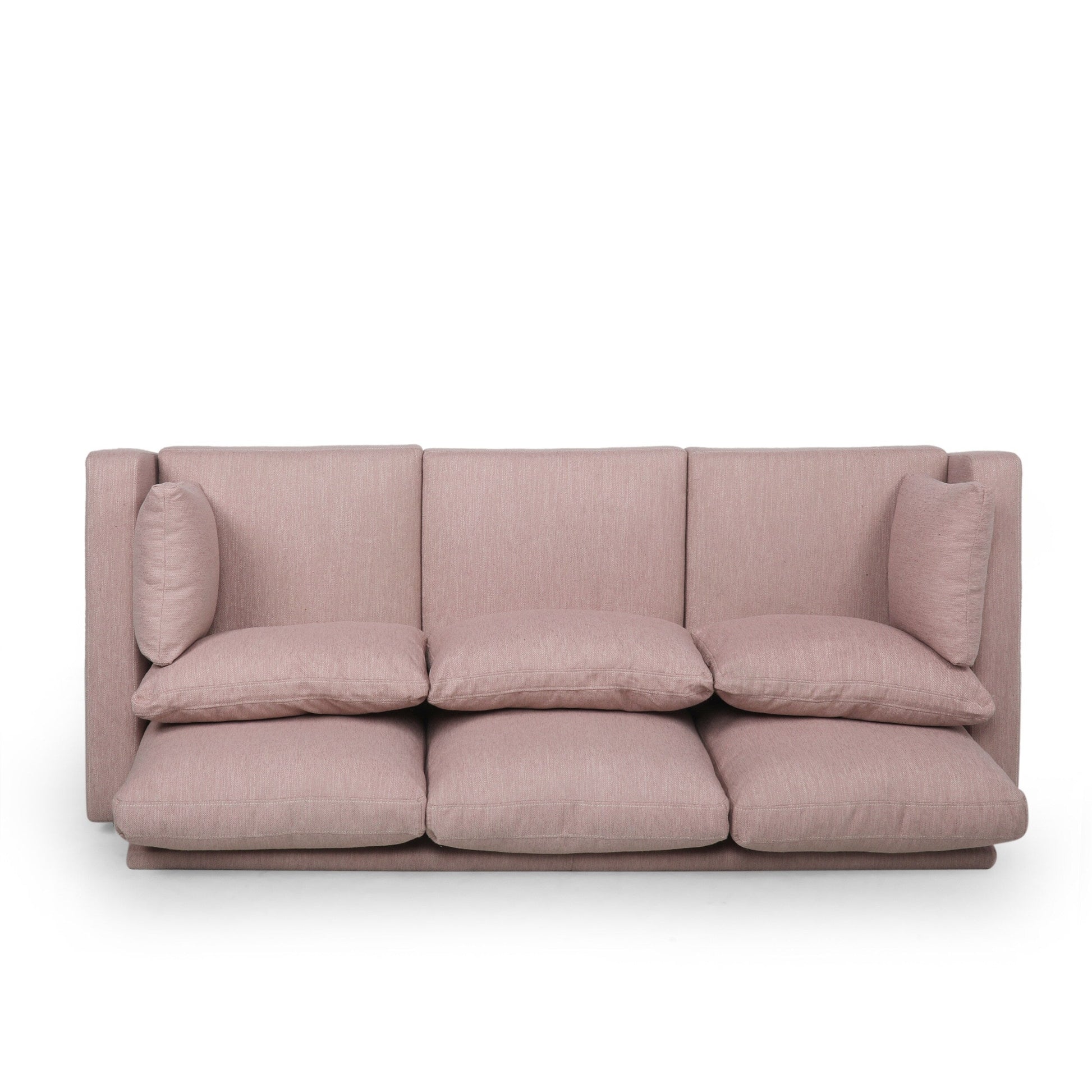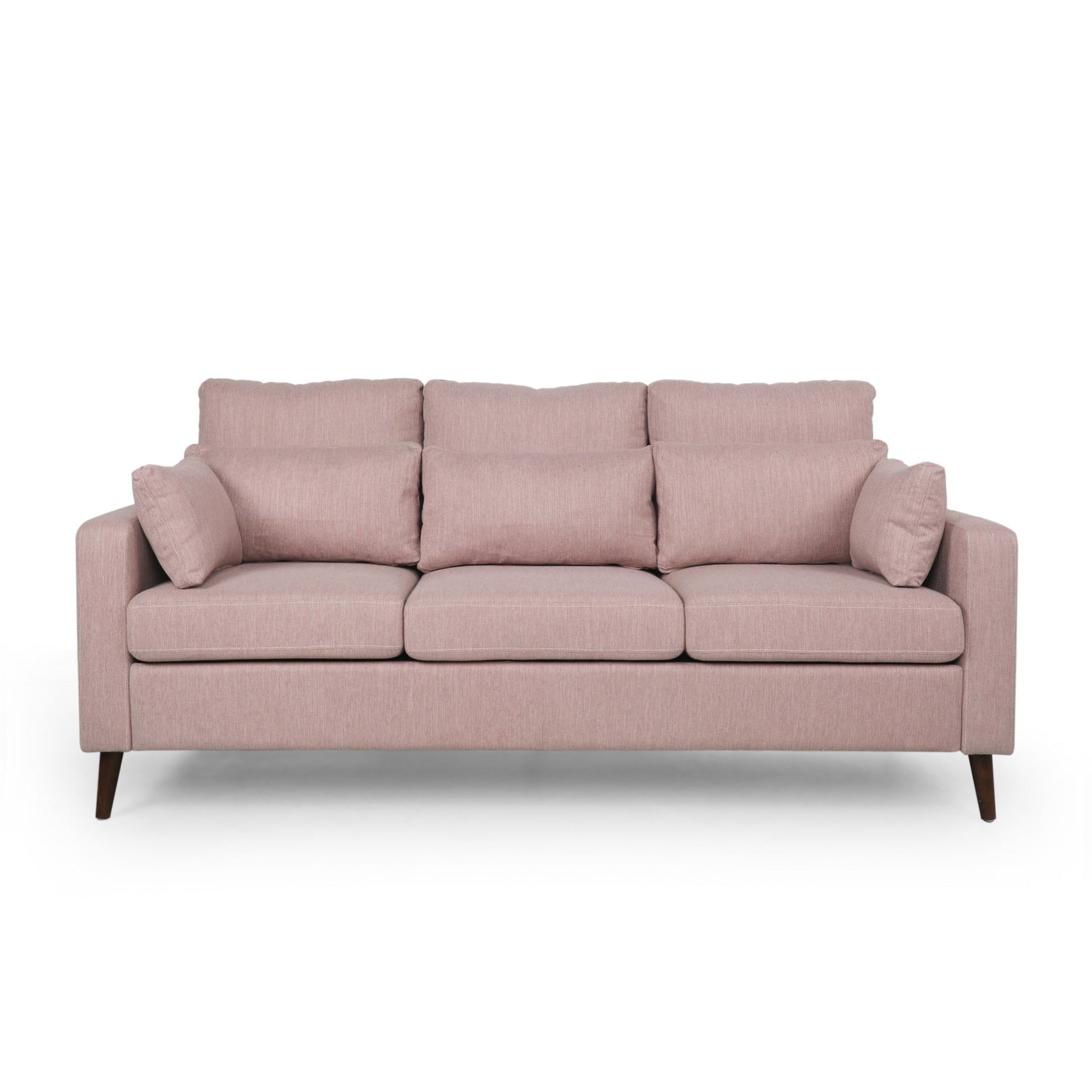 This dazzling three-seat sofa adds a touch of sophistication to your space. The sofa features an eye-catching design with track arms, tapered birch wood legs, and plump cushions with accent pillows. Smooth upholstery, available in your choice of light blush or charcoal, completes the look.