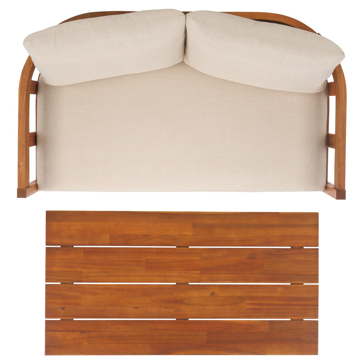 Revamp your outdoor oasis with the Owen Bench + Table Outdoor set. Experience the inviting blend of natural frame with taupe cushion as they exude understated elegance to your alfresco settings. The flawless fusion of Acacia wood, foam, and fabric creates a sophisticated style that holds up beautifully against varying weather conditions. Feel the smooth surface of the natural material under your fingertips as you enjoy blissful and comfortable moments under the sun or stars. Adding this bench and table set to your outdoor sanctuary would make it an inviting place for family and friends to gather. The Owen Bench + Table set showcases craftsmanship at its subtlest but most profound, elevating your outdoor living with its elegant and timeless design.Chair: 51.96-inch W x 29.72-inch D x 25-inch HTable: 41.92-inch W x22-inch D x 12.6-inch H