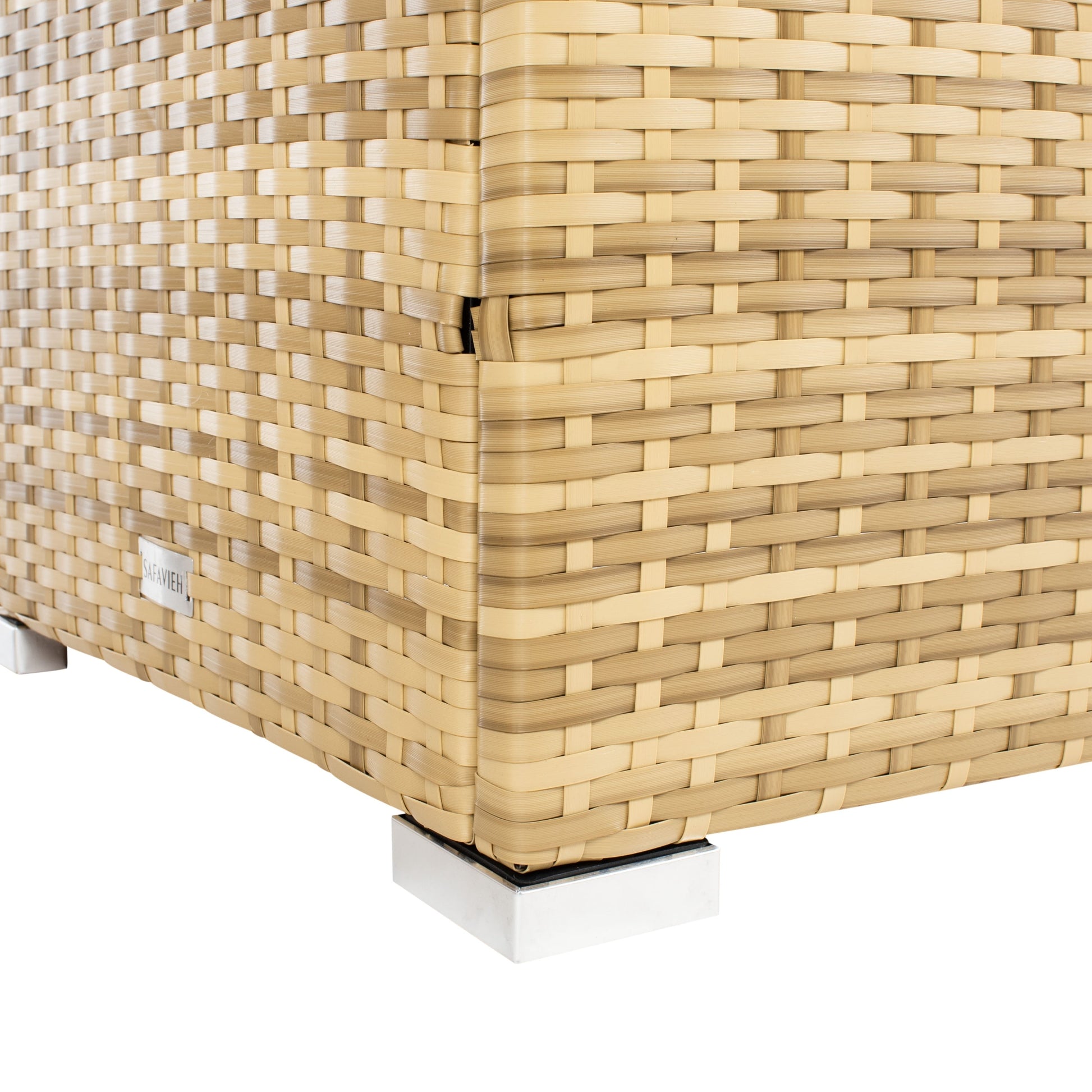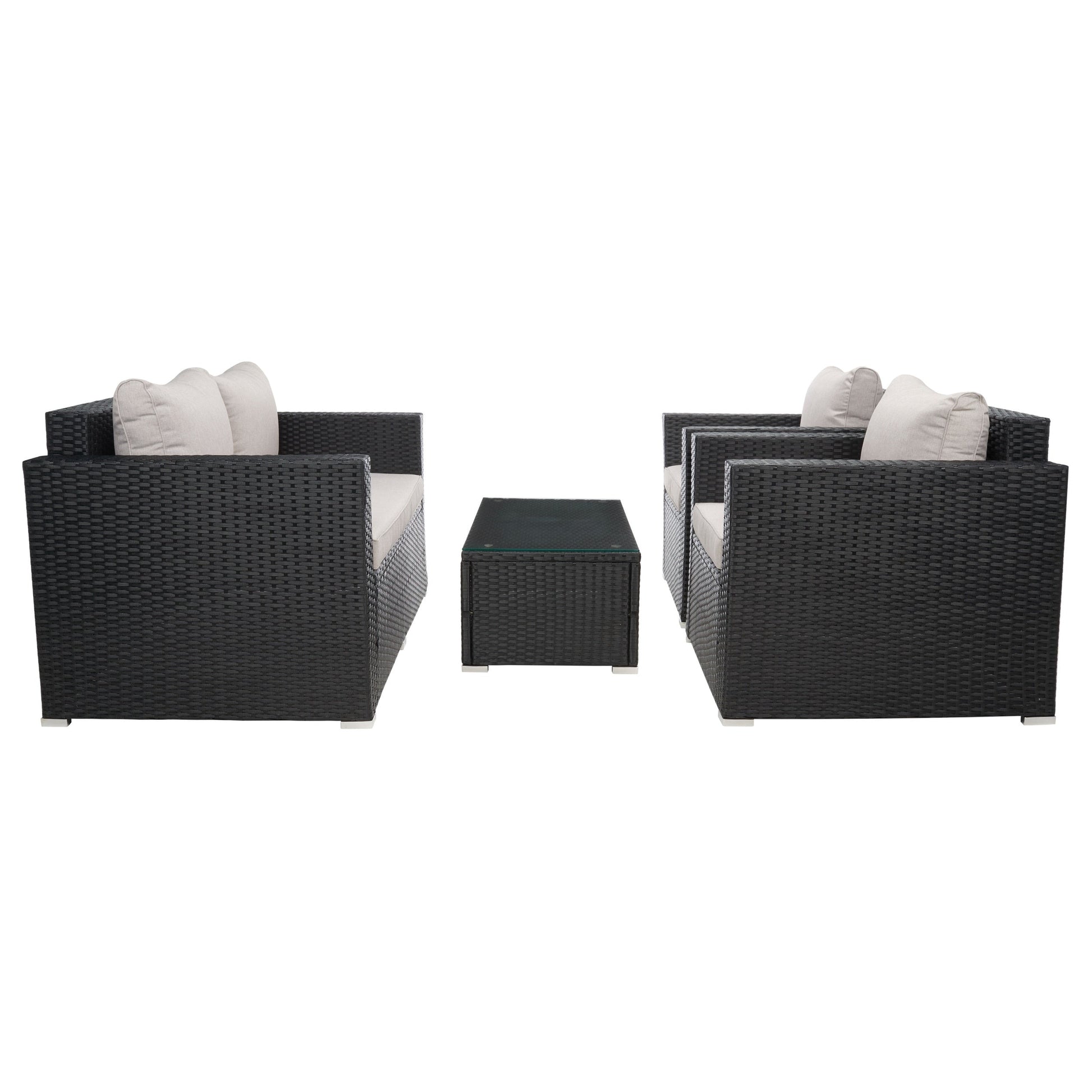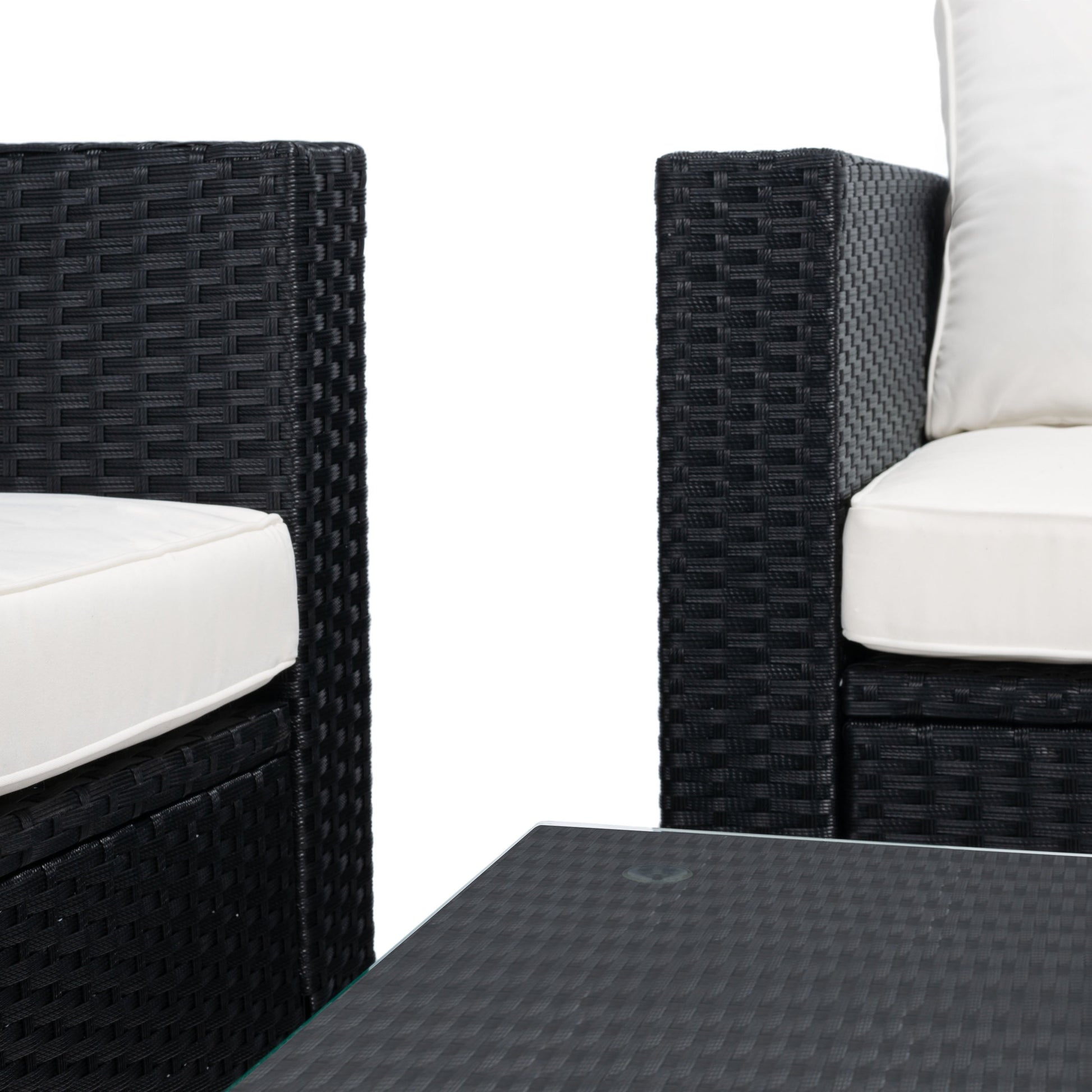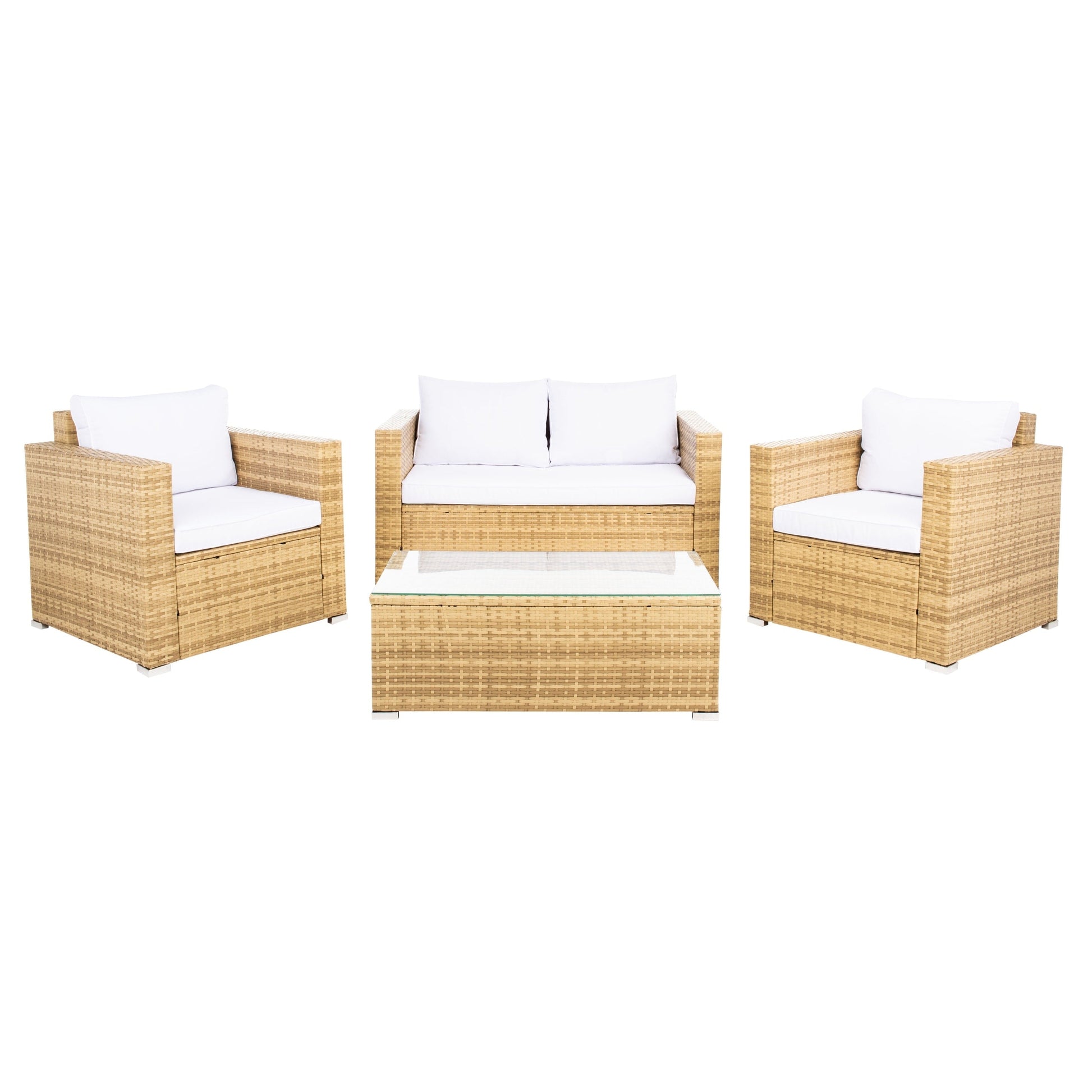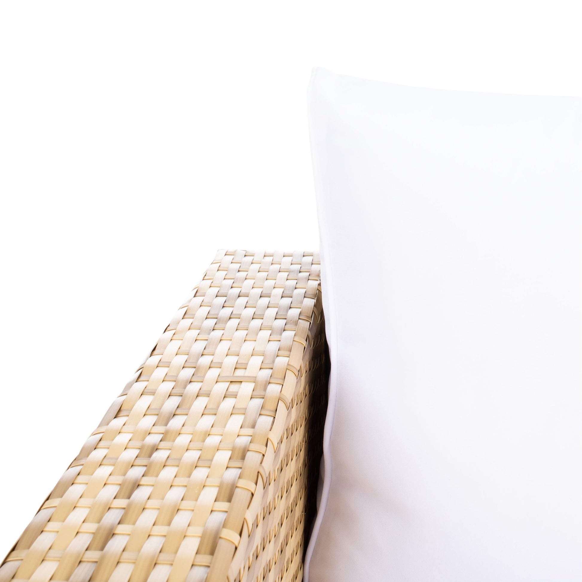 This Living Set perfectly pairs clean lined geometry with rich, flowing texture, elevating your outdoor decor to new heights of sophistication. Machie's woven frames are beautifully juxtaposed with plush beige cushions, and its glass topped coffee table provides ample room for drinks or tapas.