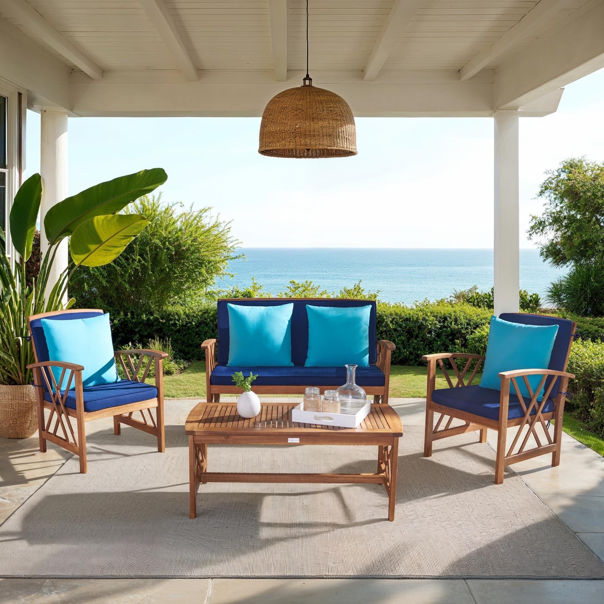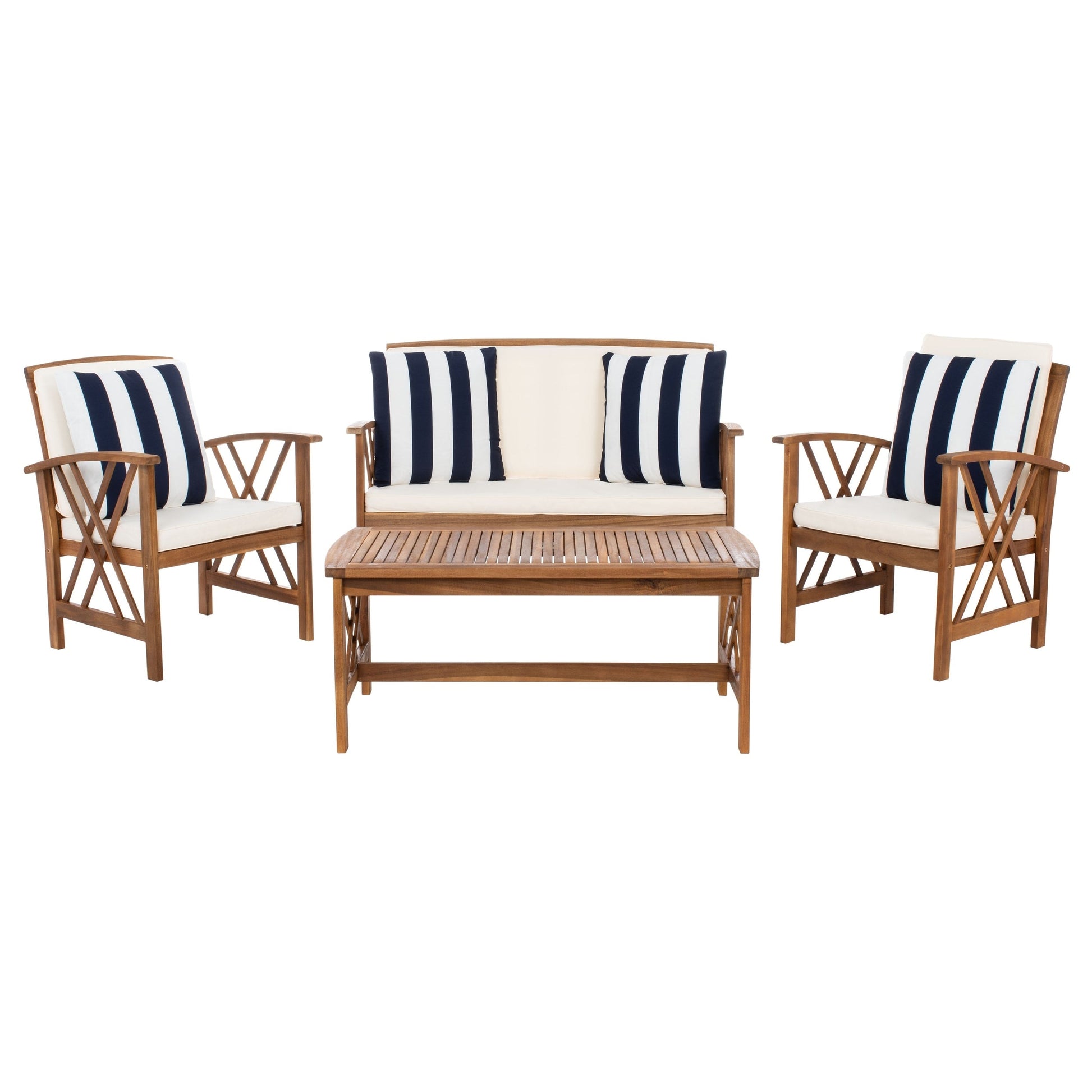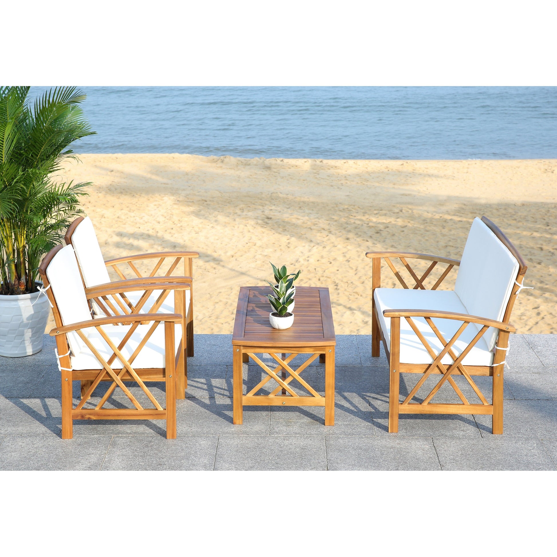 A distinctive double X motif adorns the sides of the 4 piece outdoor living set for a luxe transitional look. Masterfully crafted of sustainable acacia wood in a finish, the set comes with beige all weather seat and back cushions.