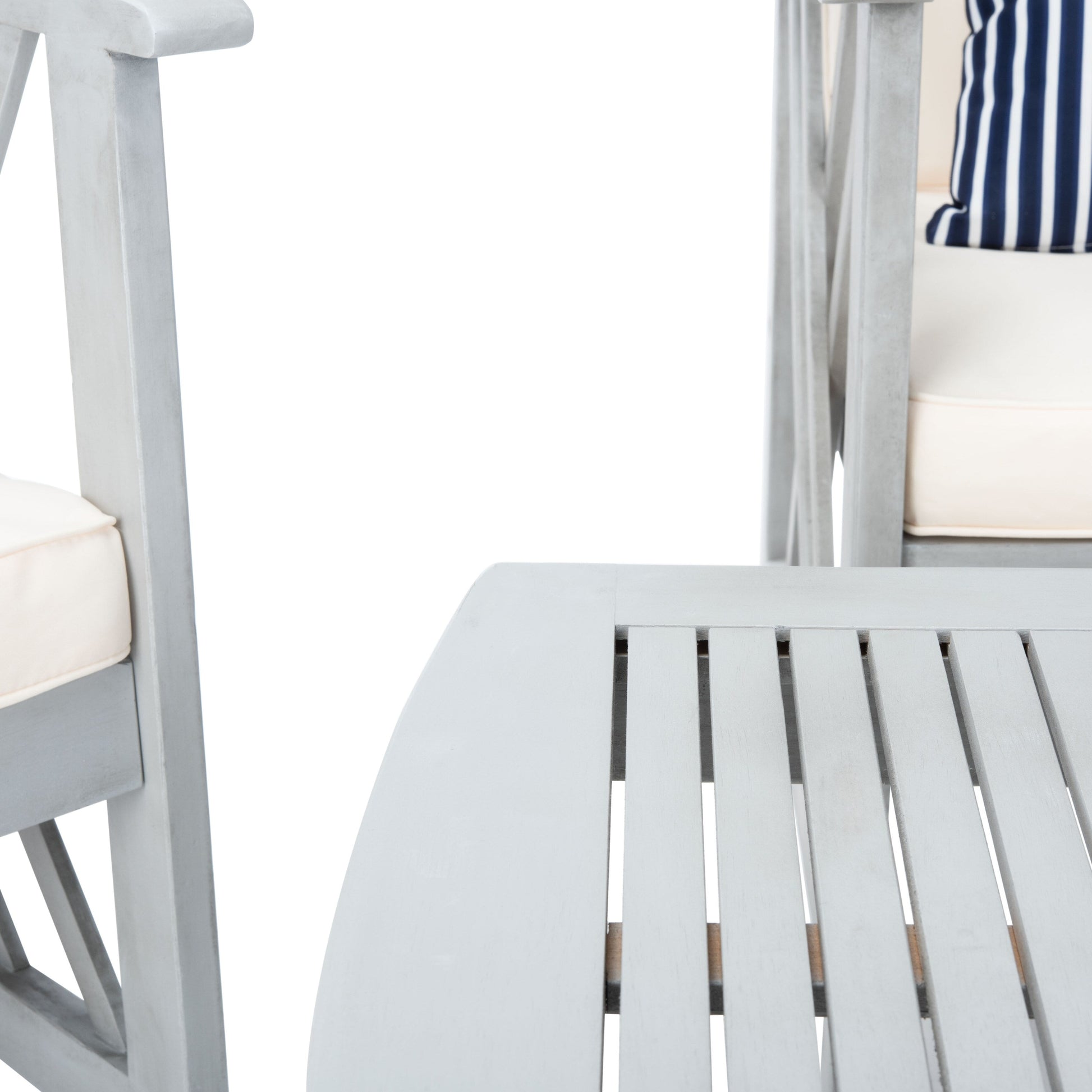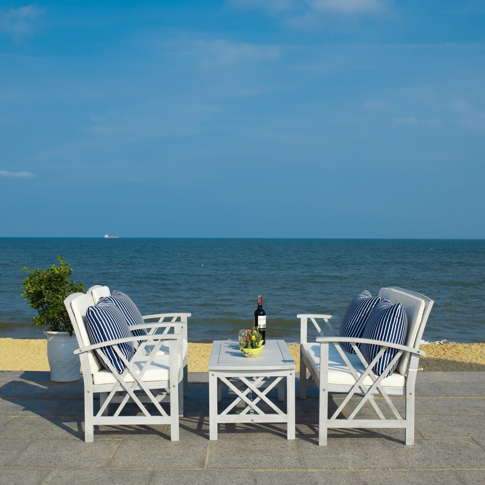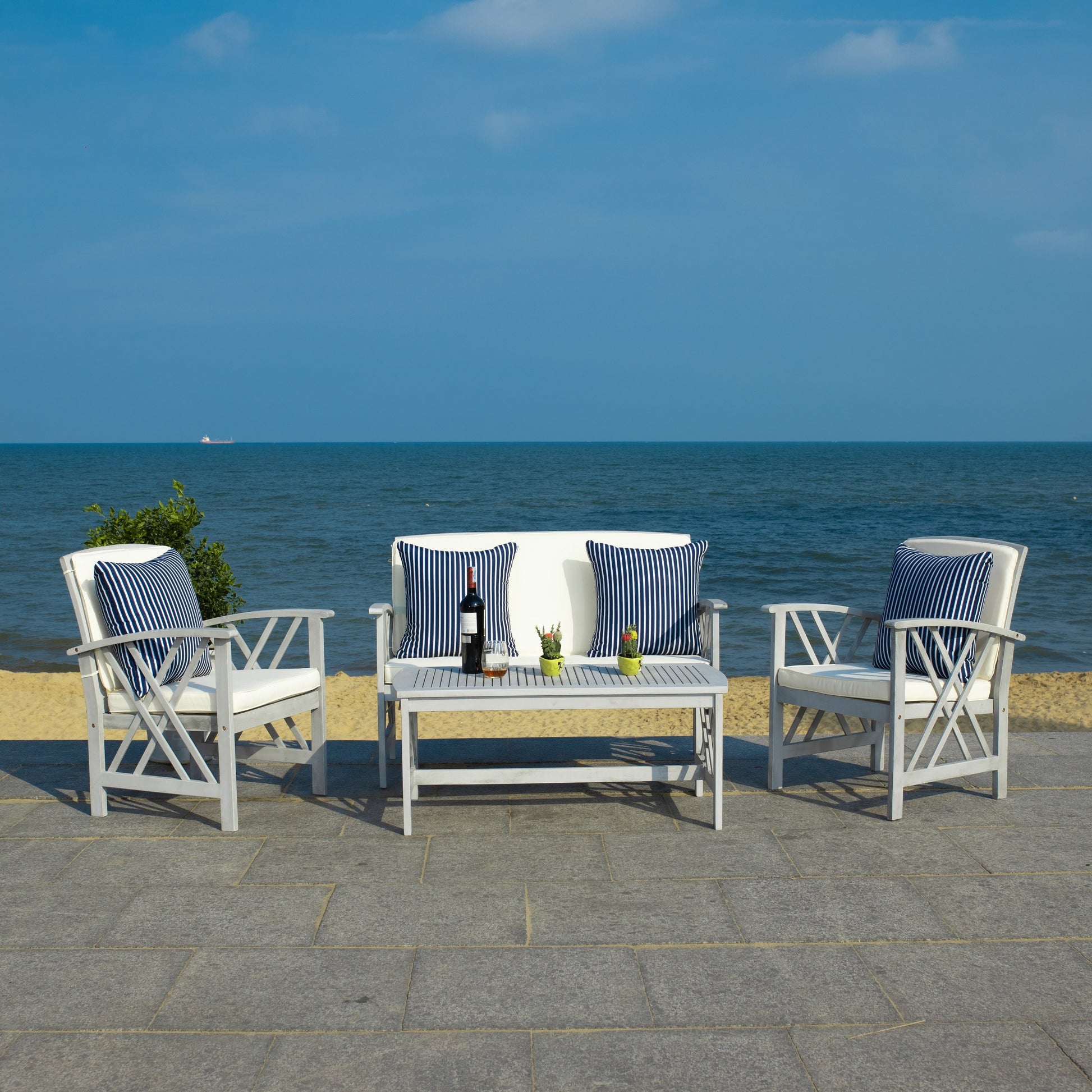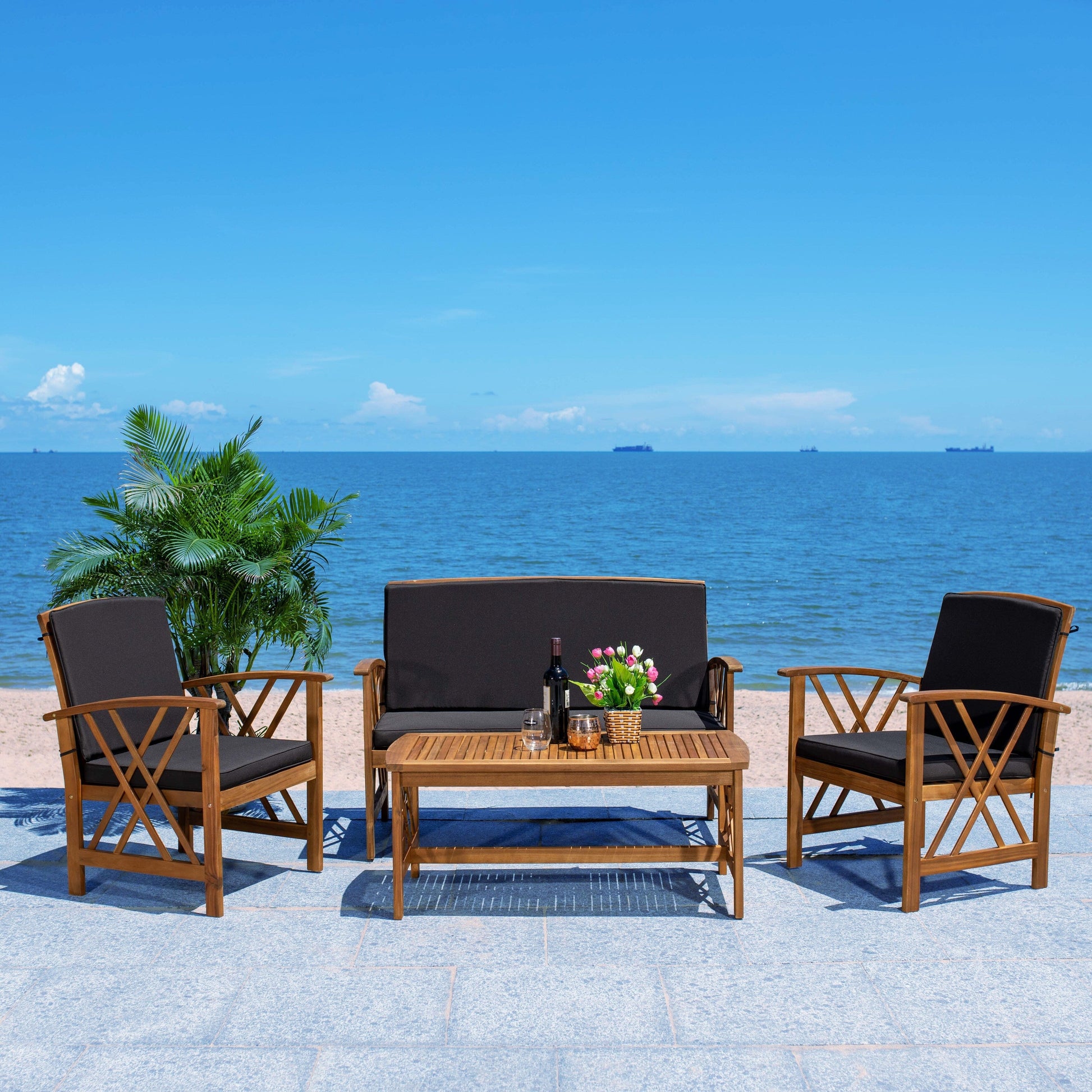A distinctive double X motif adorns the sides of the 4 piece outdoor living set for a luxe transitional look. Masterfully crafted of sustainable acacia wood in a finish, the set comes with beige all weather seat and back cushions.