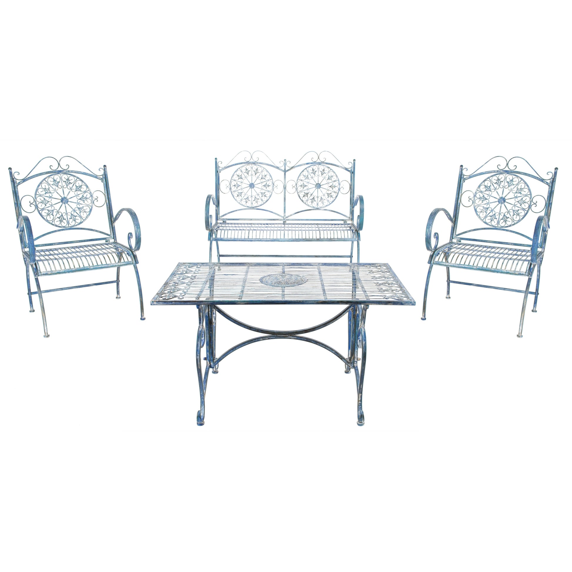The intricately detailed iron scrolls and subtle heart shaped accents of this filigreed Set brims with romantic Victorian charm. Finished in , this piece's elegant loveseat, two chairs, and coffee table ensure hours of fine outdoor entertaining.