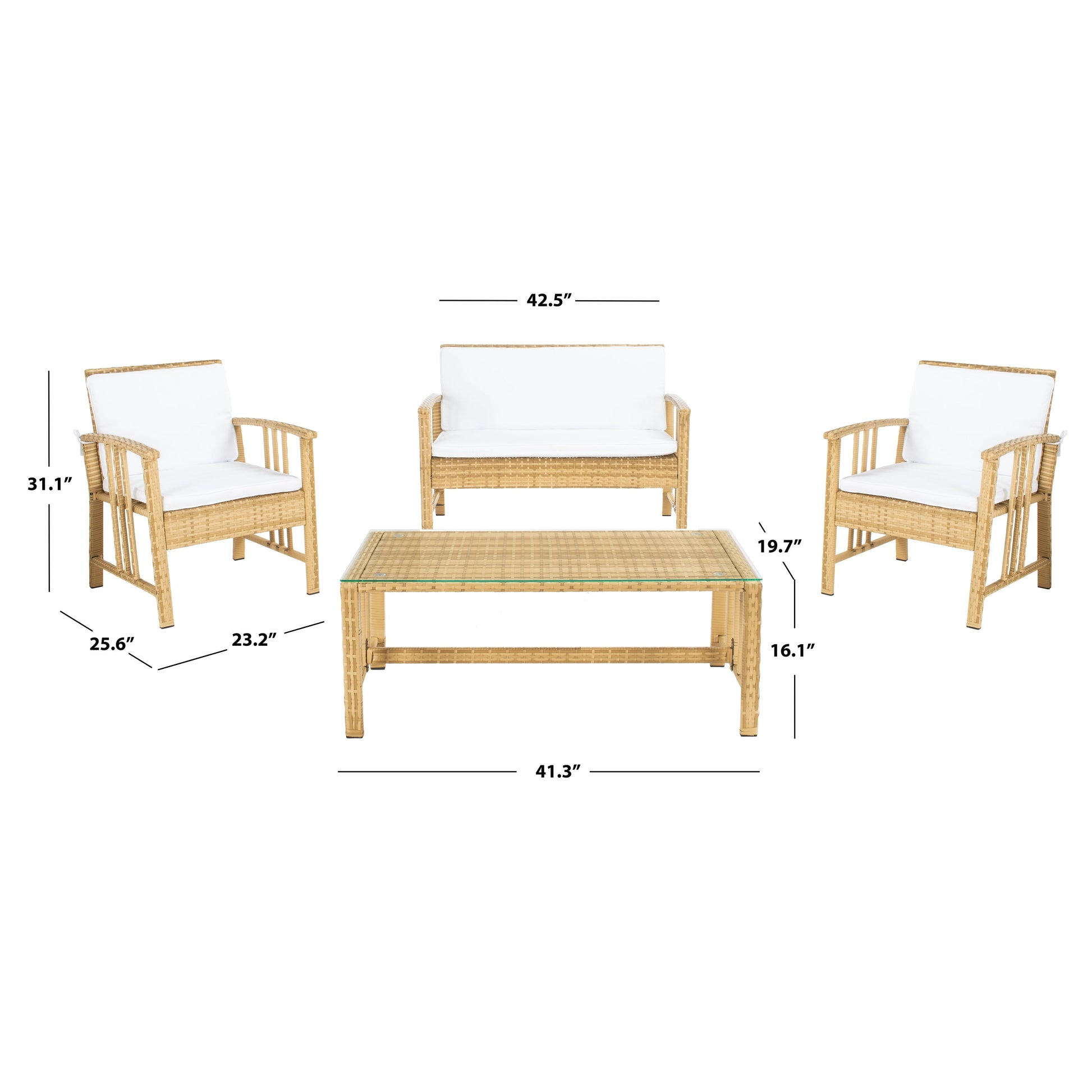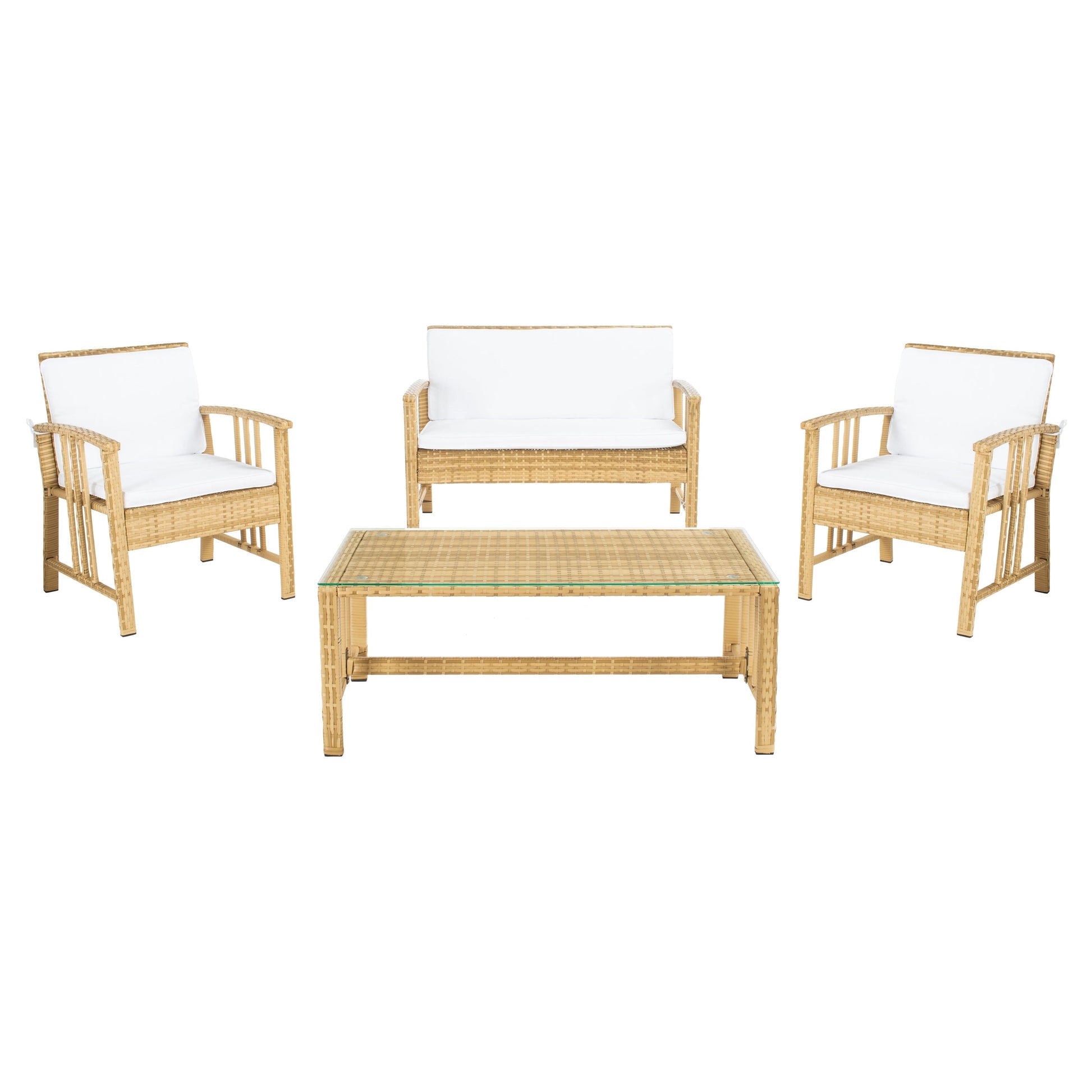 Bring the beauty of the outdoors to your patio with the SAFAVIEH Outdoor Reslor 4-Piece Wicker Living Set. The woven wicker frames and plush, white cushions create a comfortable and inviting atmosphere for relaxation or entertaining. This set includes two armchairs, a loveseat, and a glass-topped coffee table, that are perfect for outdoor spaces of any size. Assembly is required, and this set comes in a variety of color options to suit any style.
