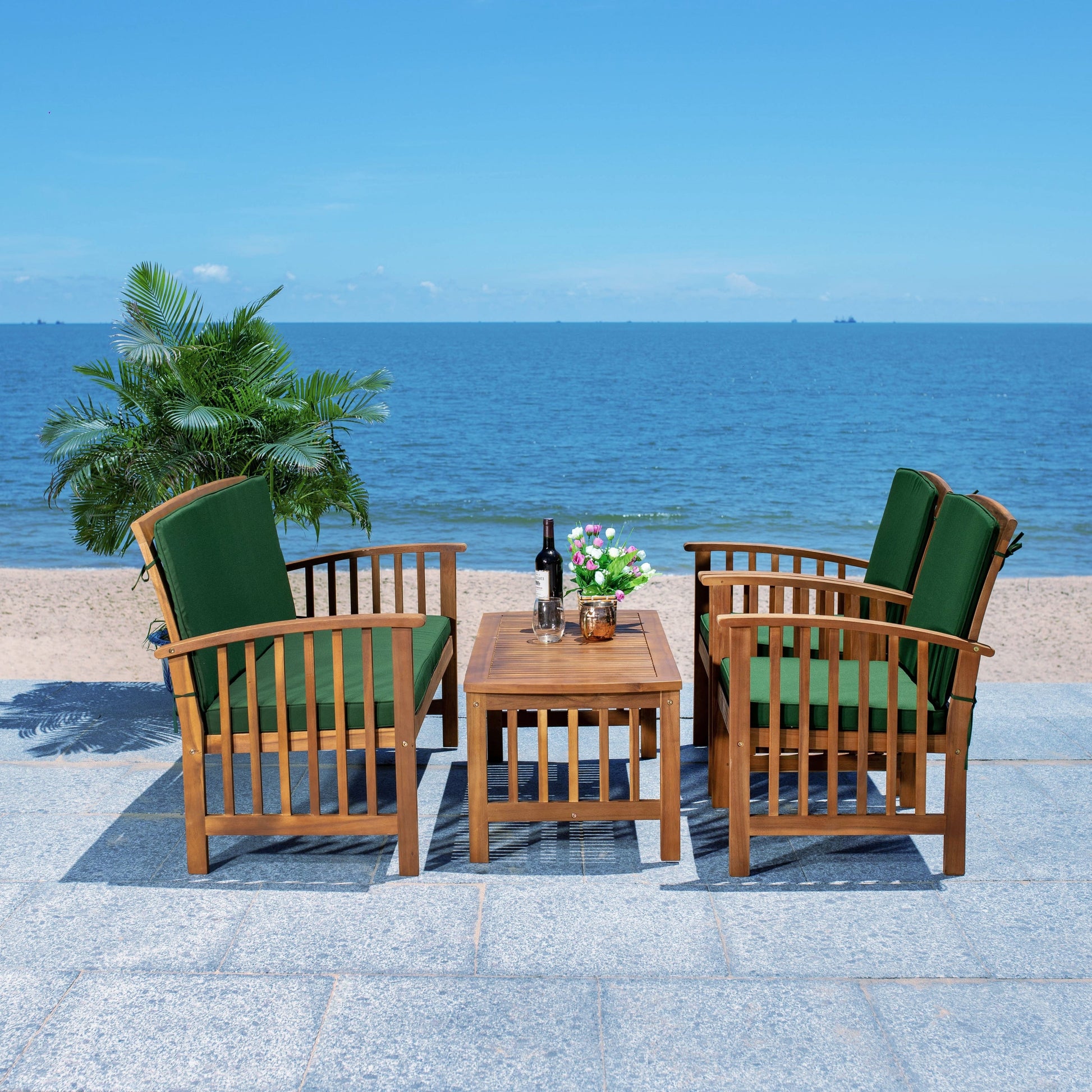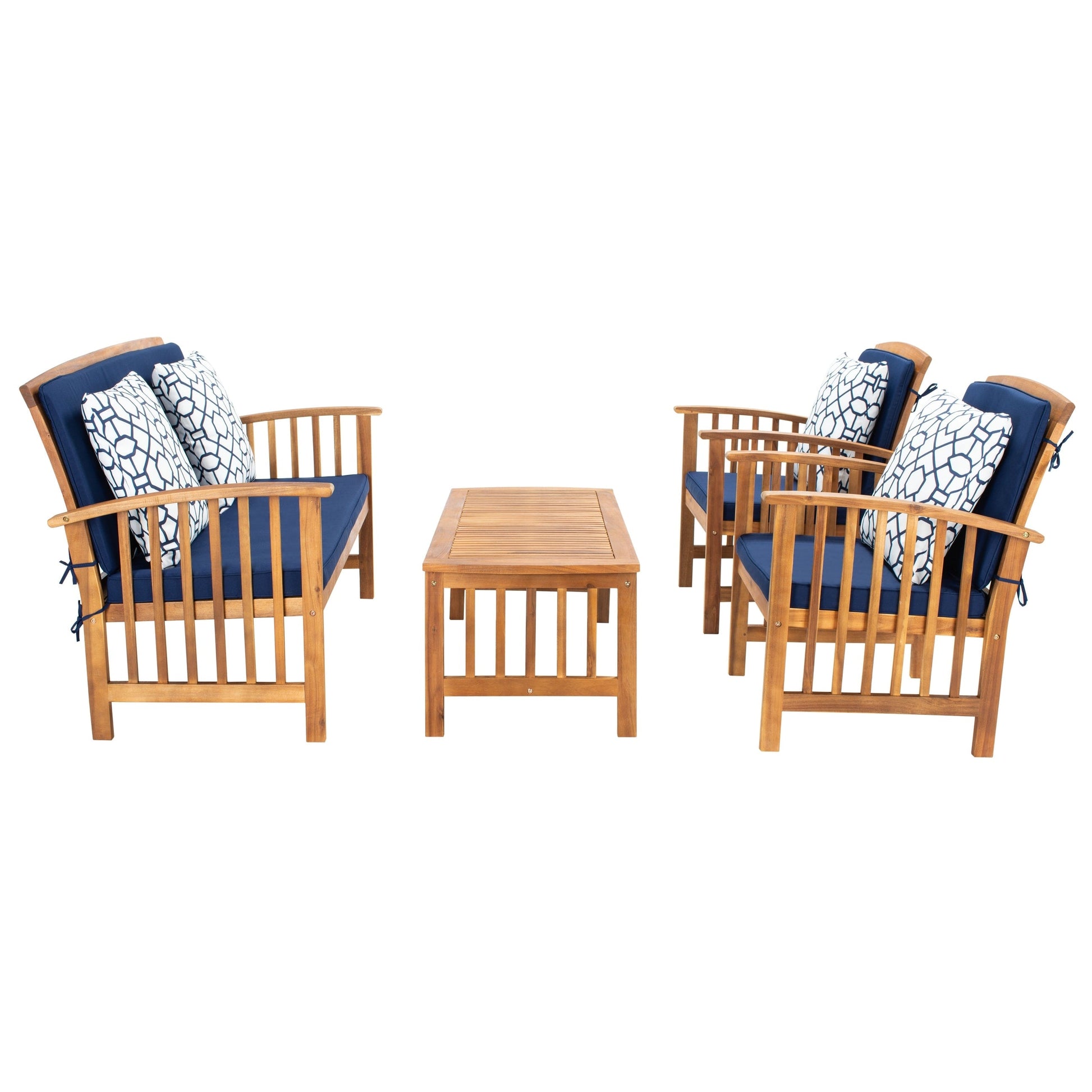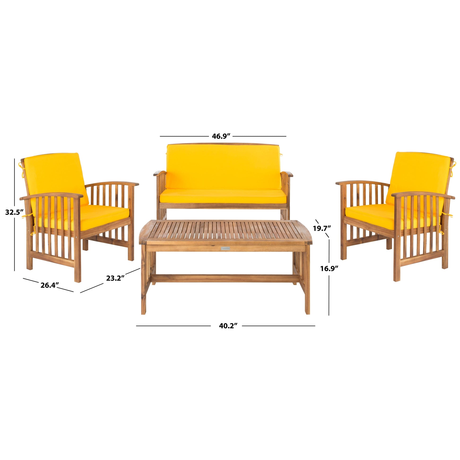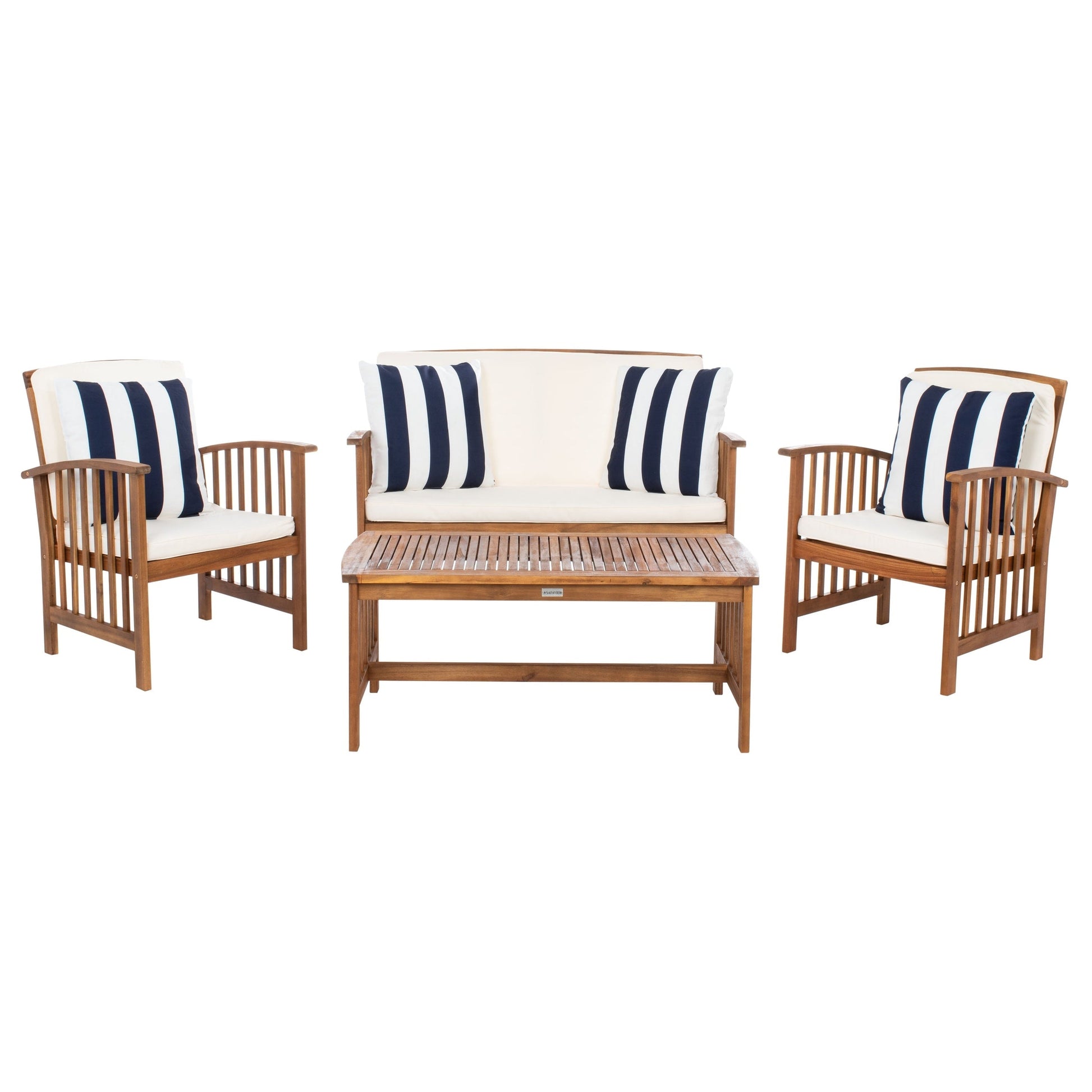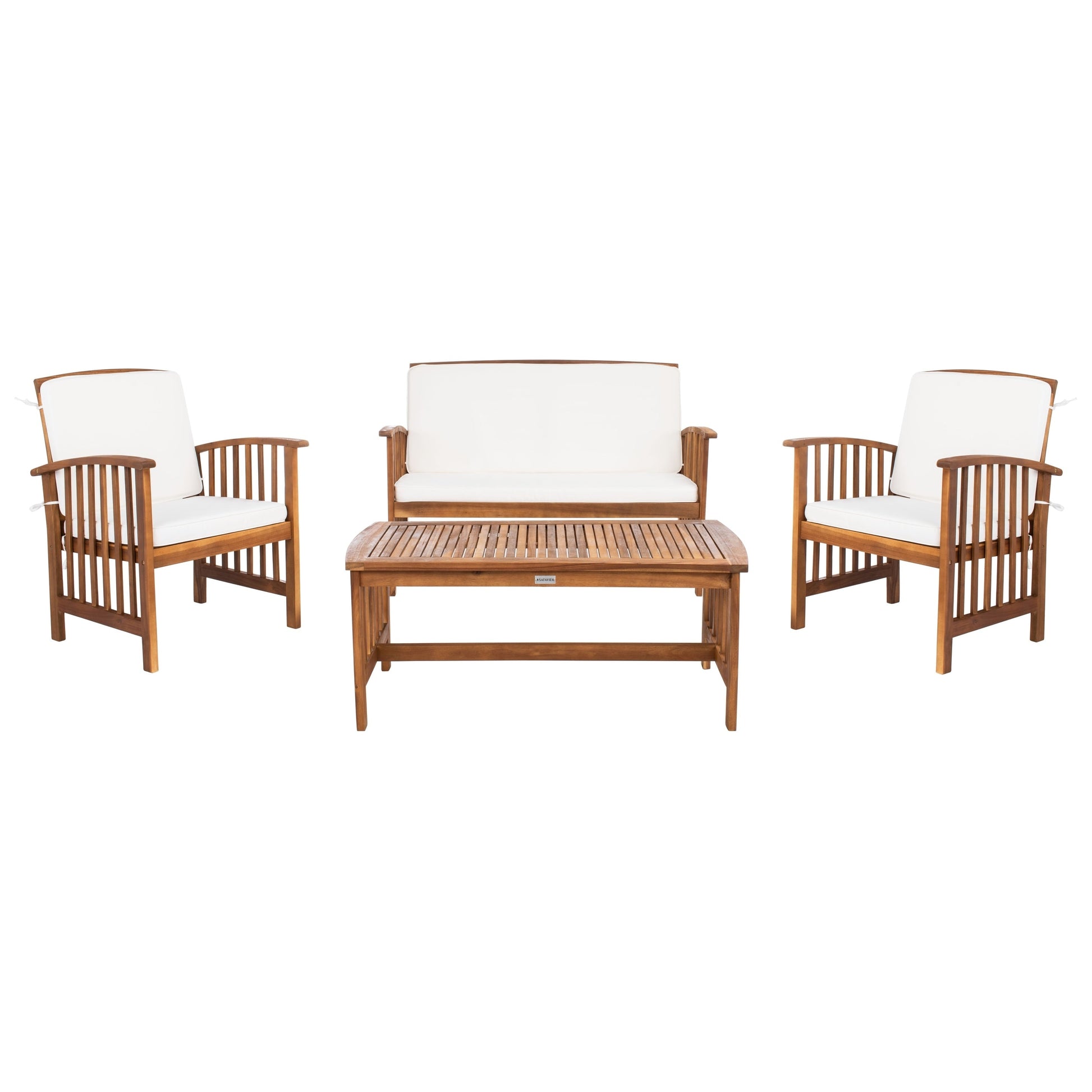 The open and airy design of the 4 piece outdoor set combines form and function. The slatted silhouette aids rain drainage while creating chic contemporary forms. The set is crafted of acacia in a brown finish with beige all weather cushions.
