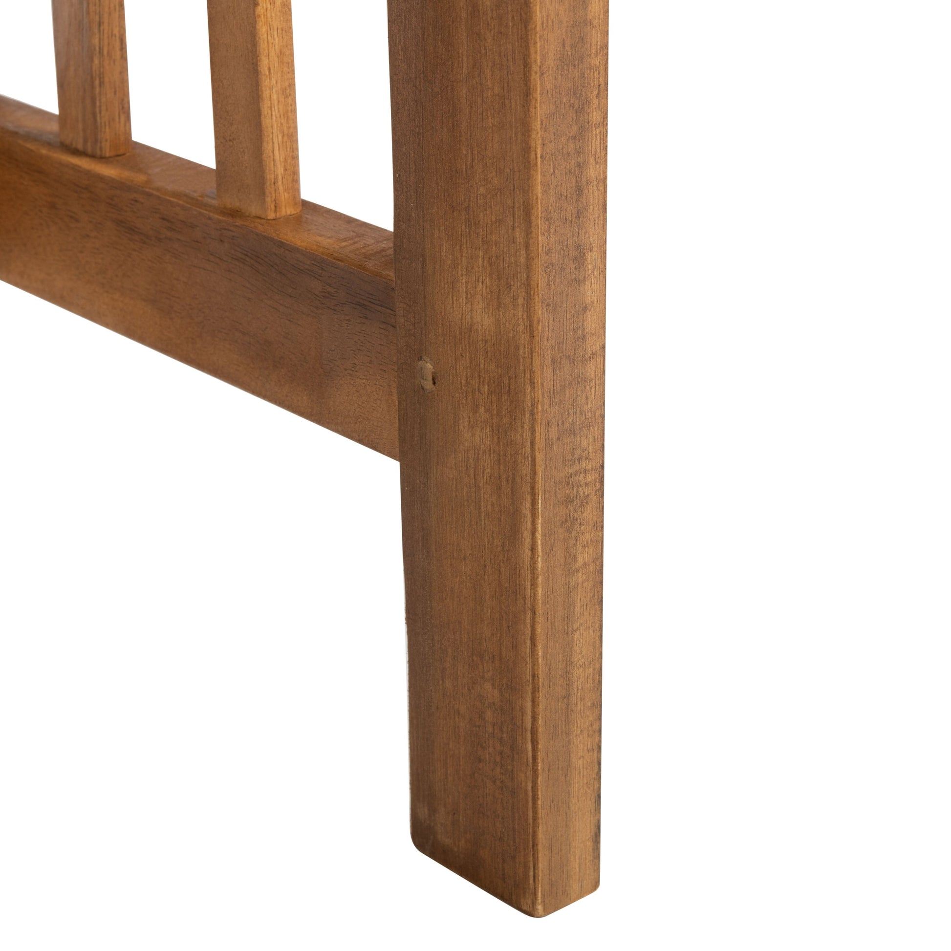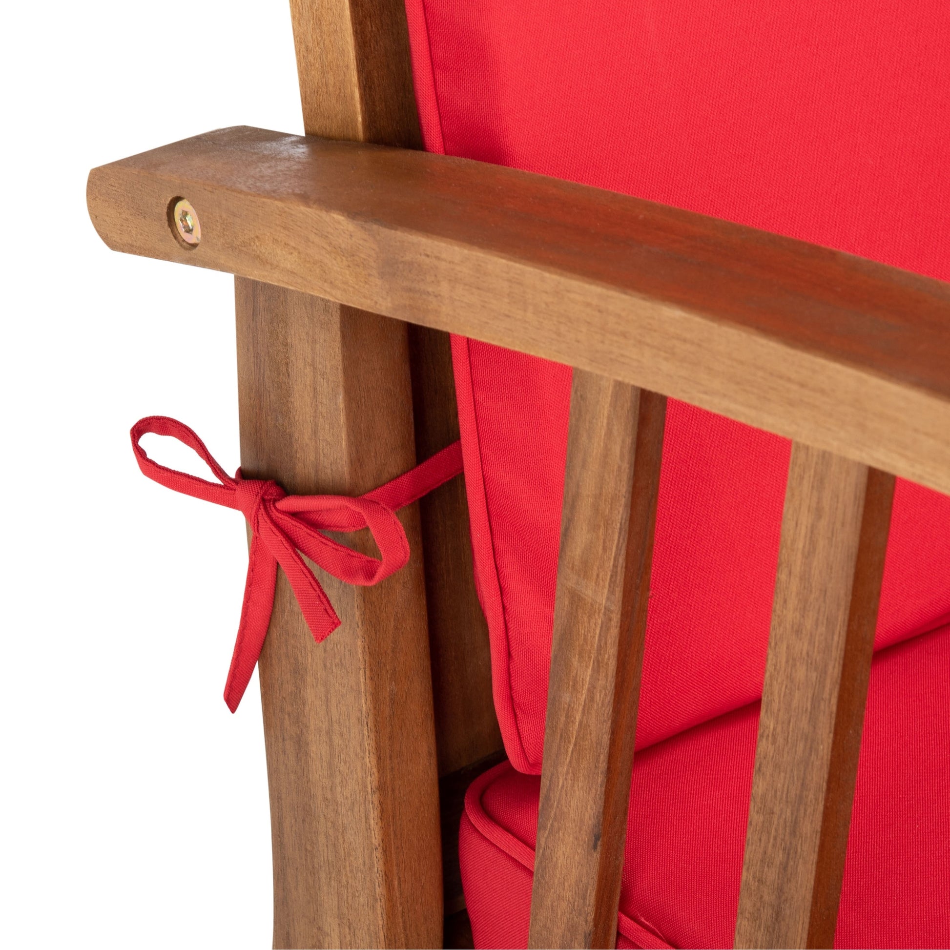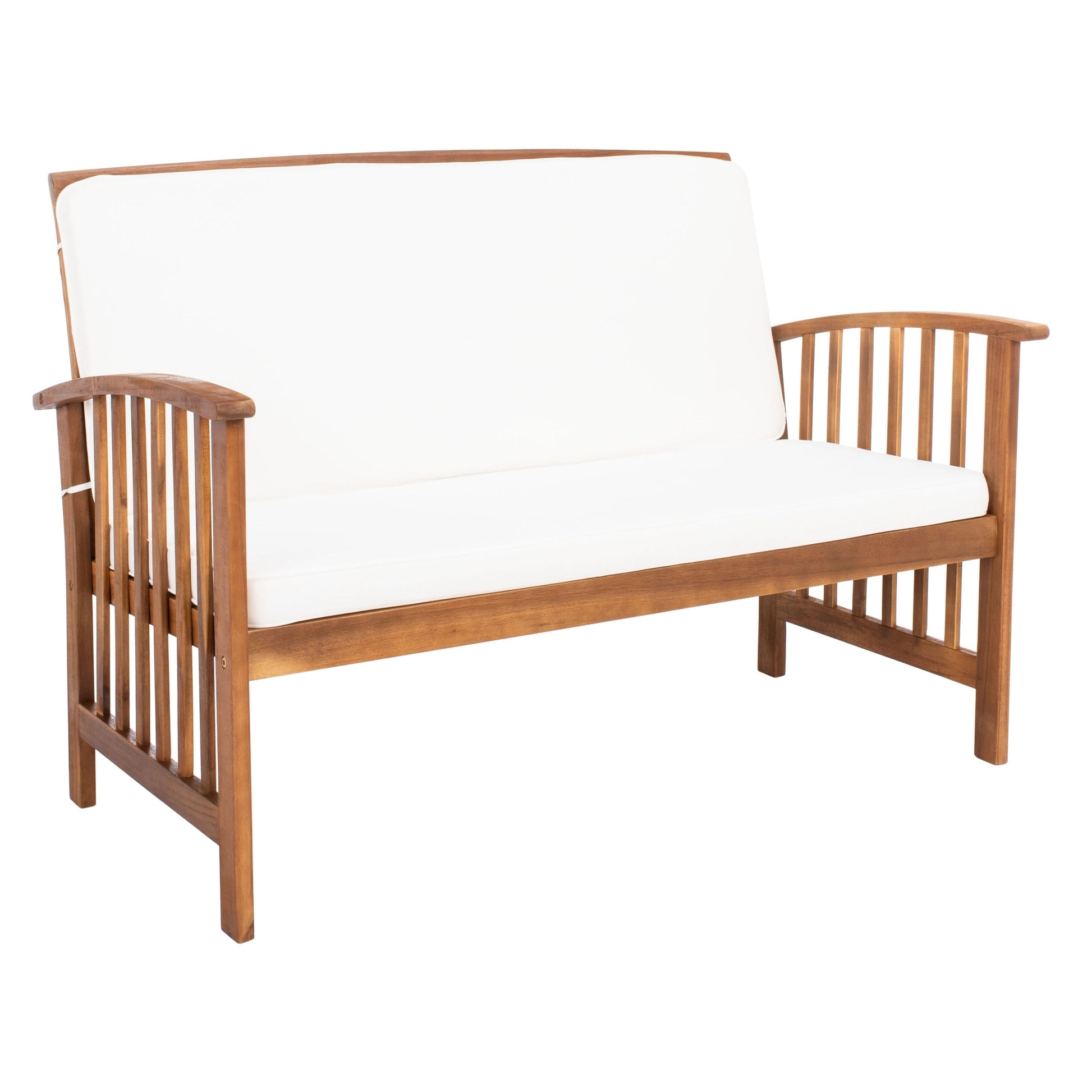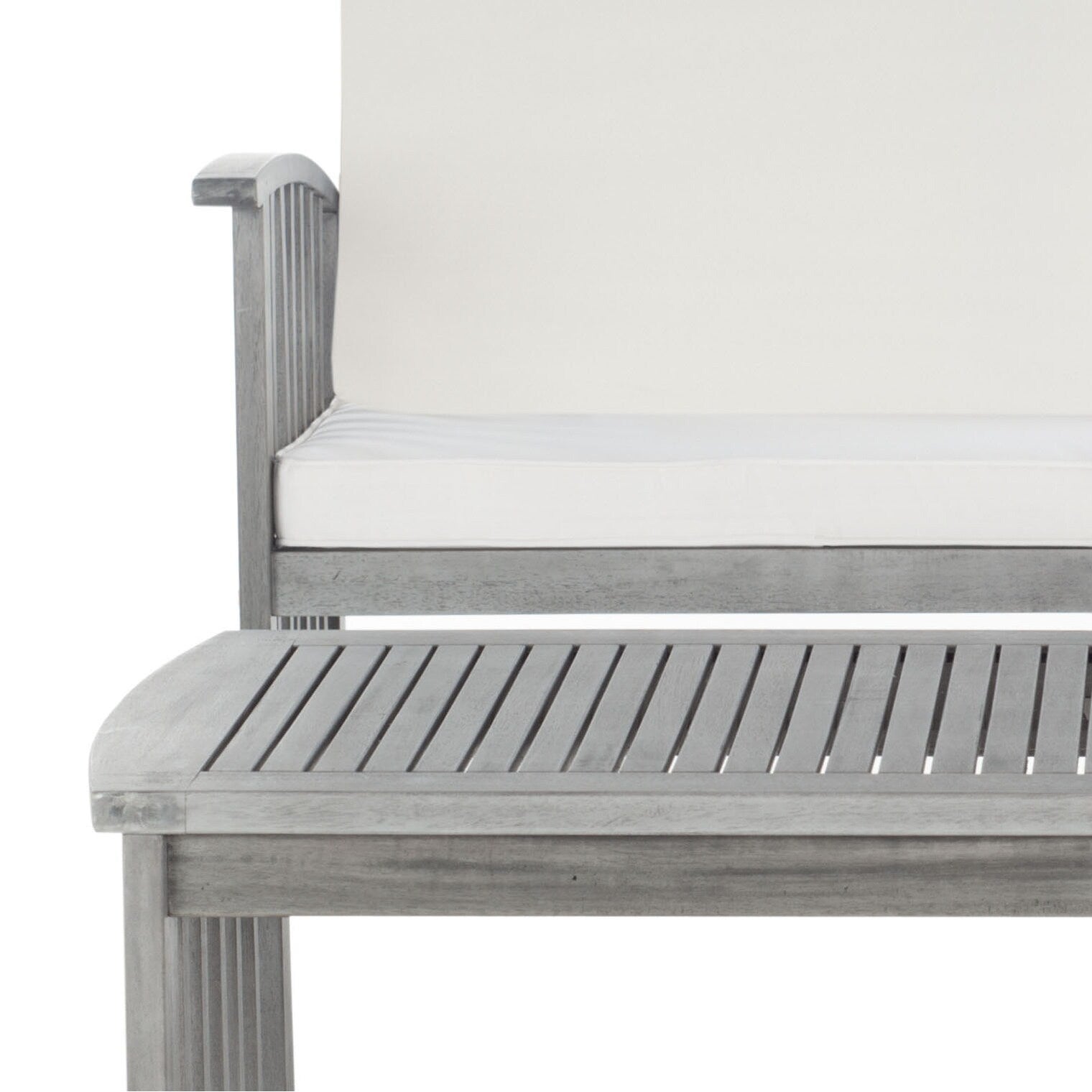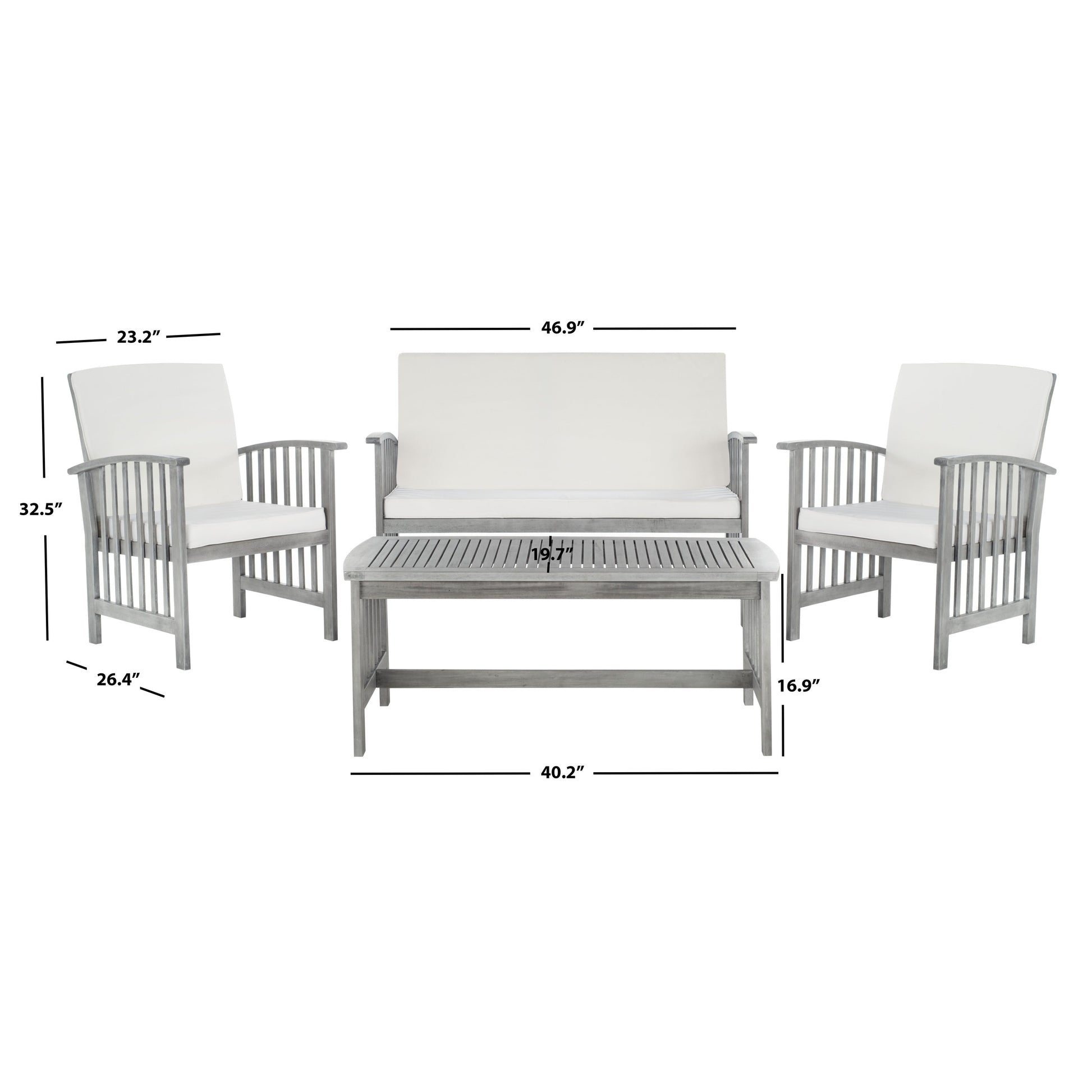 The open and airy design of the 4 piece outdoor set combines form and function. The slatted silhouette aids rain drainage while creating chic contemporary forms. The set is crafted of acacia in a brown finish with beige all weather cushions.