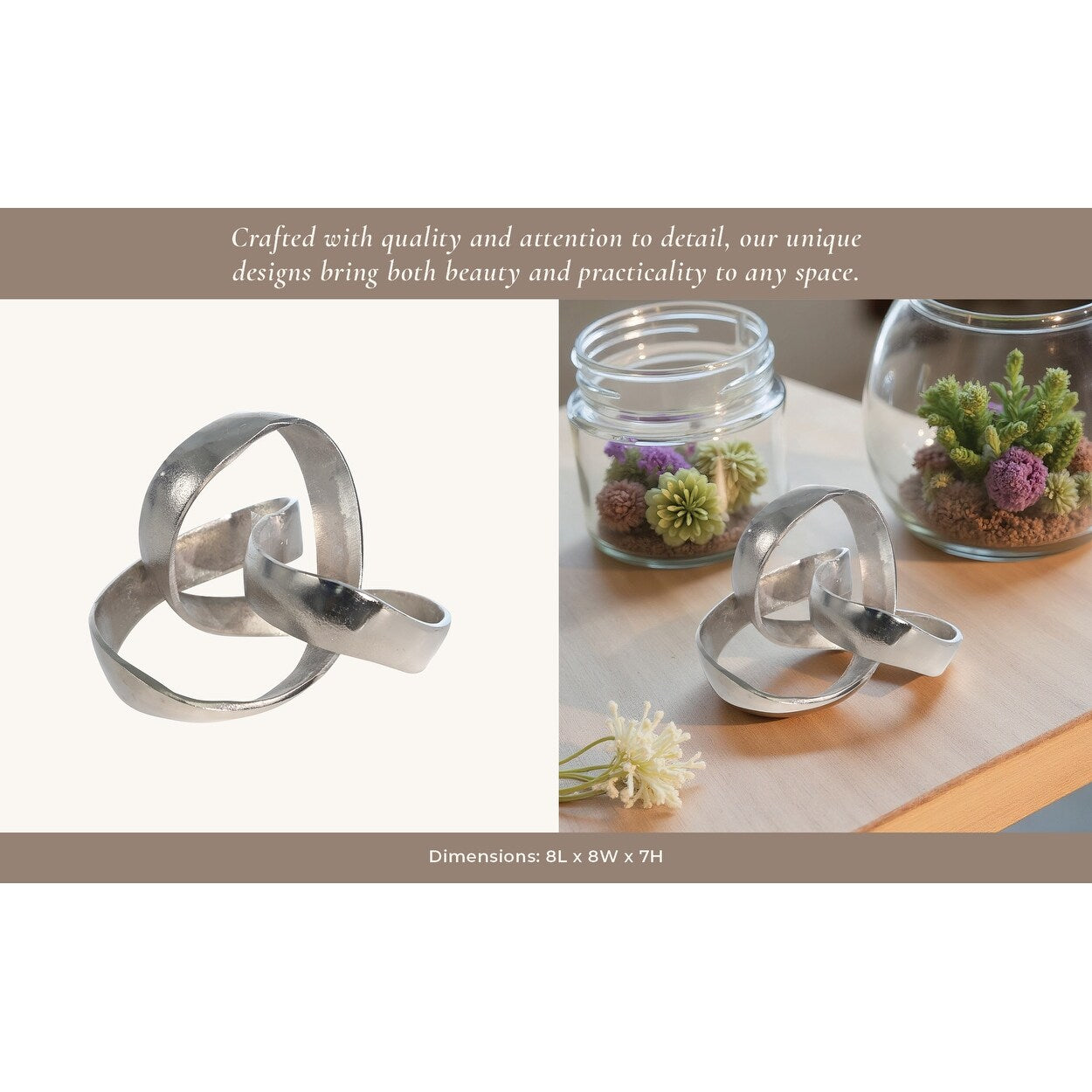 Add a touch of modern sophistication to your home or office with this decorative abstract sculpture, expertly crafted from durable metal and aluminum. The intricate intertwined design creates a striking focal point, seamlessly blending artistic elegance with contemporary minimalism. Perfect for enhancing coffee tables, bookshelves, or office desks, this versatile accent piece effortlessly uplifts any setting. Its sturdy construction ensures long-lasting beauty, making it an ideal choice for interior styling in living rooms, bedrooms, or professional spaces. Whether displayed alone or paired with other decor, it brings a refined aesthetic that complements a variety of design styles. Elevate your space with this unique sculptural decor piece and transform any room into a curated masterpiece. Order yours today to add a modern finishing touch to your home.