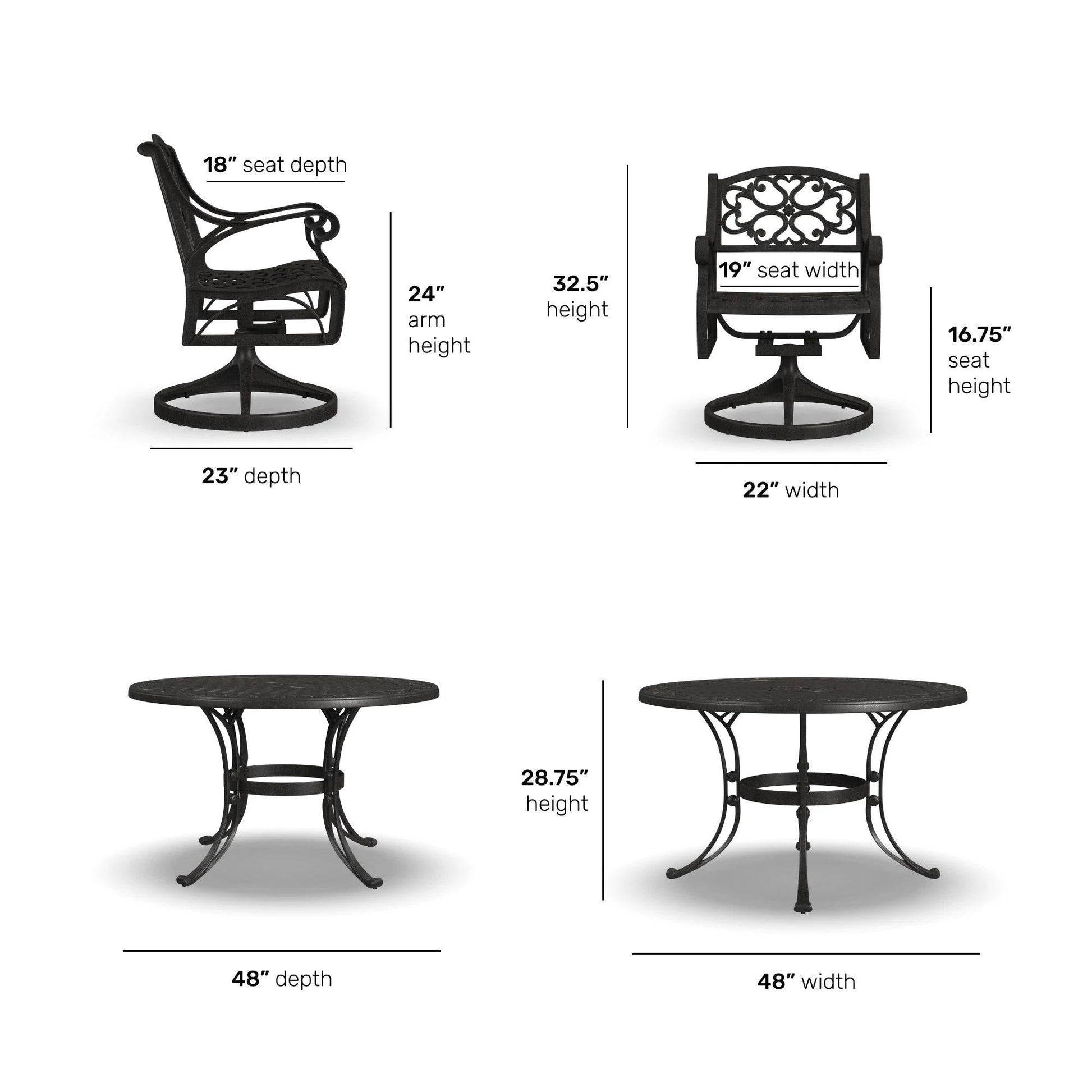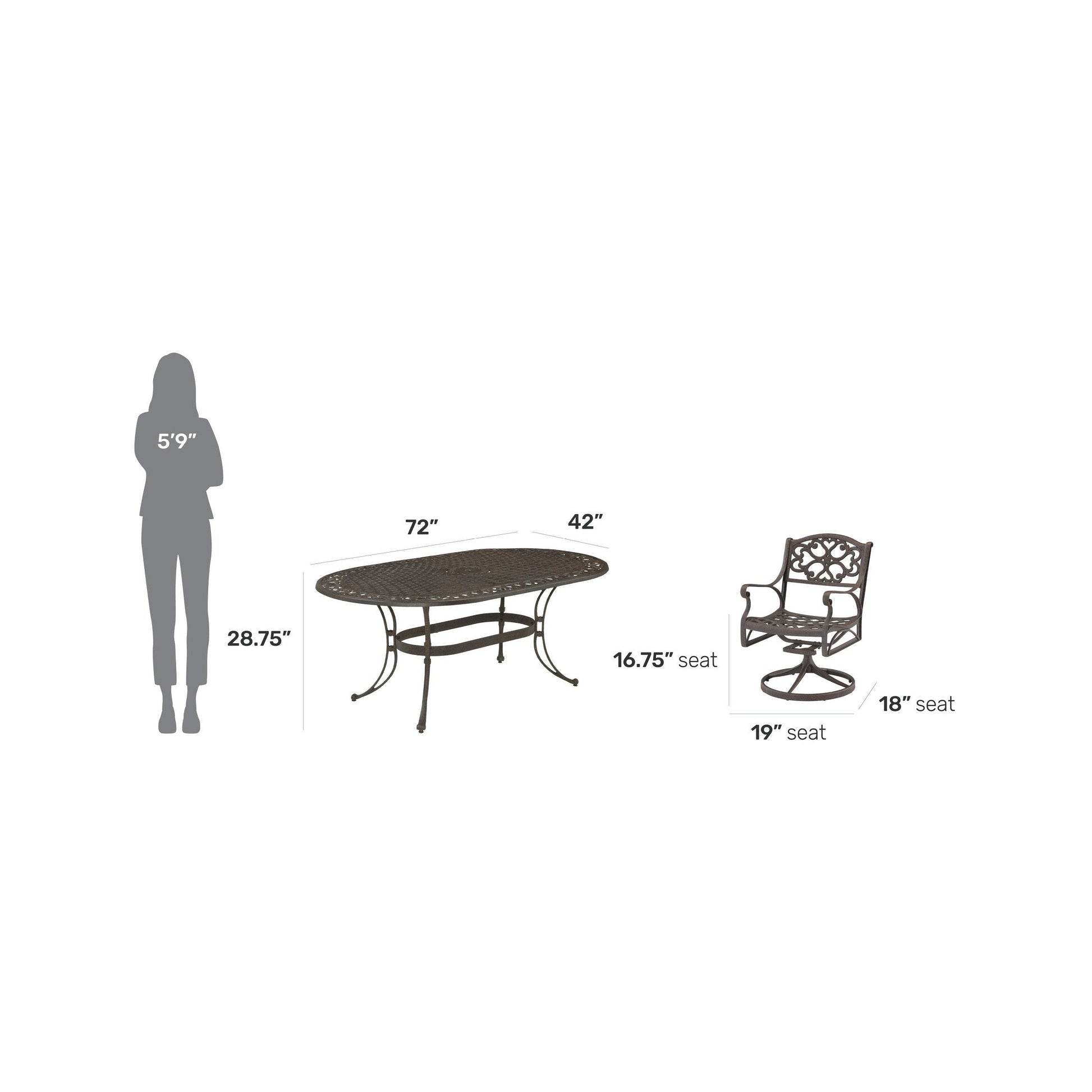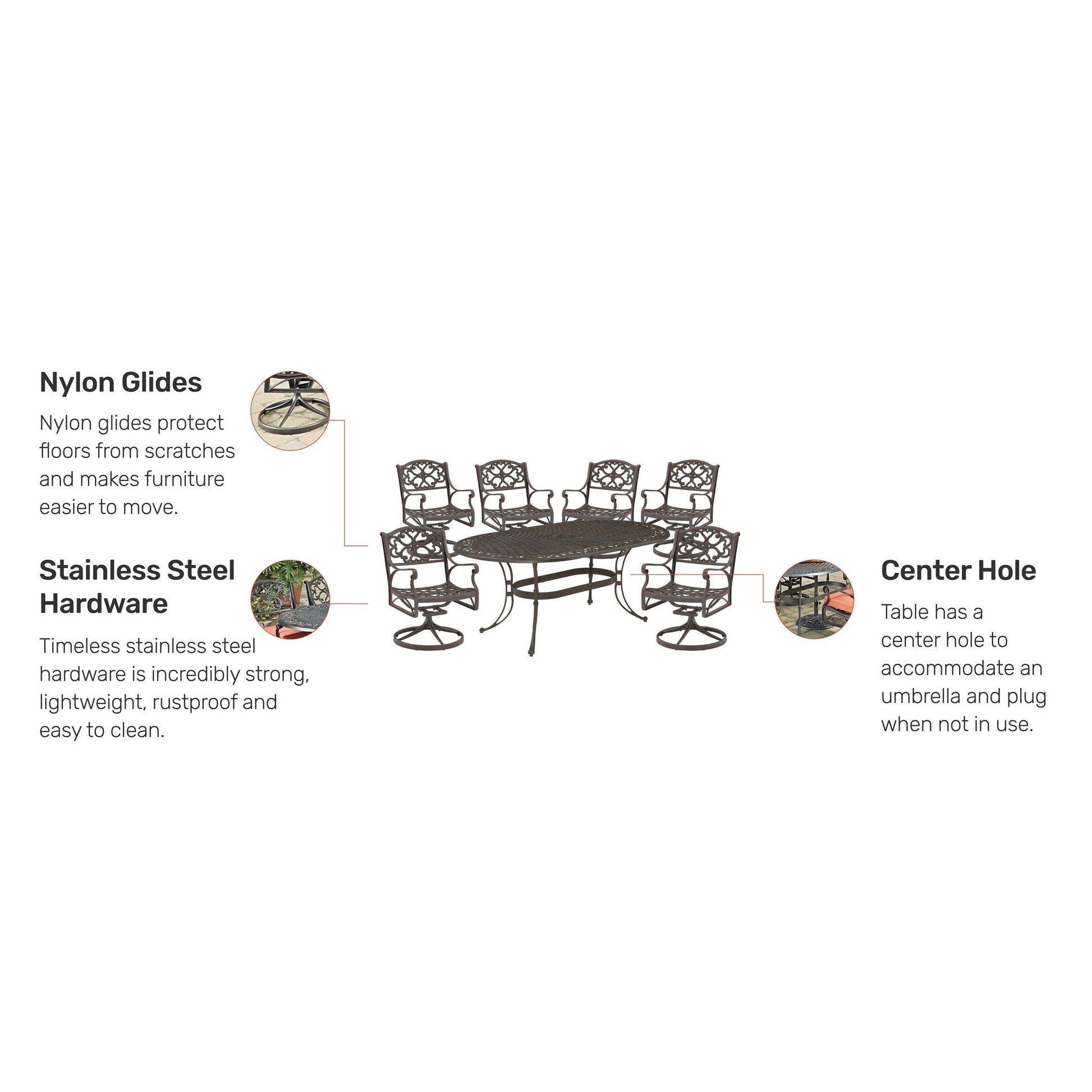 Turn an ordinary outdoor space into an oasis with this Homestyles Sanibel 7-Piece Outdoor Dining Set. Featuring a dining table and six swivel rocking chairs, this full 7-piece set gives you everything you need to enjoy the great outdoors. The powder-coated cast aluminum construction gives you low maintenance ownership season after season.
