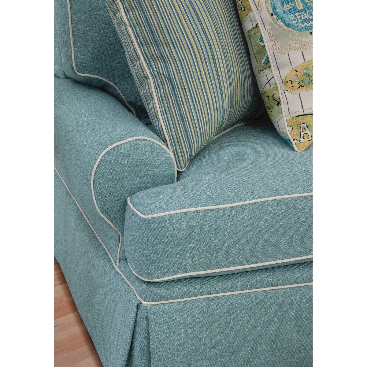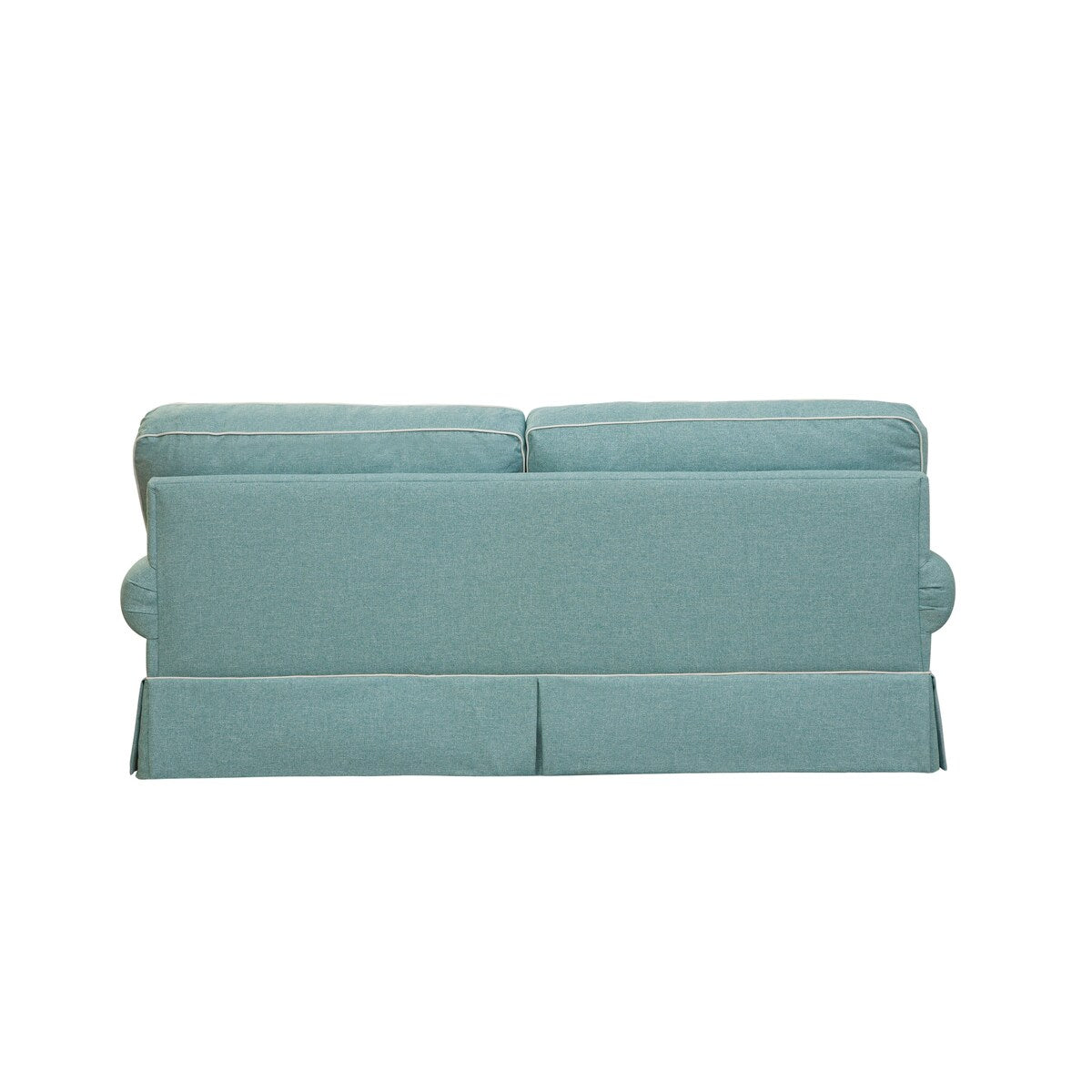 This sofa is from our updated traditional collection. A beautiful aqua color with ivory contrast welt in a coastal theme. Classic round arm sofa with reversible two over two seat and back cushions for wear and tear. This group has a tailored skirt. The fabric has the look of a woven natural linen using a durable poly blend. Accent pillows in a beach pattern on an ivory background are the perfect compliment. Sure to add a touch of elegance to your room. Perfectly tailored with an attention to detail. This sofa seats three people.
