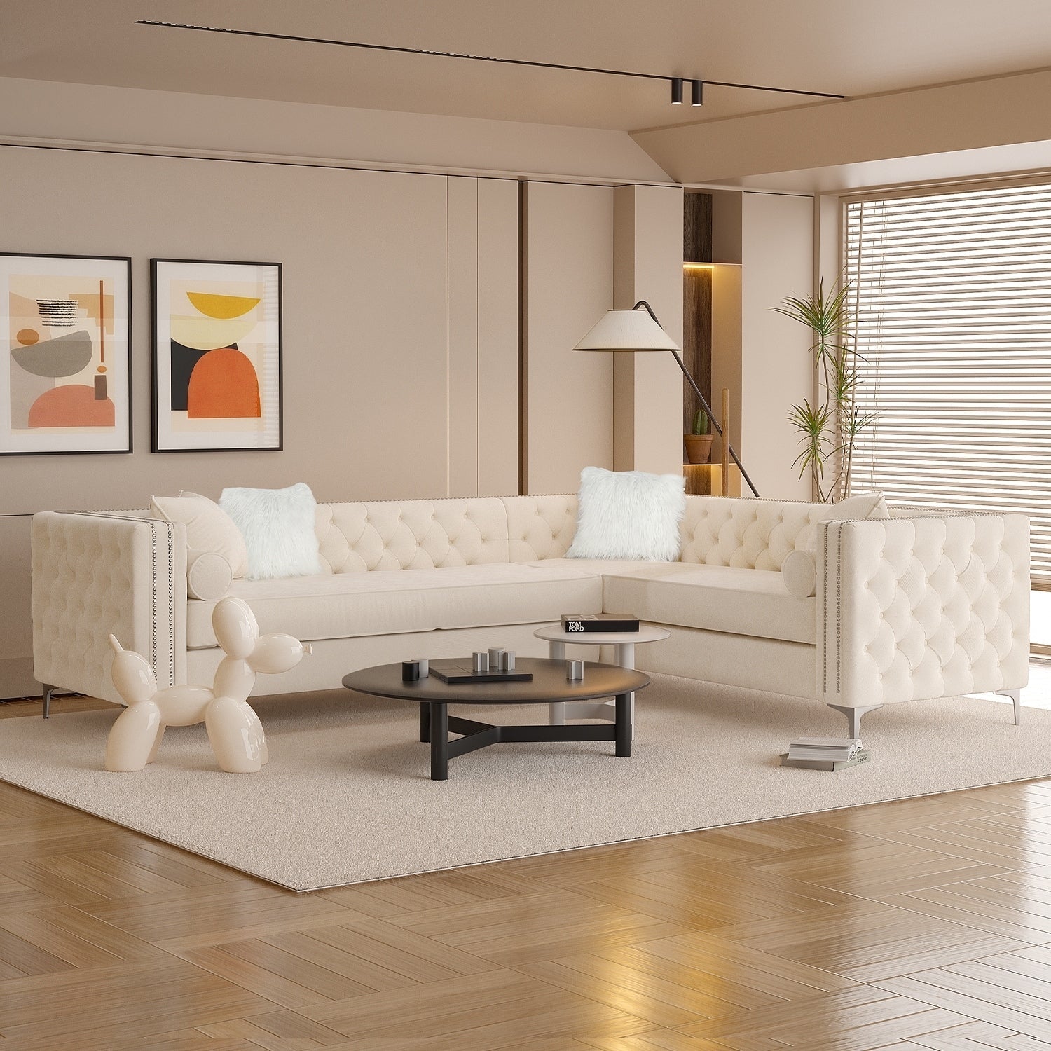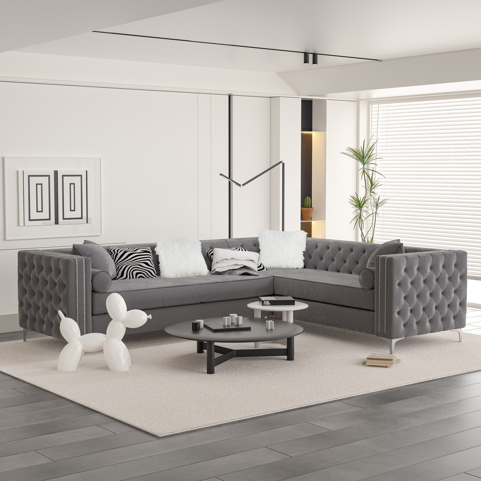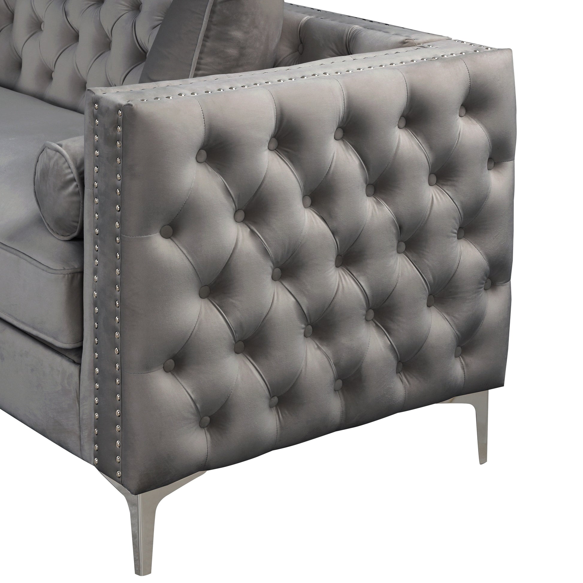 Details: Rich velvet is tufted on both the inside and outside of the frame, a beautiful design detail that can be seen from any angle in a room. Single 'bench' cushions allow for comfortable multi-person seating without cushion separations. The sectional is accented with double rows of nickel-finished nailheads and pairs beautifully. Suited for both traditional and contemporary design environments. Comfort and style are evident in this dynamic sofa. This sectional features rich-hued button tufted velvet with contrasting silver nailhead trim accenting clean square arms, high-density foam padding, removable cushions, and sturdy Y-shaped coordinating silver chrome metal legs. With this chaise sectional, traditional meets modern and the result is nothing short of spectacular.