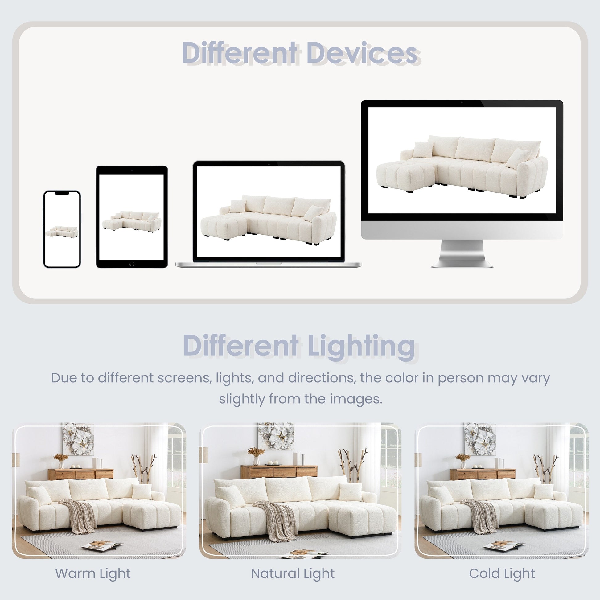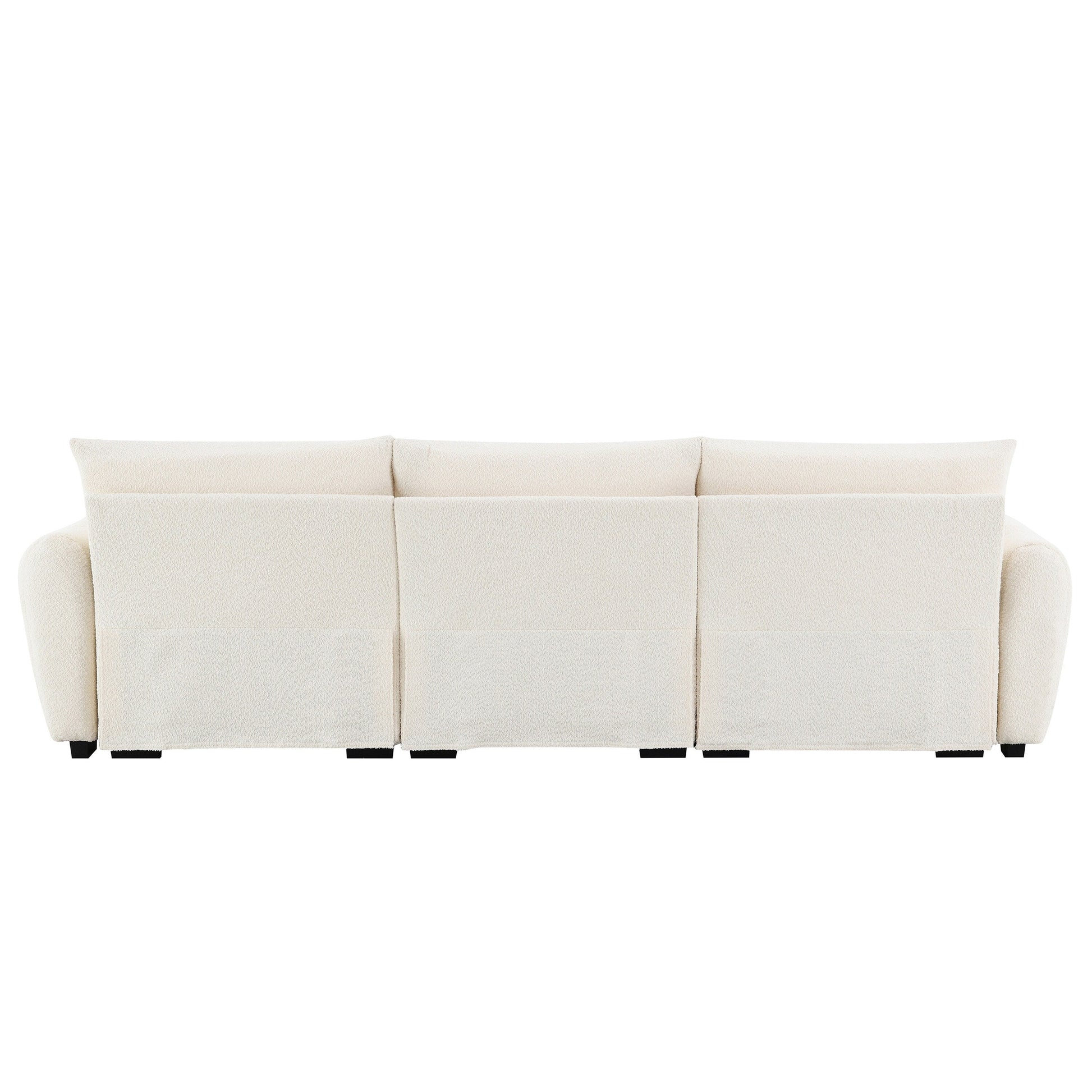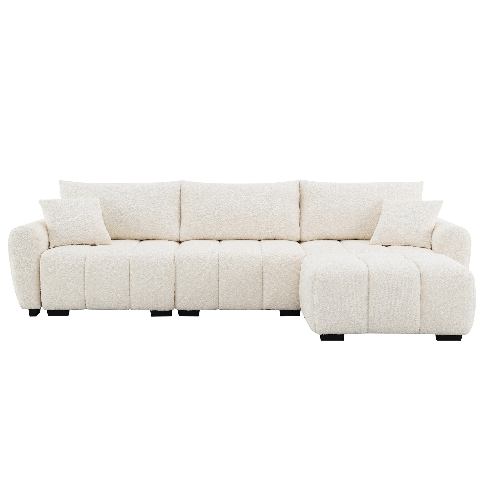 Specification Product Information Product Type:Combo Item Product Name:110' Modular Sectional Sofa, L Shape with Extra-large Seat, Pull-line Design, Movable Ottoman, High Density Foam, Free Combination, Sturdy Metal&Wood Frame, Boucle Fabric, 3 Colors Main Color:Cream Main Material:Boucle Seats:4 Seat Product Dimensions Assembled Length (in.):110.00 Assembled Width (in.):60.00 Assembled Height (in.):35.00 Product Weight (lbs.):232.37 Package Size Outer Package Images Package Quantity: 1 37.4 * 30 * 11.5 in. 115.08 lbs. Package Quantity: 1 37.75 * 30 * 9 in. 91.71 lbs. Package Quantity: 1 30.25 * 22.5 * 16.5 in. 43.65 lbs. Product Features Pull-line Design of the Seat Cushion: The pull-line design effectively prevents internal materials from shifting or sagging over prolonged use, maintaining the sofa's plump, three-dimensional silhouette. By distributing body weight evenly, it minimizes excessive localized sinking for more stable seating posture while extending the sofa's lifespan. The raised and recessed textures formed by the pull-line design break visual monotony, adding dynamic tension and elevated sophistication to the sofa. Metal&Wood Frame: The metal part delivers core structural support, while the wooden frame absorbs and cushions vibrations, which make the sofa exceptionally sturdy, durable, and resistant to warp and break. Free Movement Ottoman: The ottoman allows adjustable positioning which accommodates various postures. Whether used as extra seating, a footrest, or a coffee table, the ottoman adds versatility to the layout. Move it to any part of the room to suit your preferences or change the arrangement to suit different occasions. Four Modular Pieces: The sofa consists of four modular pieces that can be easily rearranged, giving flexibility to create different seating arrangements. The customizable design adapts to different room sizes and configurations, making it perfect for both large and compact spaces. Comfortable Seat: This sofa features an ultra-thick seat cushion filled with high-density foam and zigzag springs, delivering exceptional resilience, plush comfort, and cloud-like softness. The seat base is constructed as a single integrated unit, enhancing the sofa's structural integrity for long-lasting durability.