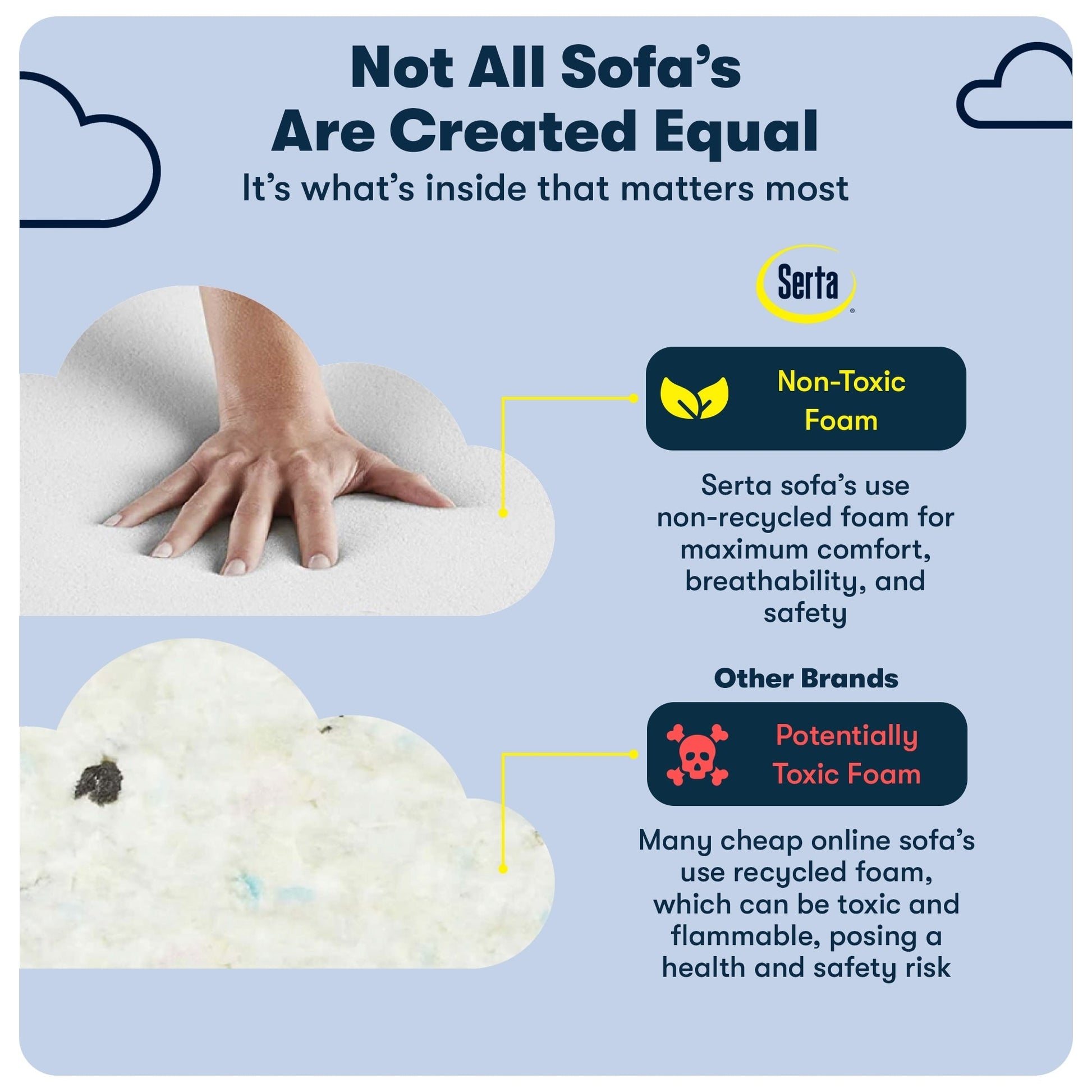 - Serta Foam &Build: Made of a solid wood frame fitted with sinuous springs for extra support and sturdy solid wood legs that can handle up to 500 lbs. All Serta sofas use quality, non-recycled and non-toxic foam for breathability and safety.