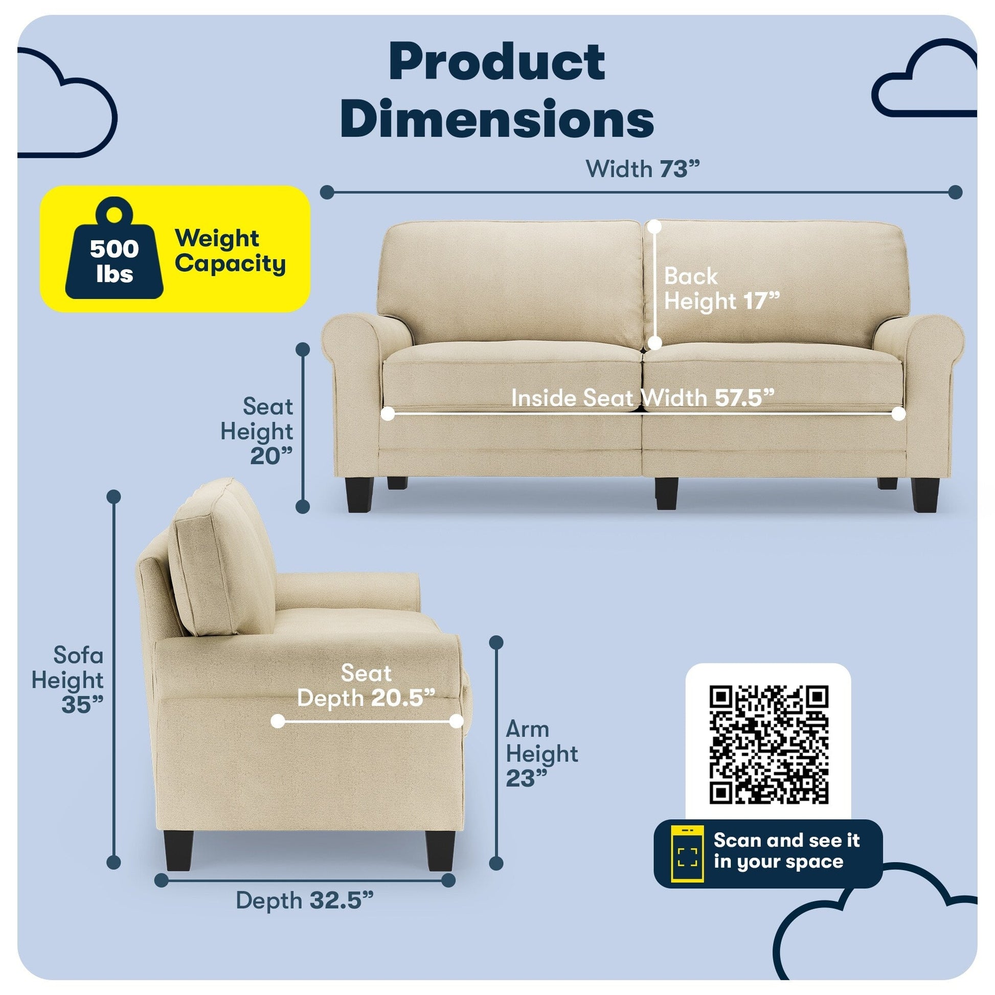 - Space- Saving Design: Its compact size and low-profile (73' wide x 33' deep x 36' high) make this two-seater couch a great choice for smaller apartments or lofts, living rooms, or home offices. Fits all doorways, halls, stairs or elevators. Better-suited for users under 6ft tall.