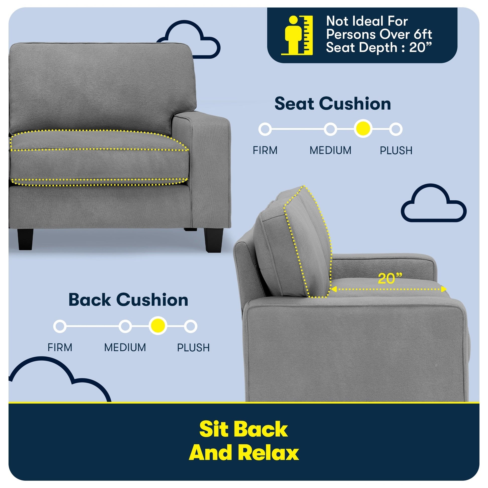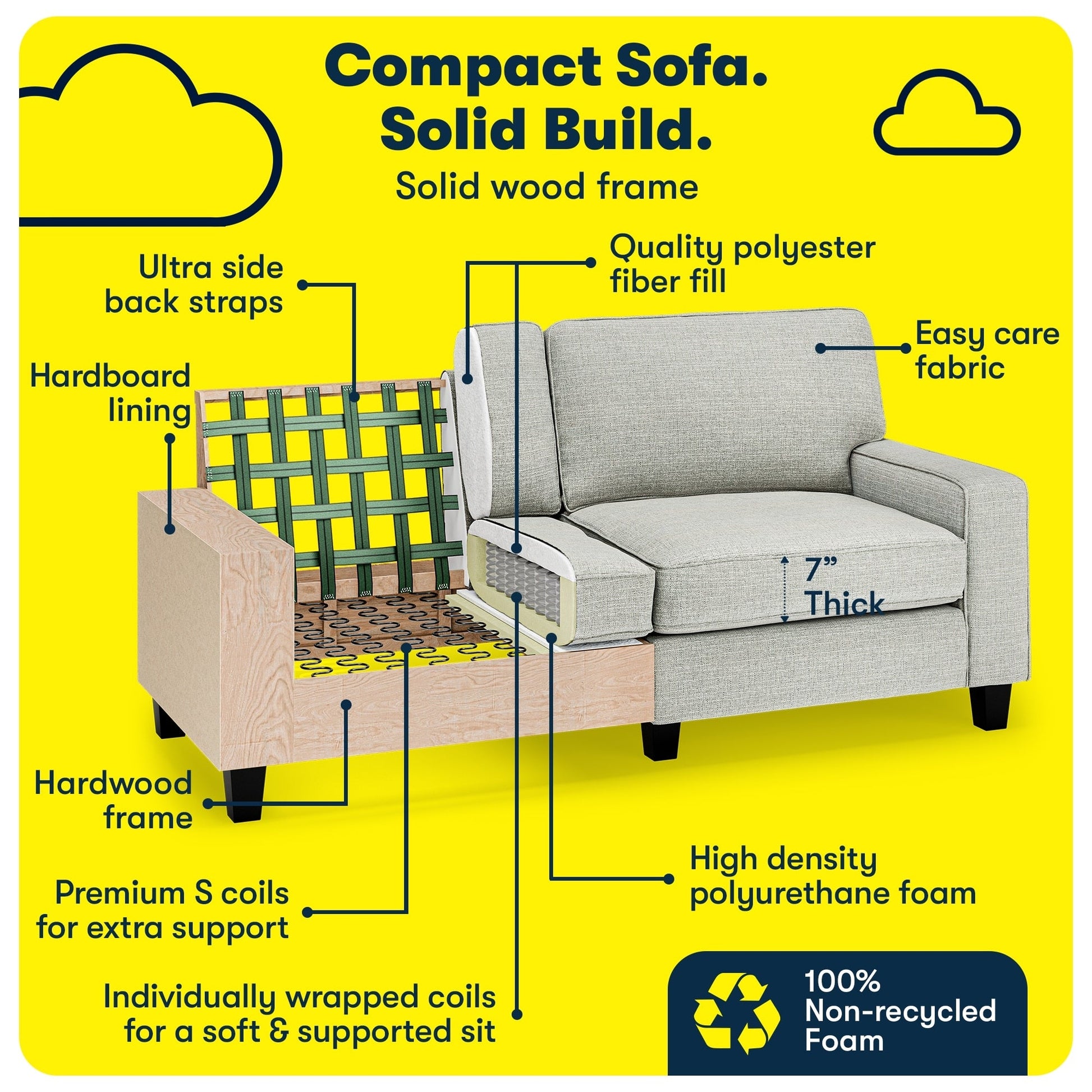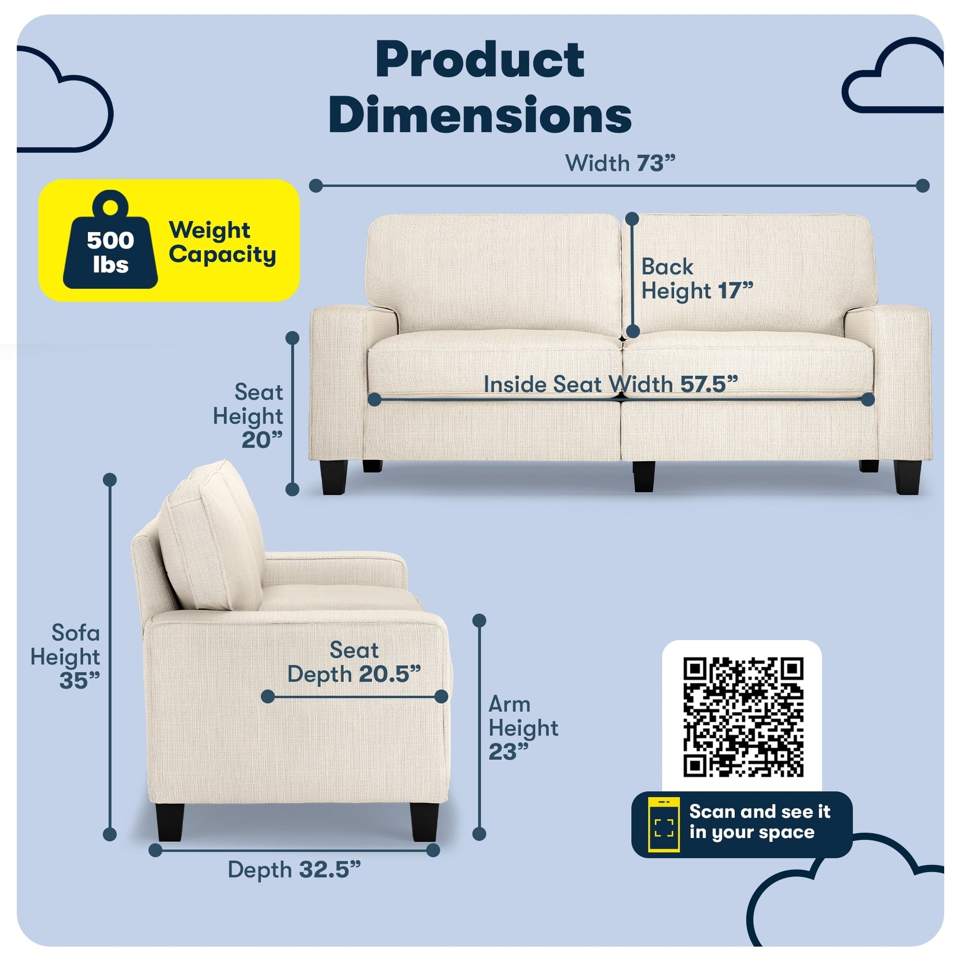 - Space- Saving Design: Its compact size and low-profile (73' wide x 33' deep x 36' high) make this two-seater couch a great choice for smaller apartments or lofts, living rooms, or home offices. Fits all doorways, halls, stairs or elevators. Better-suited for users under 6ft tall.