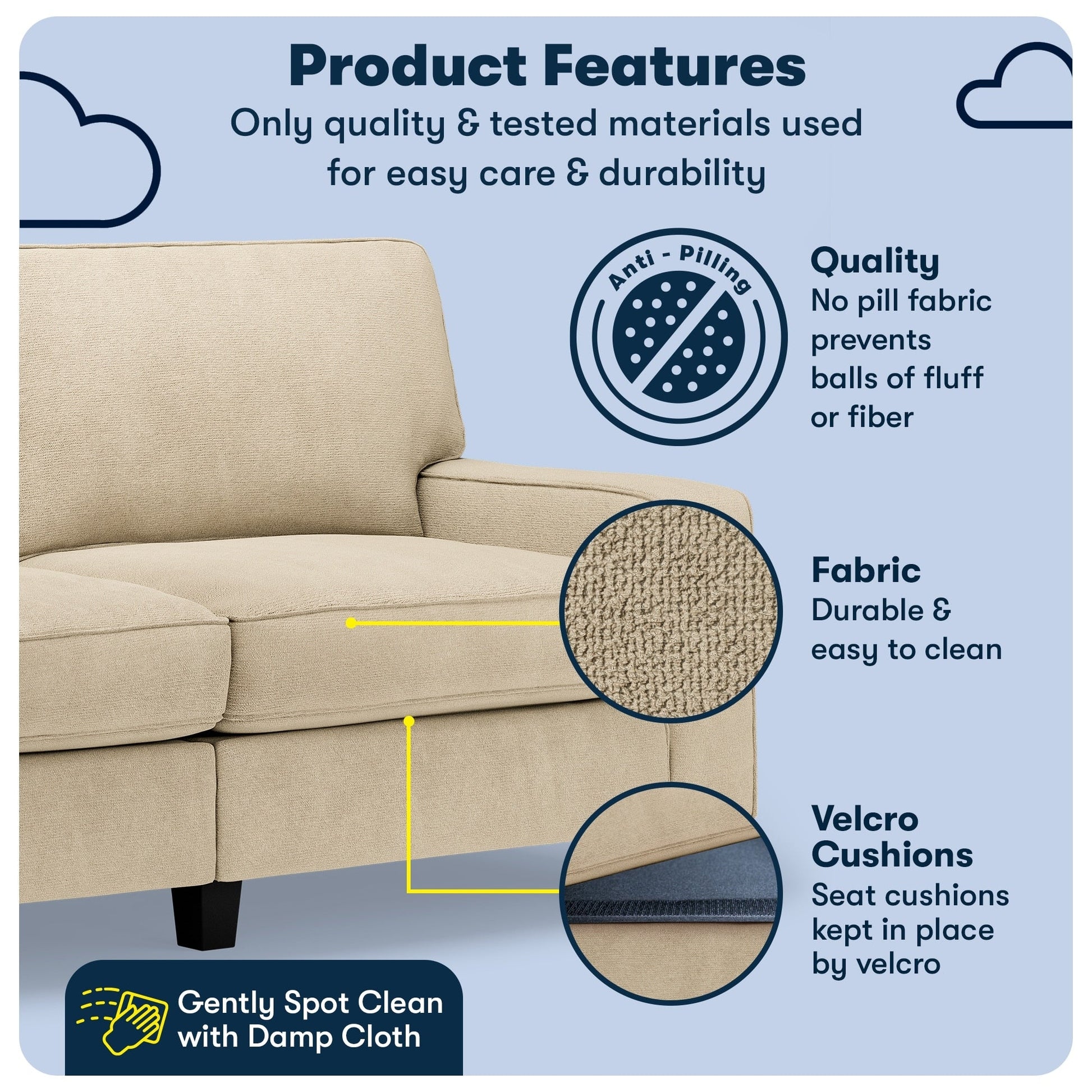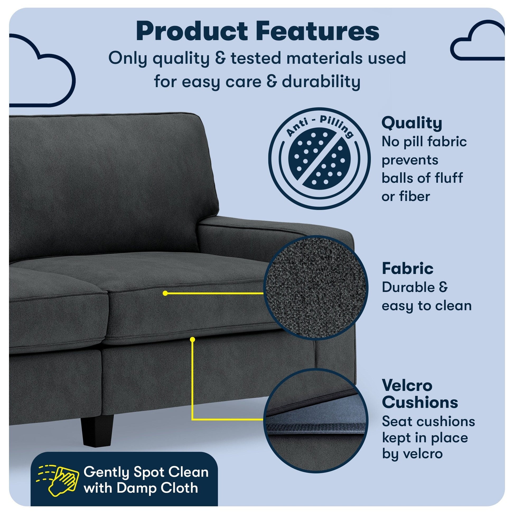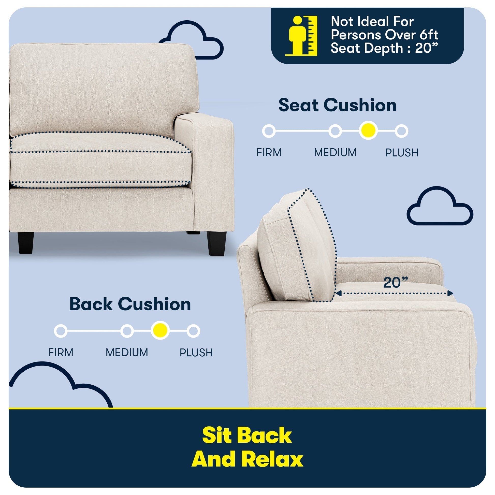 - Space- Saving Design: Its compact size and low-profile (73' wide x 33' deep x 36' high) make this two-seater couch a great choice for smaller apartments or lofts, living rooms, or home offices. Fits all doorways, halls, stairs or elevators. Better-suited for users under 6ft tall.