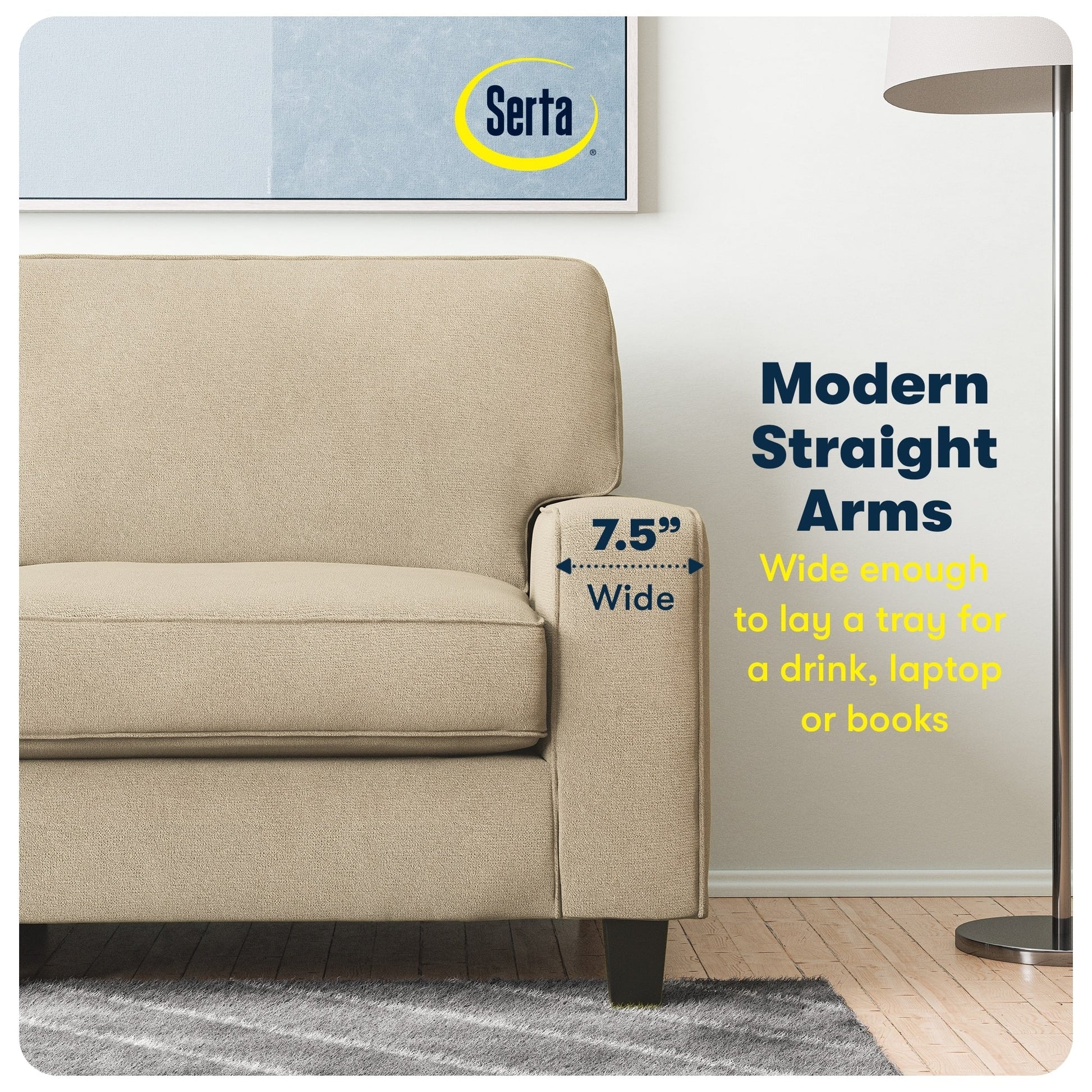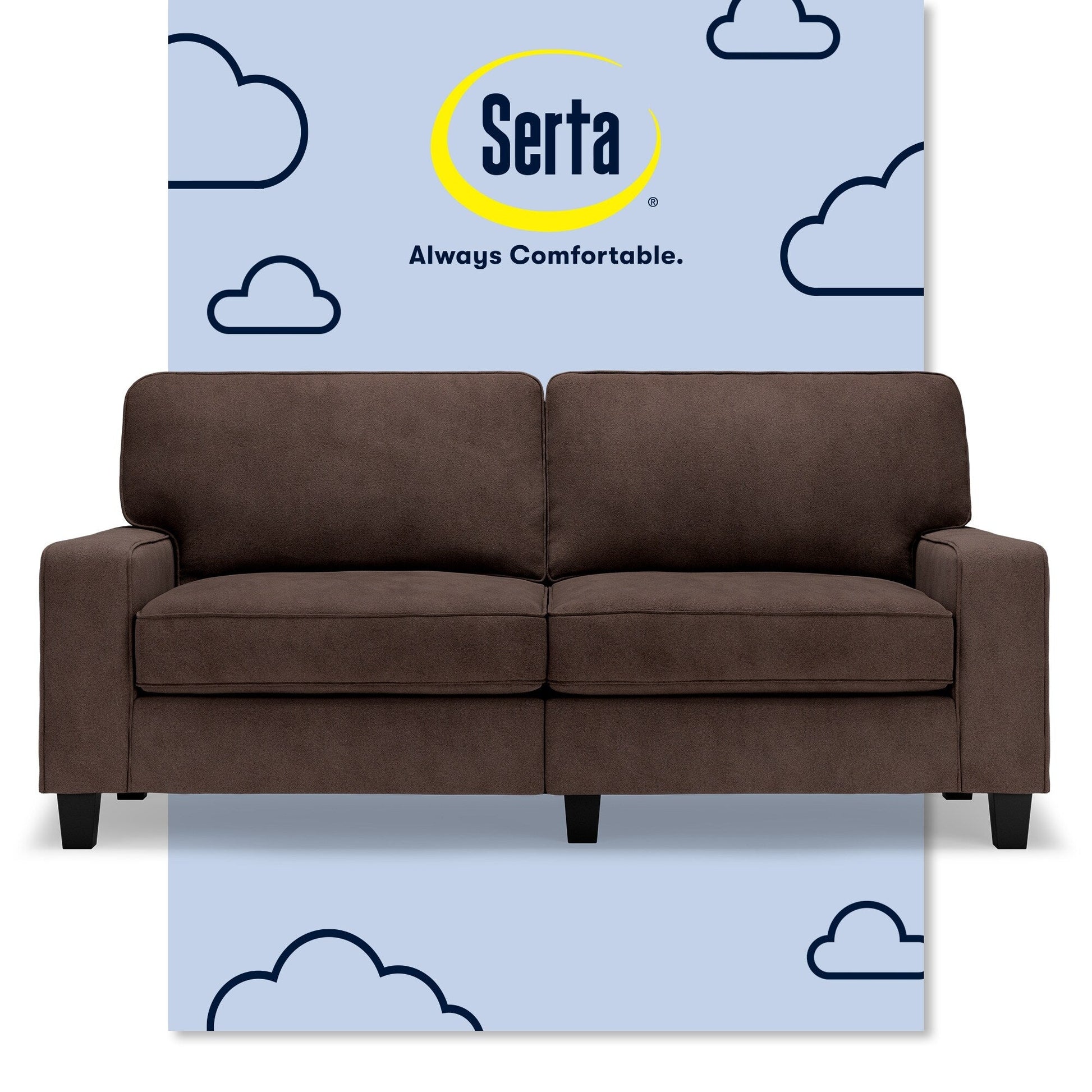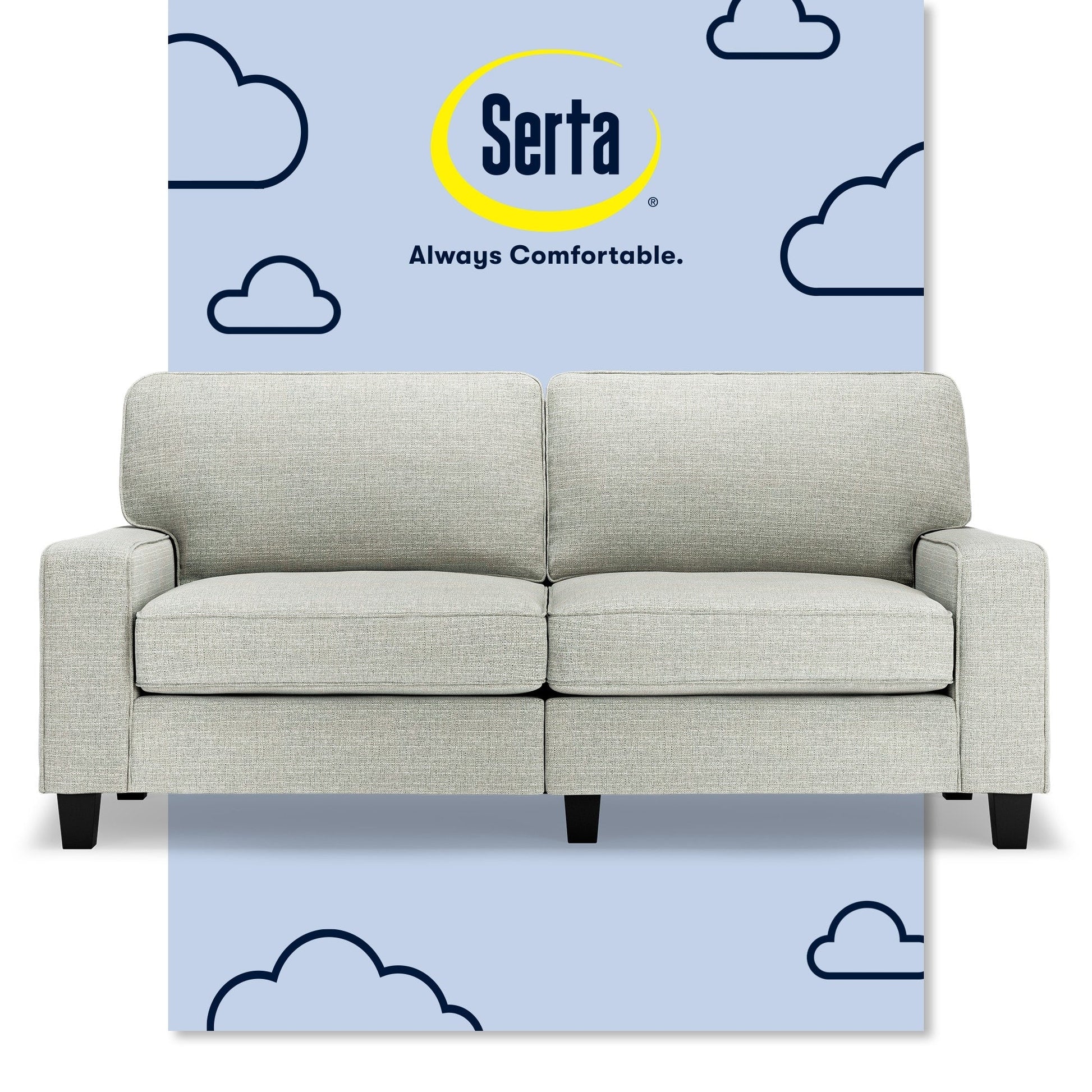 Whether you're furnishing your first home or seeking a space-saving solution for your existing space, Serta delivers. Our conveniently packaged sofas arrive directly at your door in one carton, and they provide the perfect blend of style and comfort you've come to expect from Serta. Don't let living in a modestly sized apartment, or being on a managed budget, be the limiting factors to creating a welcoming home. The Serta Palisades collection is designed specifically for smaller living spaces, offering 61', 73' and 78' length options. With a seat depth of 20.5' you can still relax comfortably without the sofa taking up too much space. However, this means the sofa's proportions are better-suited for users under 6 feet tall. The Palisades 73', 2-seater sofa arrives in a single convenient box. The unopened box will fit any doorway, hall, stairwell, or elevator. Once in your home, it will thrive in smaller living rooms or home offices, but is a versatile choice for dorms, kidâs rooms, den, and family rooms. Plus, its low-profile will make any smaller space feel open and airy, giving the freedom to mix and match with other furniture pieces. This inviting sofa features clean lines and track arms for a timeless look. Upholstered in an anti-pilling polyester fabric or durable bonded leather, the Palisades is easy to care for and spills are simple to clean. 16 color options are available to complement your décor. Please note that the actual color may differ slightly from what appears online depending on the amount of light and the positioning of the sofa in any space. Soft pillow backs, generously filled with soft fibers, rest against a backrest with structured webbing to keep things comfortable and supportive. The seat cushions are filled with high-density, non-recycled Serta quality foam, which cover individually wrapped pocket coils for a supportive core and semi-plush sit. Welcome the Serta Palisades Sofa into your home for modern style and comfort with space-saving functionality. Lounging or relaxing has never been so convenient.