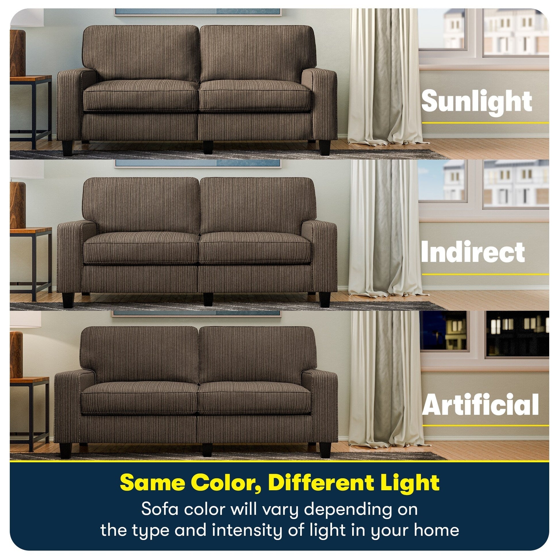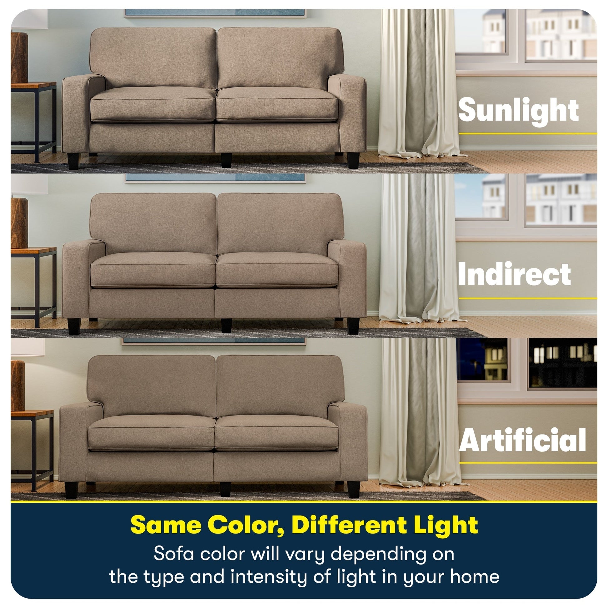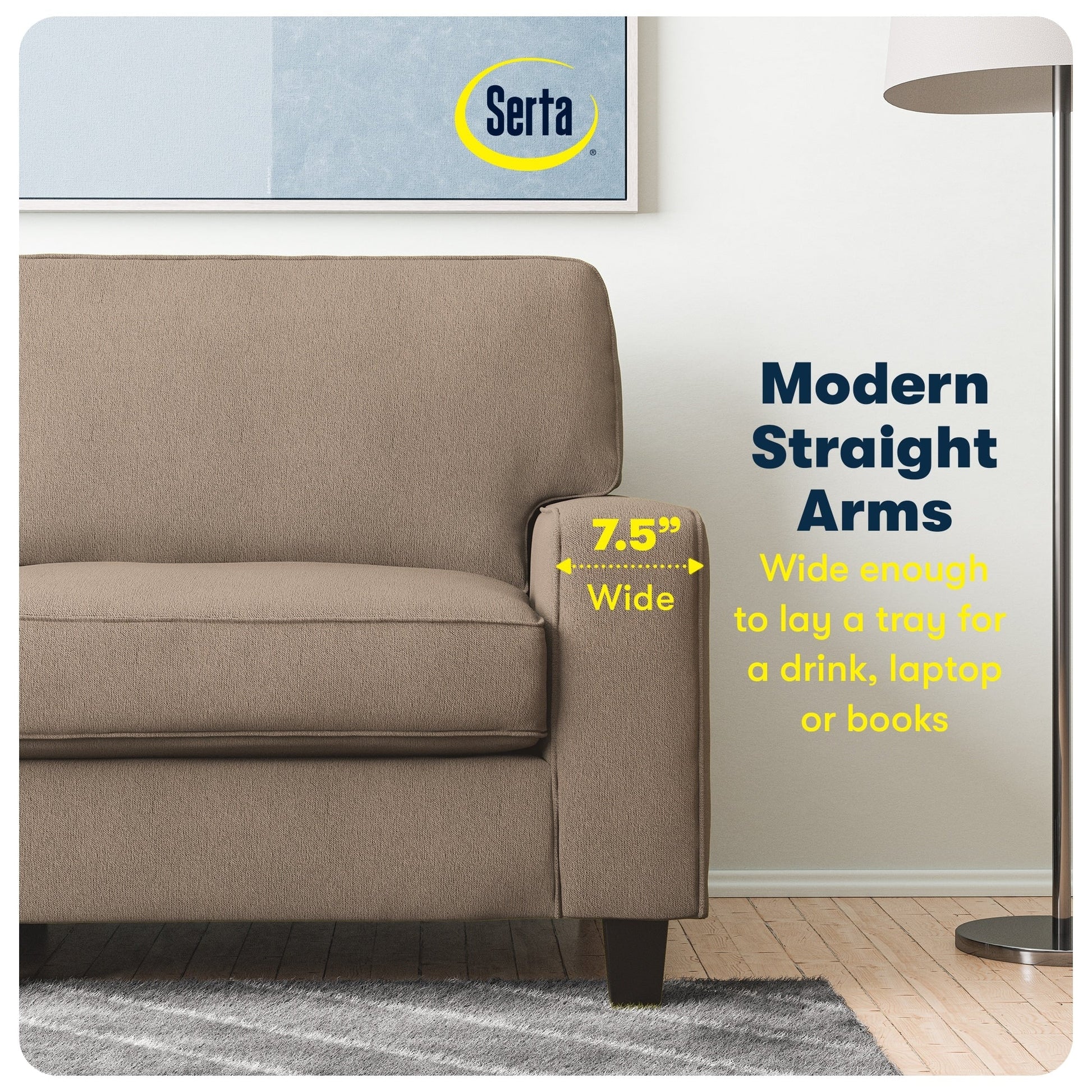Whether you're furnishing your first home or seeking a space-saving solution for your existing space, Serta delivers. Our conveniently packaged sofas arrive directly at your door in one carton, and they provide the perfect blend of style and comfort you've come to expect from Serta. Don't let living in a modestly sized apartment, or being on a managed budget, be the limiting factors to creating a welcoming home. The Serta Palisades collection is designed specifically for smaller living spaces, offering 61', 73' and 78' length options. With a seat depth of 20.5' you can still relax comfortably without the sofa taking up too much space. However, this means the sofa's proportions are better-suited for users under 6 feet tall. The Palisades 73', 2-seater sofa arrives in a single convenient box. The unopened box will fit any doorway, hall, stairwell, or elevator. Once in your home, it will thrive in smaller living rooms or home offices, but is a versatile choice for dorms, kidâs rooms, den, and family rooms. Plus, its low-profile will make any smaller space feel open and airy, giving the freedom to mix and match with other furniture pieces. This inviting sofa features clean lines and track arms for a timeless look. Upholstered in an anti-pilling polyester fabric or durable bonded leather, the Palisades is easy to care for and spills are simple to clean. 16 color options are available to complement your décor. Please note that the actual color may differ slightly from what appears online depending on the amount of light and the positioning of the sofa in any space. Soft pillow backs, generously filled with soft fibers, rest against a backrest with structured webbing to keep things comfortable and supportive. The seat cushions are filled with high-density, non-recycled Serta quality foam, which cover individually wrapped pocket coils for a supportive core and semi-plush sit. Welcome the Serta Palisades Sofa into your home for modern style and comfort with space-saving functionality. Lounging or relaxing has never been so convenient.