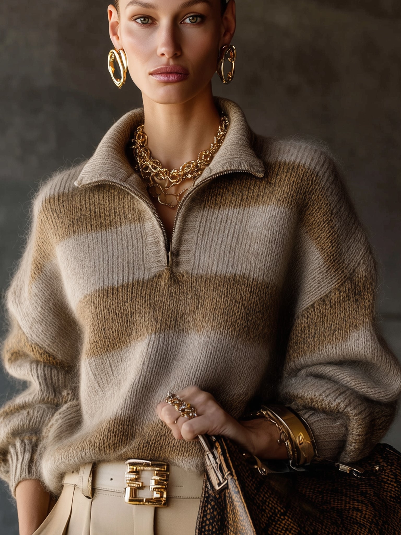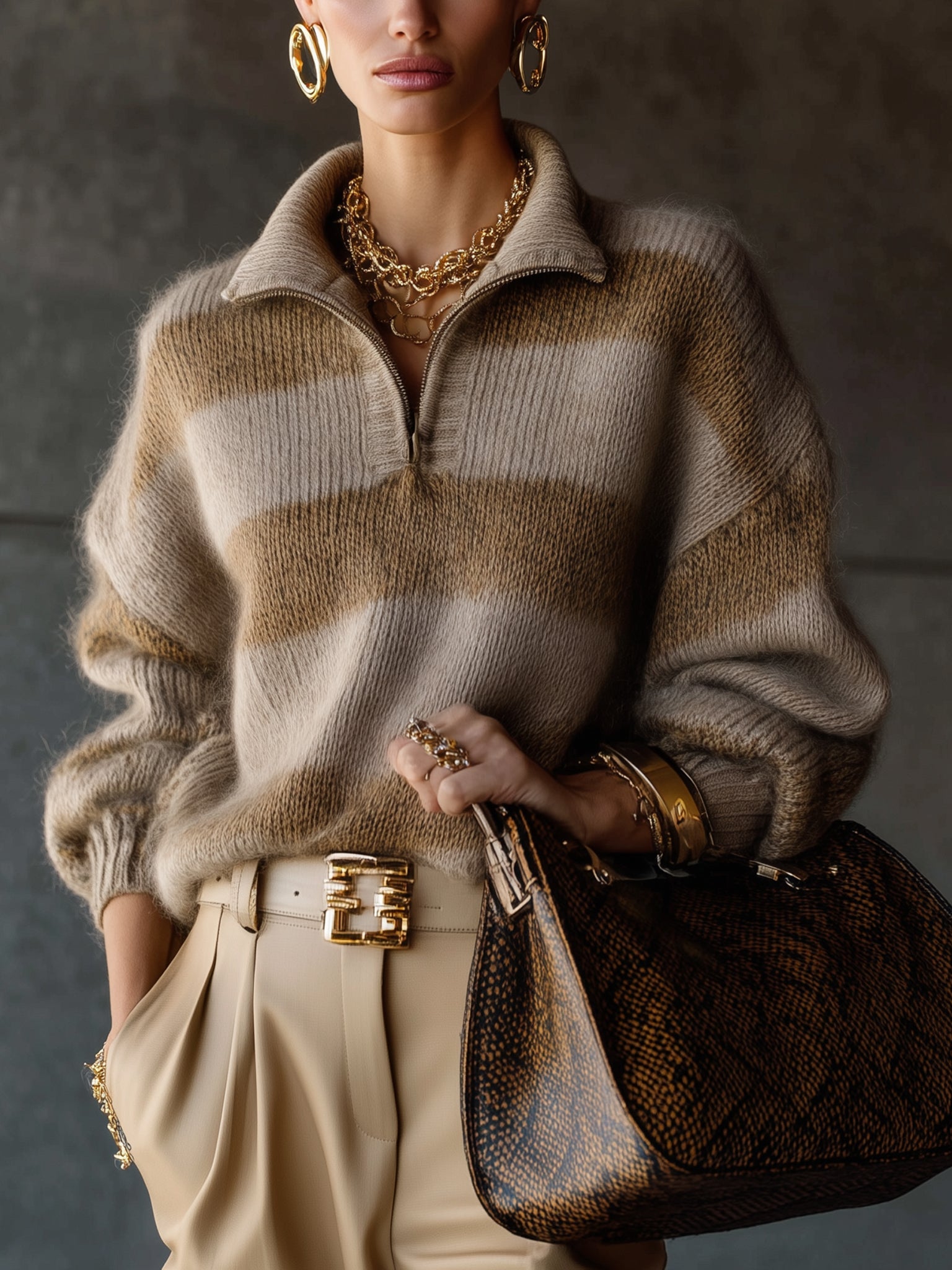 Design: Featuring wide horizontal stripes in neutral taupe and beige tones, the half-zip collar adds a contemporary twist, striking the perfect balance between casual elegance and cozy sophistication. Ribbed cuffs and hem add structure to the relaxed silhouette.