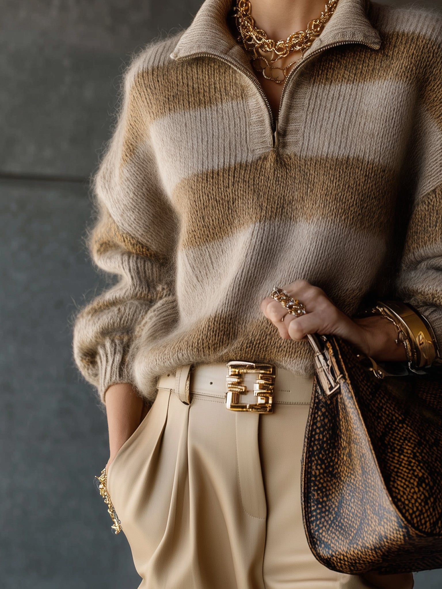 This taupe striped mohair sweater embodies luxurious comfort with understated elegance. The soft neutral palette complements gold-toned accessories beautifully, making it a perfect match for both casual daywear and smart-casual ensembles. Whether layered under a trench coat or tucked into high-rise trousers, it’s a timeless wardrobe staple that exudes graceful warmth and modern flair.