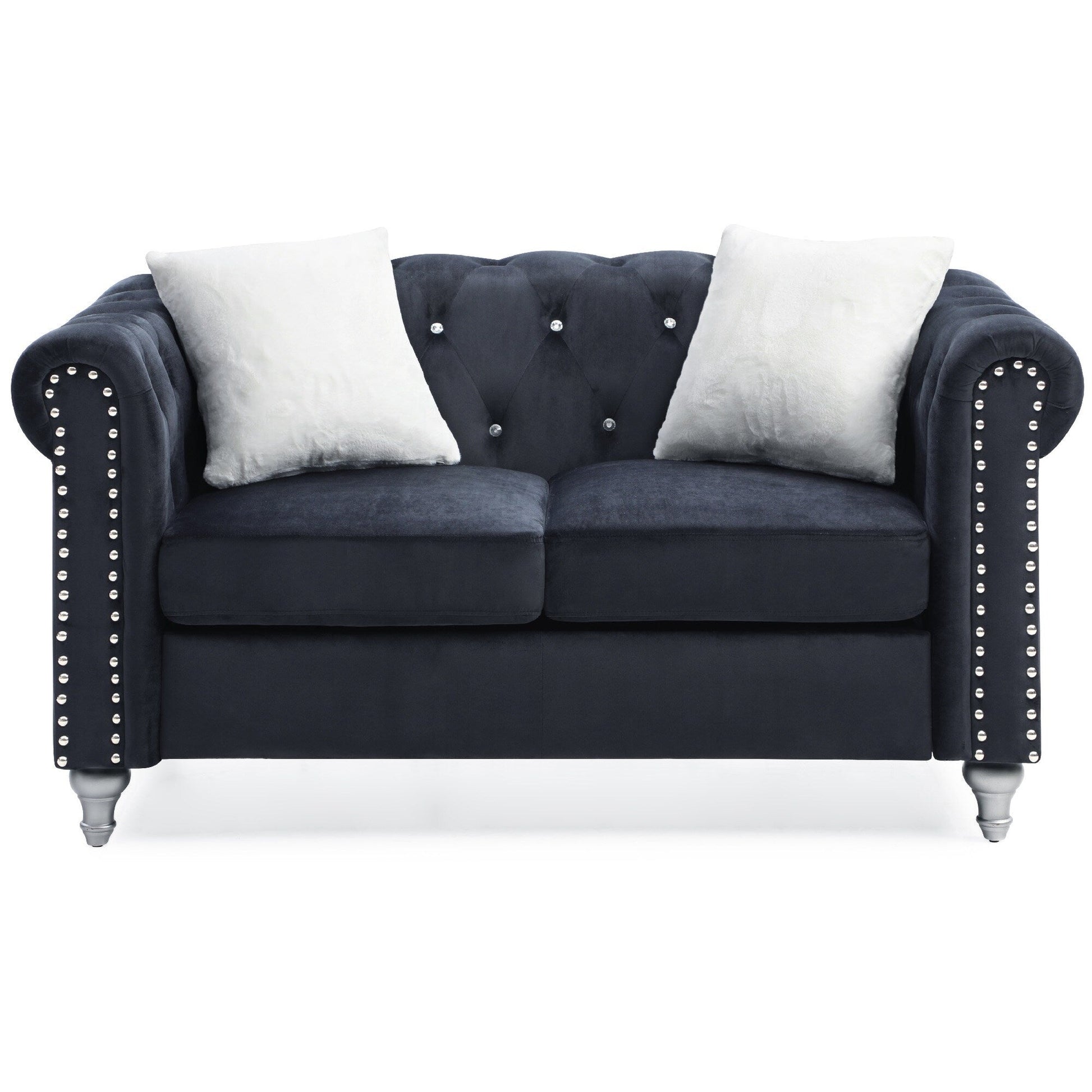 Product Features: Black tufted 2-seater sofa Crafted with soft microsuede velvet upholstery Chesterfield design with faux jewel accents Includes two plush throw pillows Pocketed coil cushions Stylish chrome nailhead trim Assembly required For indoor use only