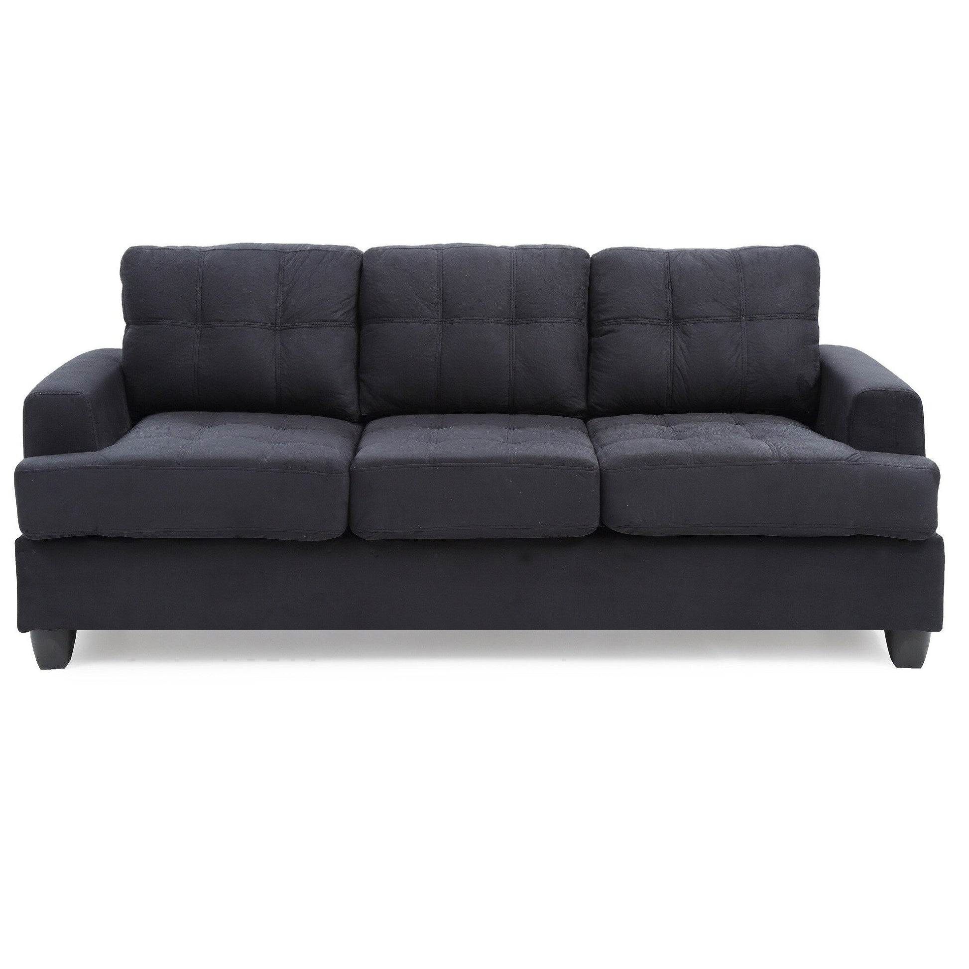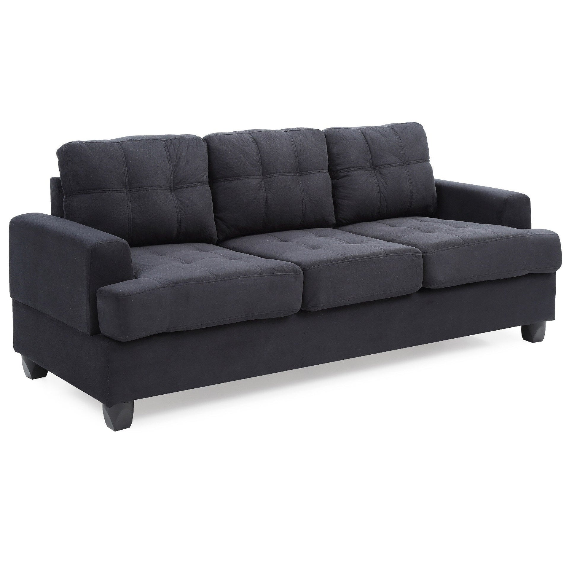 Product Features: Black tufted straight sofa Crafted with microsuede upholstery Removable backs and arms for added convenience Hardwood frame for lasting durability Pocket coil springs ensure support Ideal for apartments, dorms, and RVs Assembly required For indoor use only