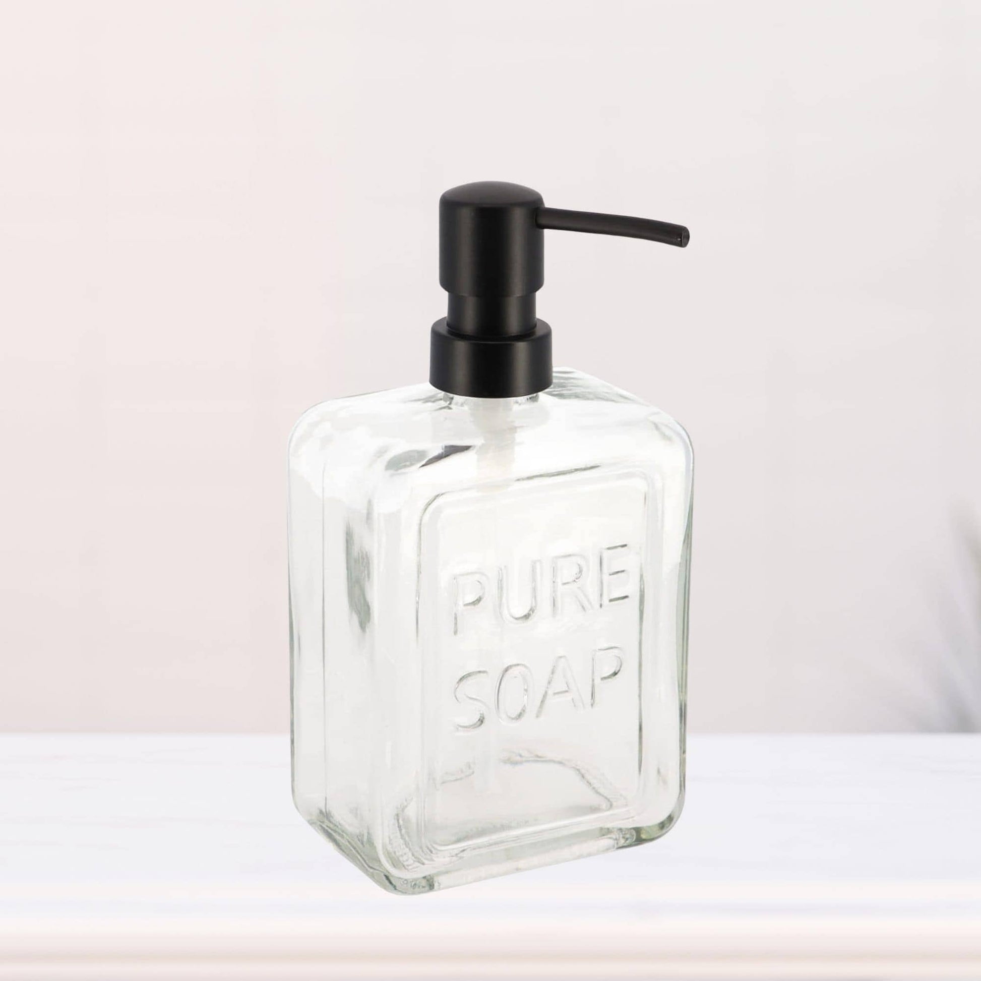 • ELEGANT DESIGN: The angular shape of this transparent soap dispenser is reminiscent of an old-fashioned soap. Pure Soap engraved on the bottle, combined with the black pump tip, completes your modern design