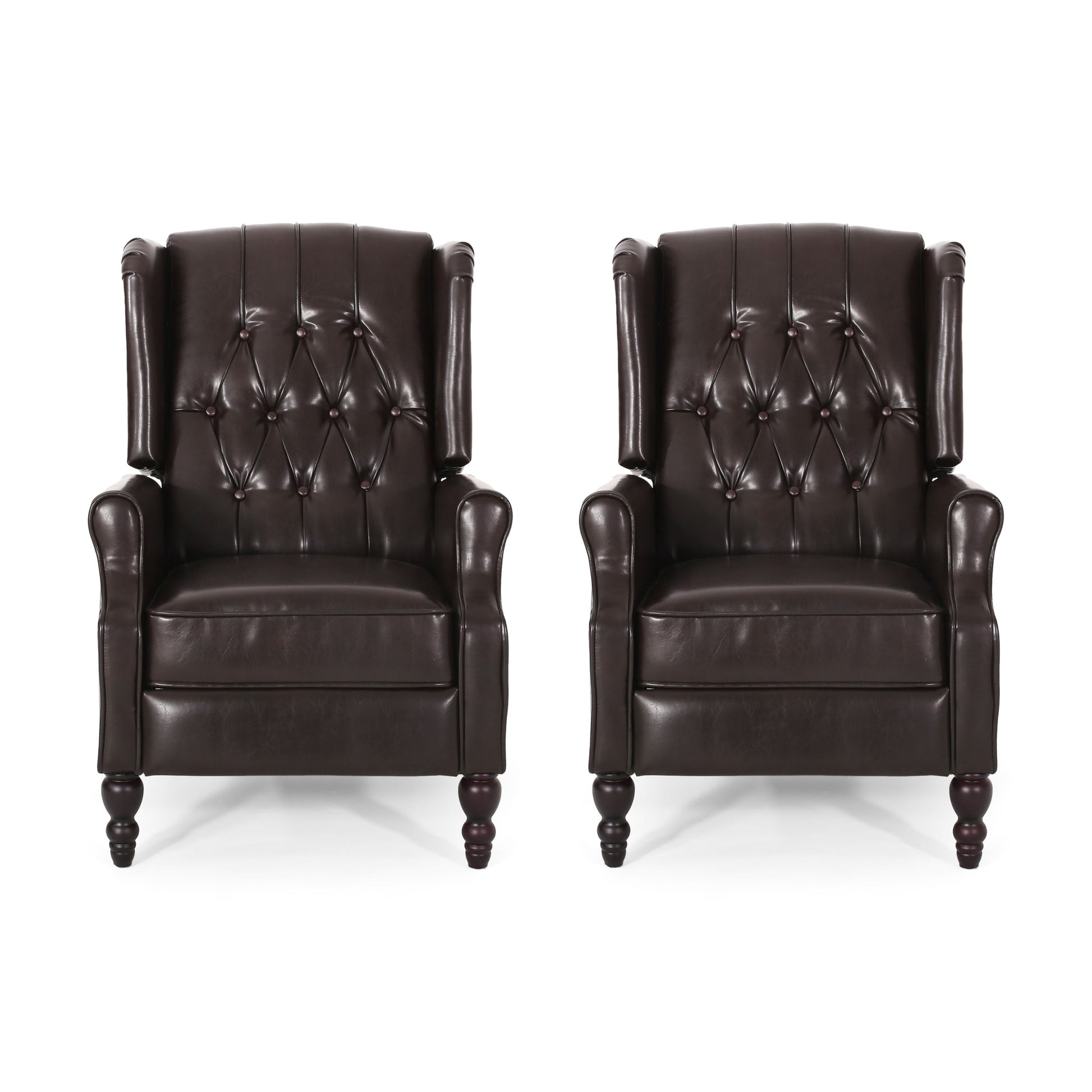 Elevate your living space with the Walter Recliner Set by Christopher Knight Home. This set of two recliners combines classic design elements, such as a wingback silhouette, button-tufted diamond stitching, and railheads trim, with modern functionality. The plush bonded leather upholstery and smooth pushback reclining mechanism provide exceptional comfort, while the sturdy birch wood legs ensure durability. Ideal for any living room or study, these recliners offer both style and relaxation.