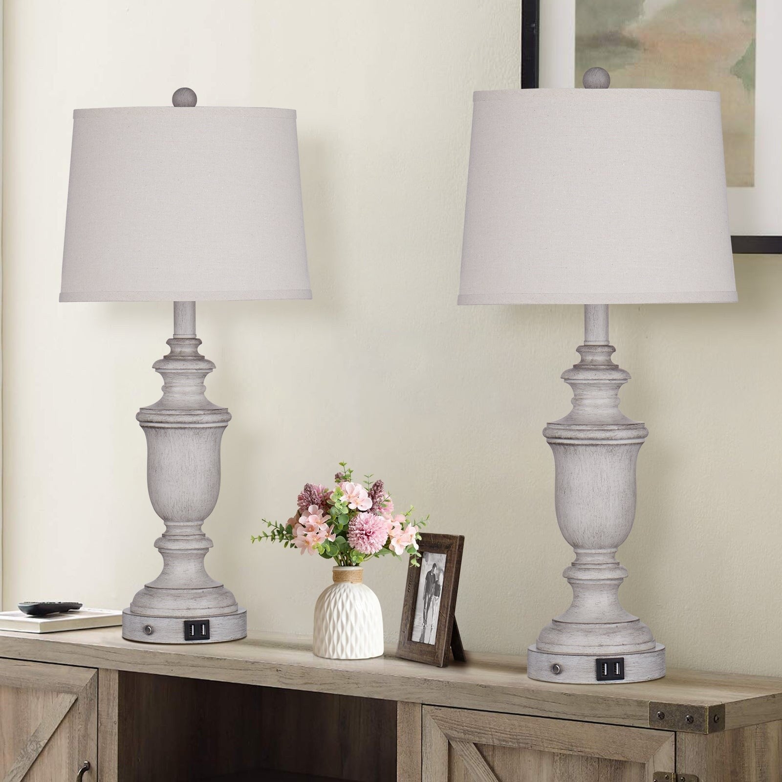 The table lamp set are made of resin. White appearance adopted the aged process. Stacked structure enhances the third dimension. Each table lamp pairs with a white tilted knockdown linen lampshade. For its lamp base, it adds the new modern features for powering your smart devices at your hand conveniently. For example, the dual USB charging ports. No matter you turn the lamp ON or OFF the charging ports are always work. Especially, the lamp base integrates a 3-way touch switch. And it is different from other touch switch on the base. It only control the lamp just when you touch the switch point. That's to adjust the switch more accurate and stay away from the accidential touch actions. About its bulb base, it's universal E26 standard. The bulb holder is LED compatible. You can conveniently replace it by your real needs(within 60W). We recommend some use scenes. For example, use in the living room, reading room, bedside or interior corridor.