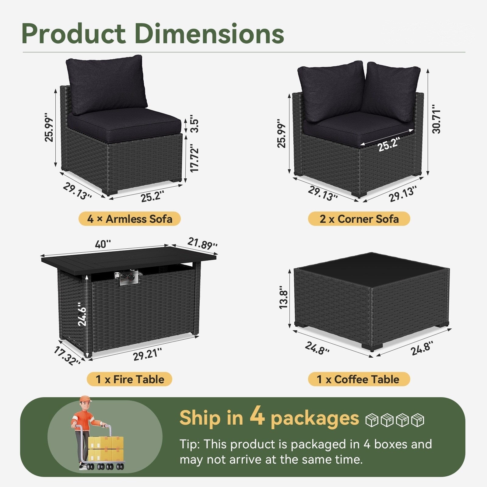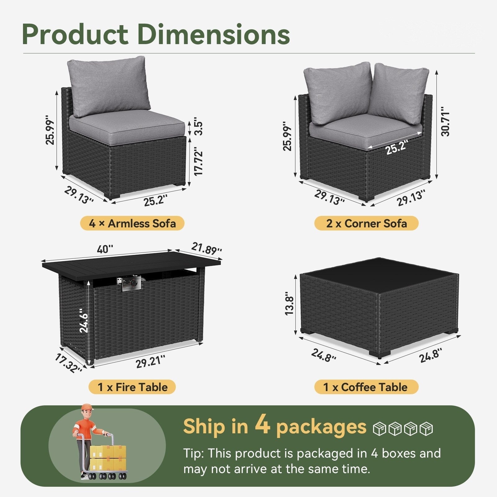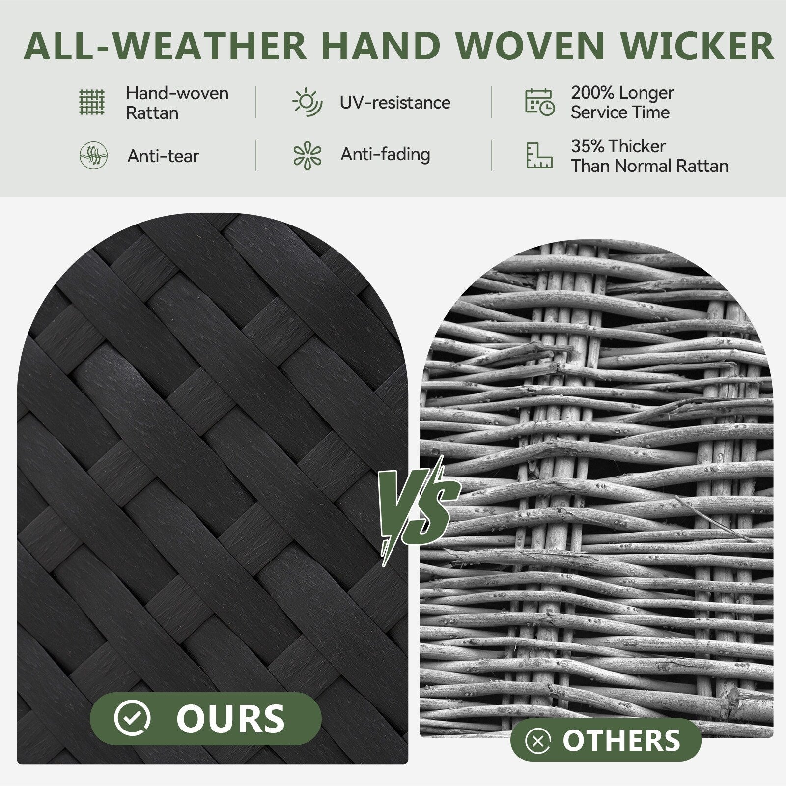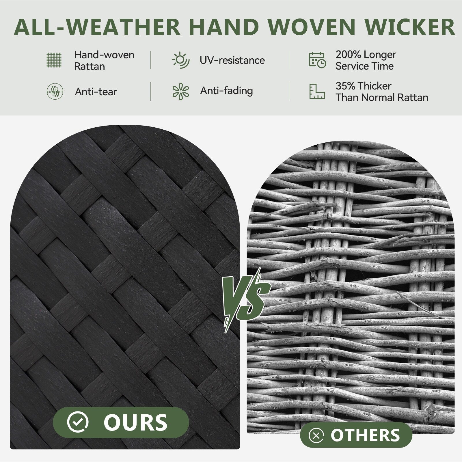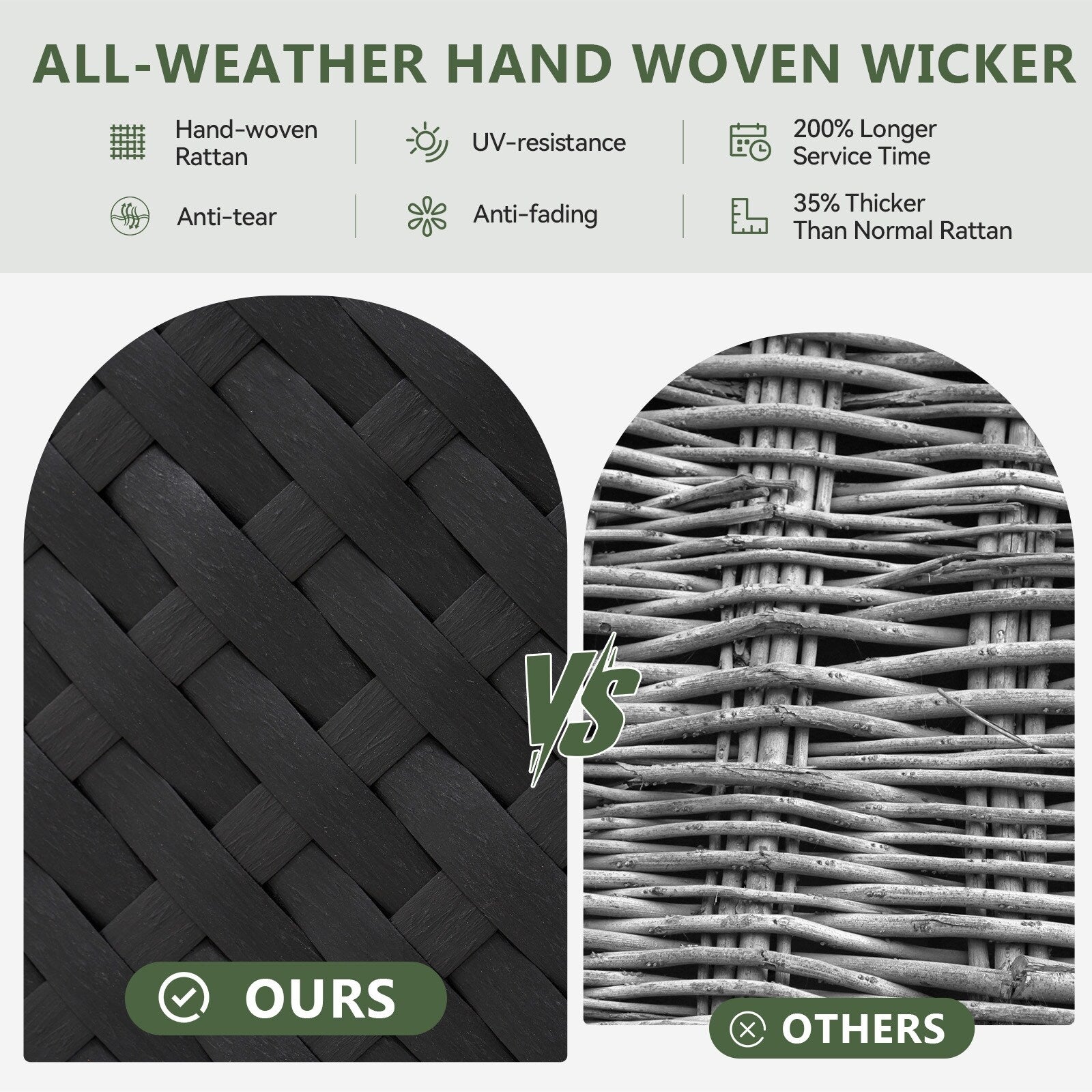 COMMERCIAL-GRADE DURABILITYConstructed with powder-coated galvanized steel frames and UV-resistant PVC rattan, this backyard furniture set withstands extreme weather conditions. The rust-resistant patio conversation set maintains structural integrity through seasons of use.?