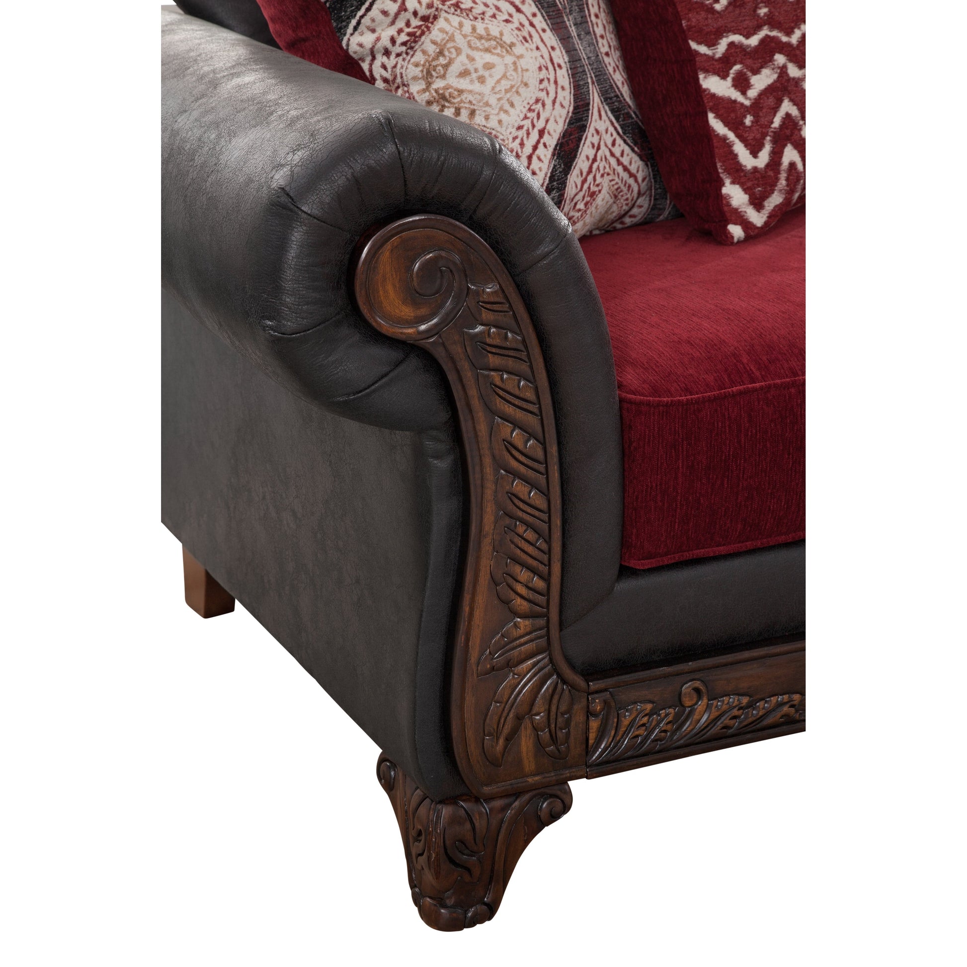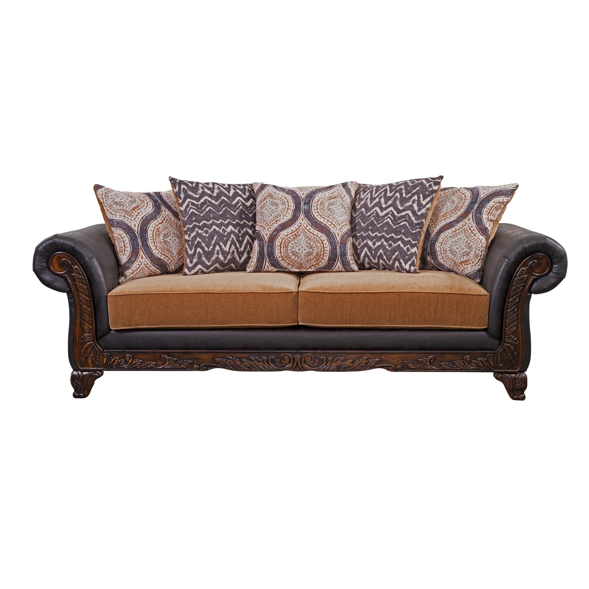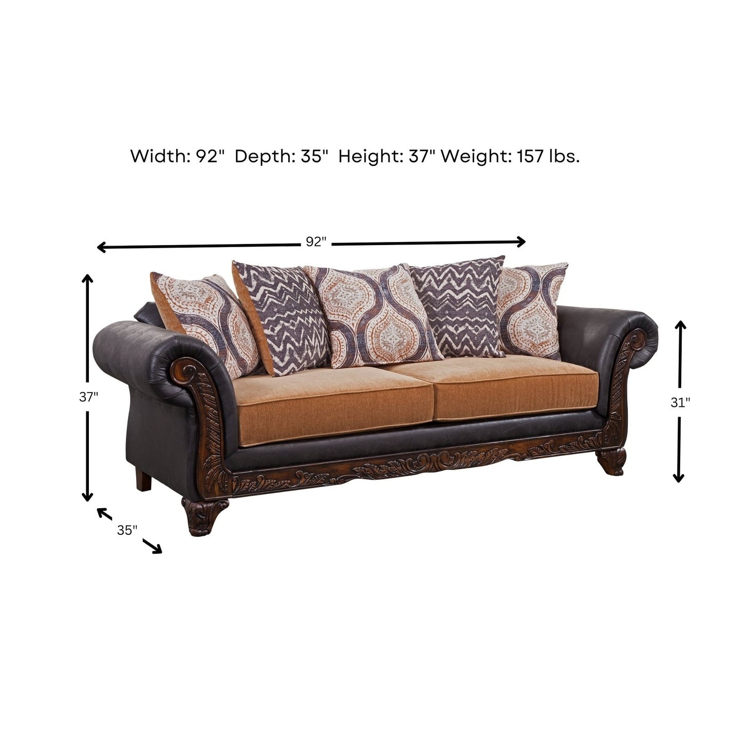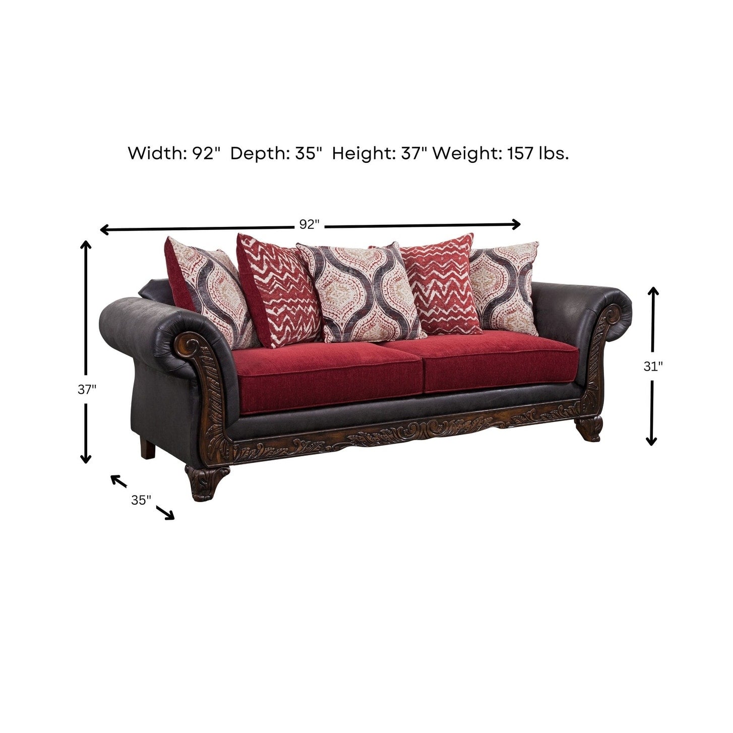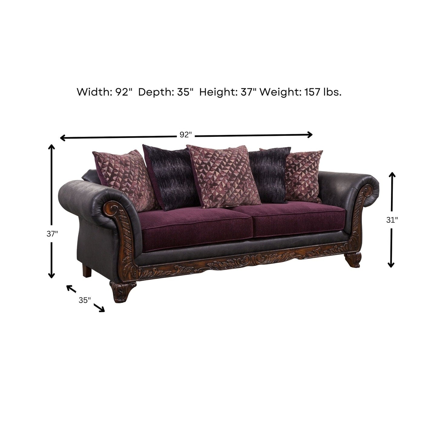 Elevate your living space with this traditional sofa, a testament to traditional sophistication and modern comfort. Crafted on a sturdy rolled arm frame adorned with exquisite show wood details, this ensemble boasts a luxurious polyester base in charcoal with a sleek vinyl finish. The cushions in their rich, chenille-textured, beckon relaxation and warmth, while the vibrant patterns of the loose back pillows add a contemporary flair. Embrace the deep allure of this sofa and indulge in timeless elegance in your home. Proudly made in the USA.
