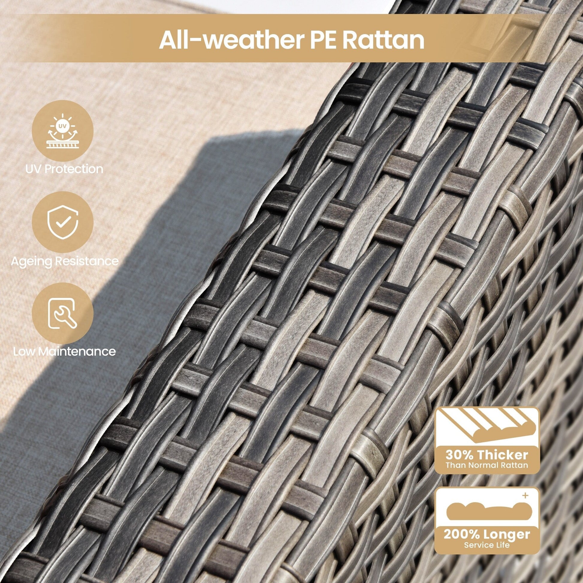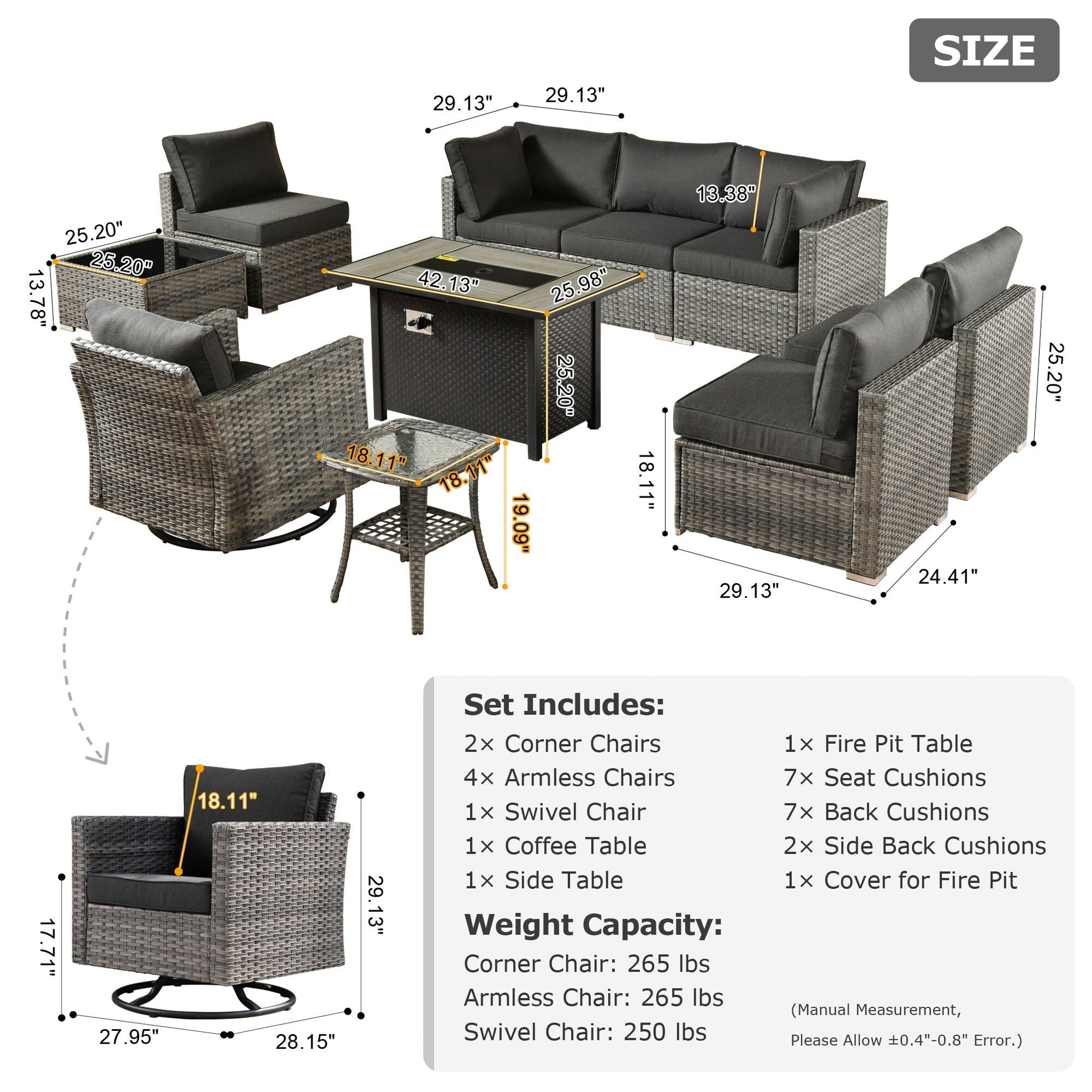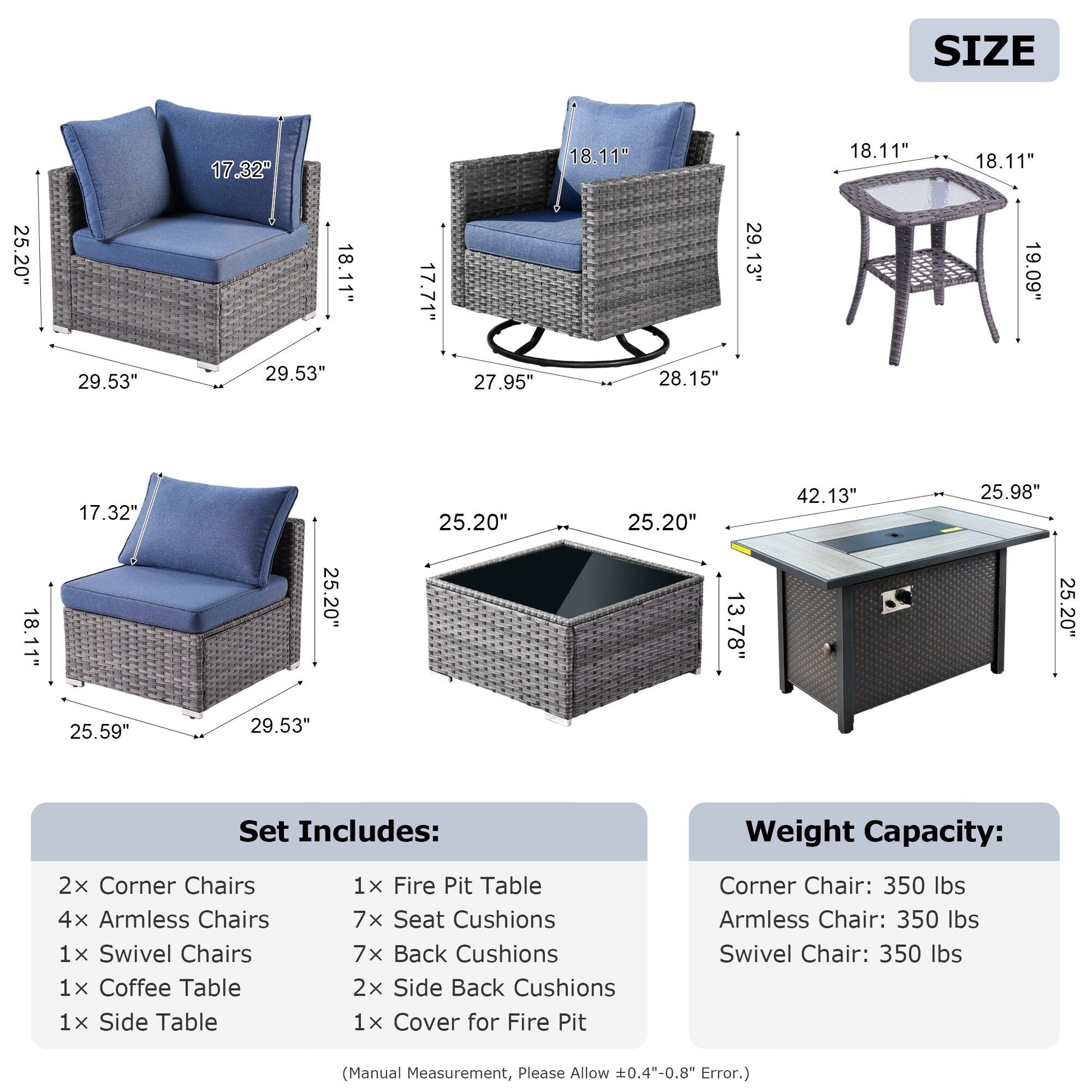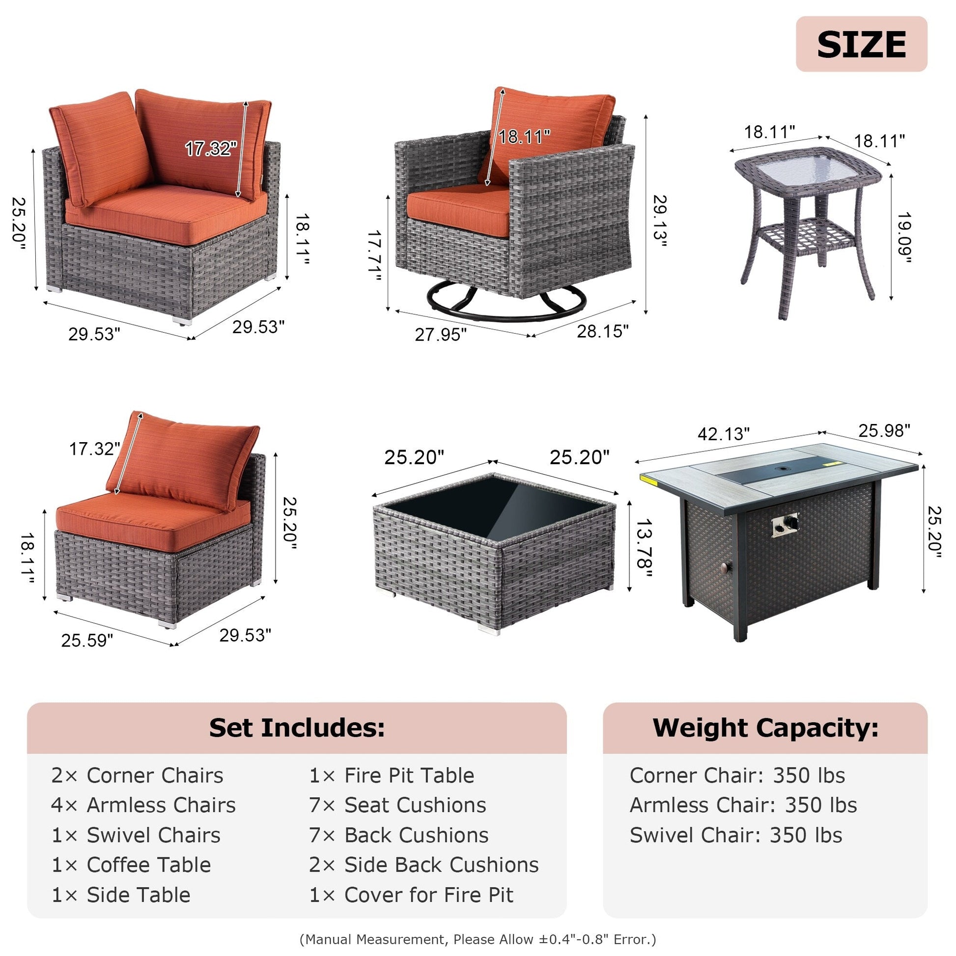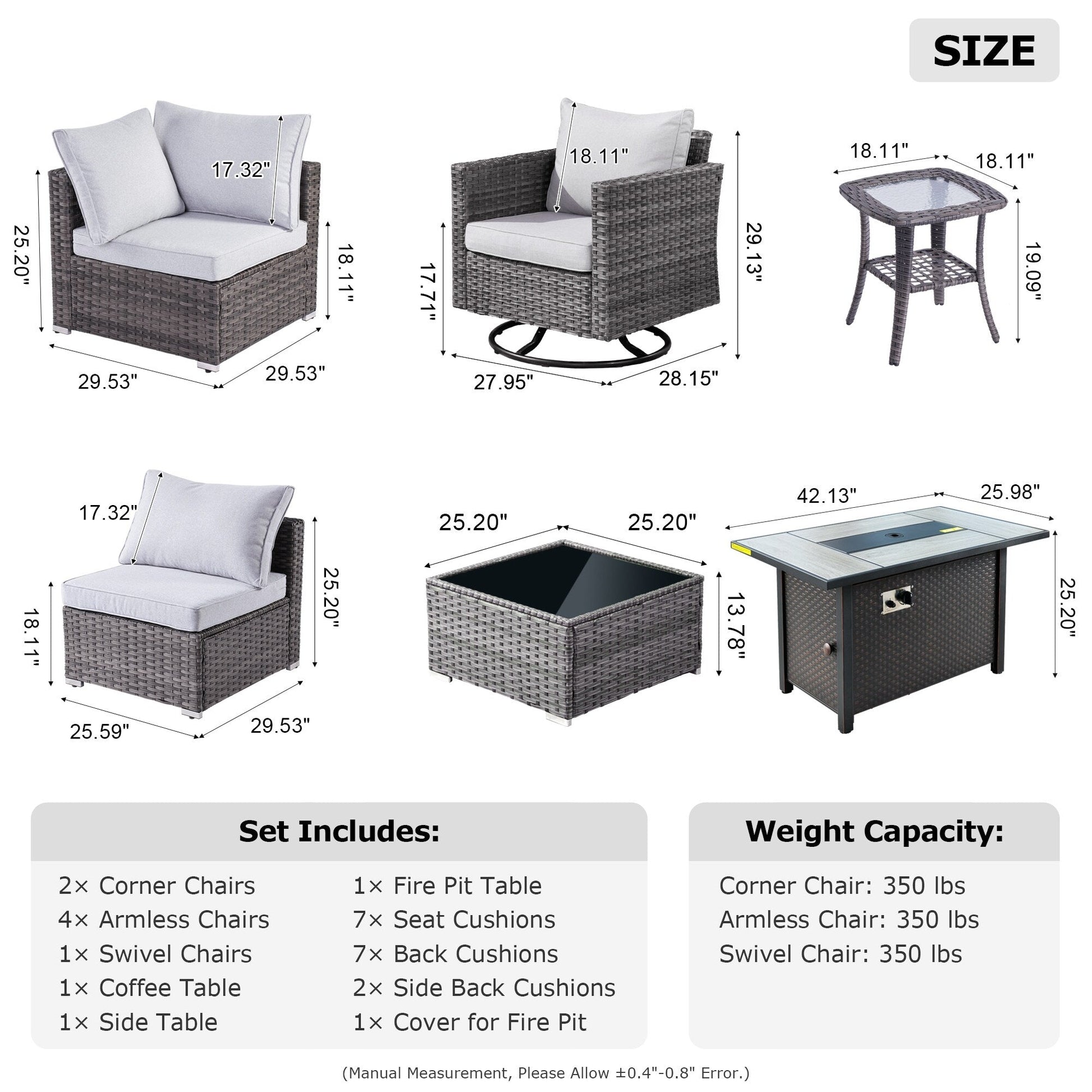 All weather grey PE wicker and solid steel frame make this rattan outdoor furniture set durable and sturdy. Enjoy the added comfort of 3.54'' thick high resilience sponge seat and soft back cushions. The firepit features stainless steel burner and ceramic tiles tabletop that works with standard 20 lbs liquefied petroleum gas. The fire table with electronic ignition system can adjust the flame easily and can create a warm and romantic party atmosphere for you and your family.?