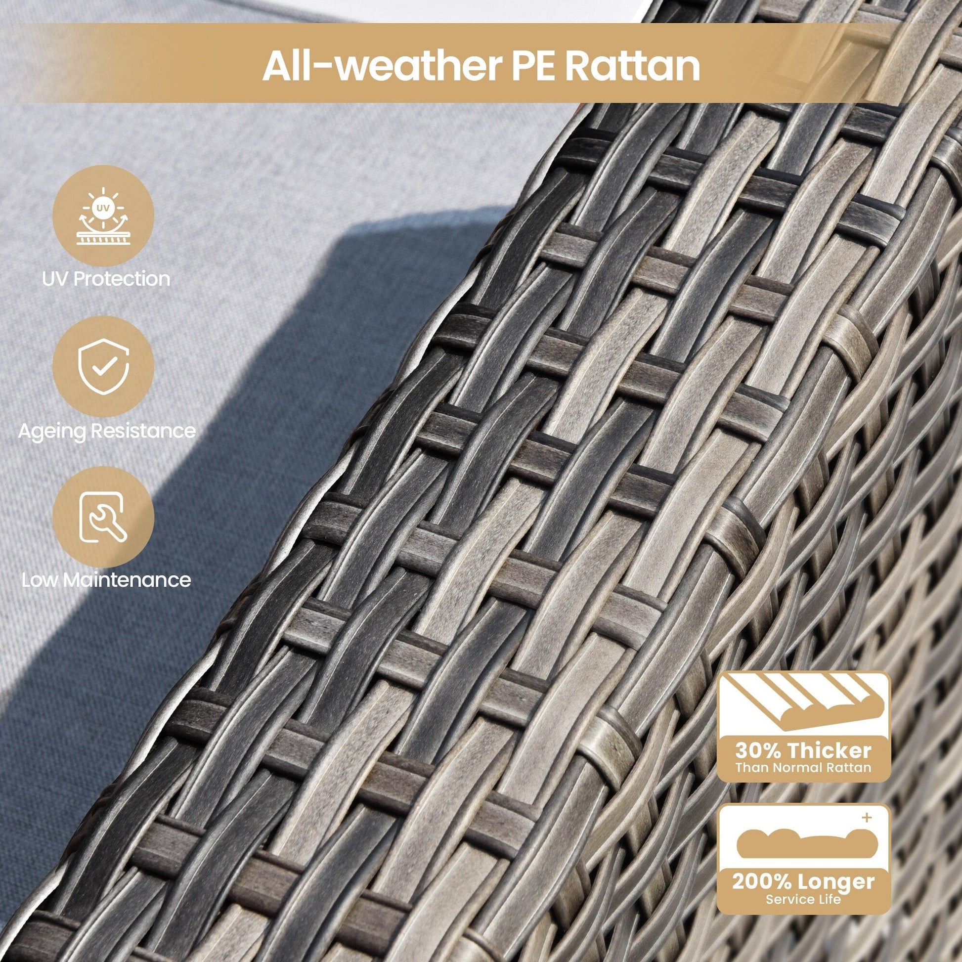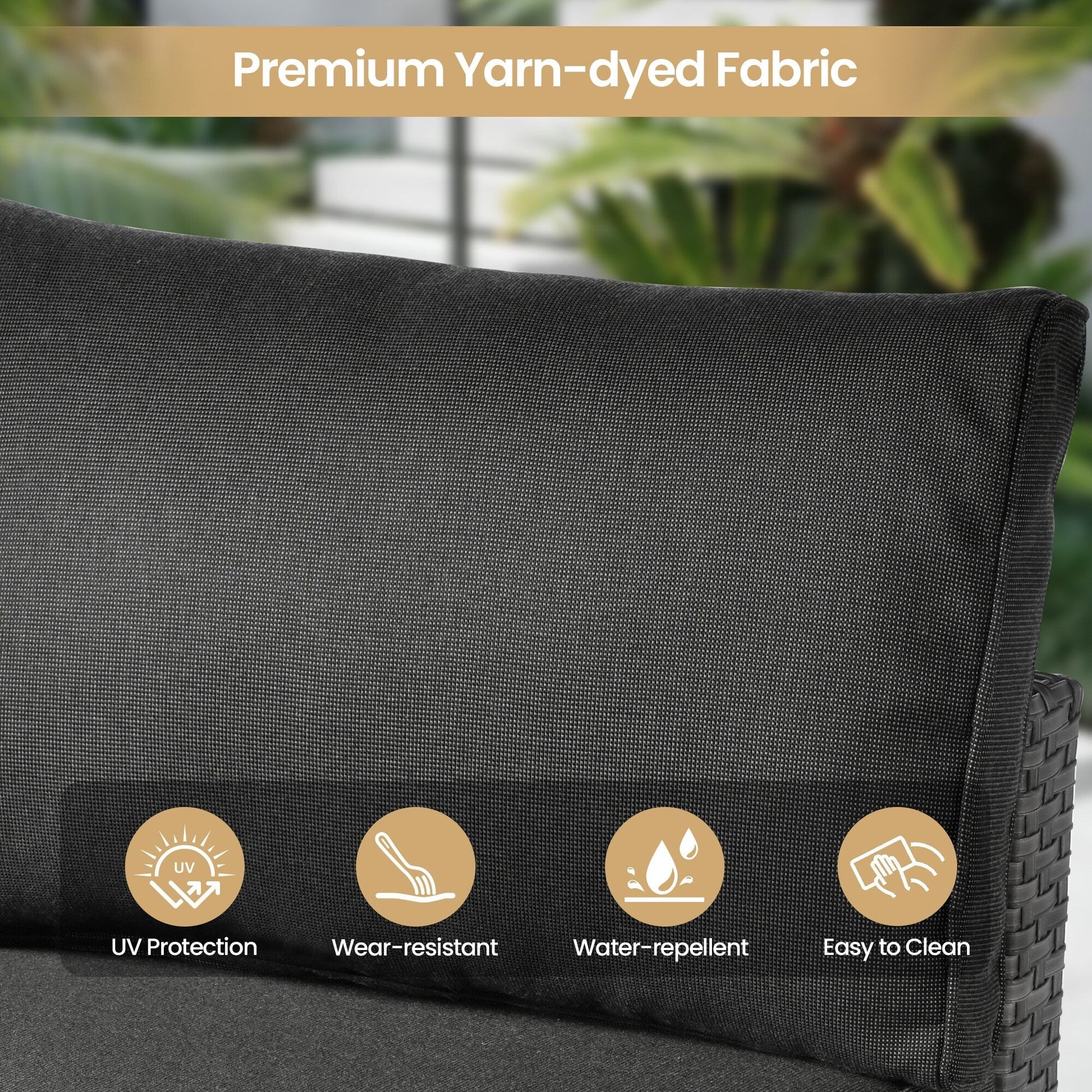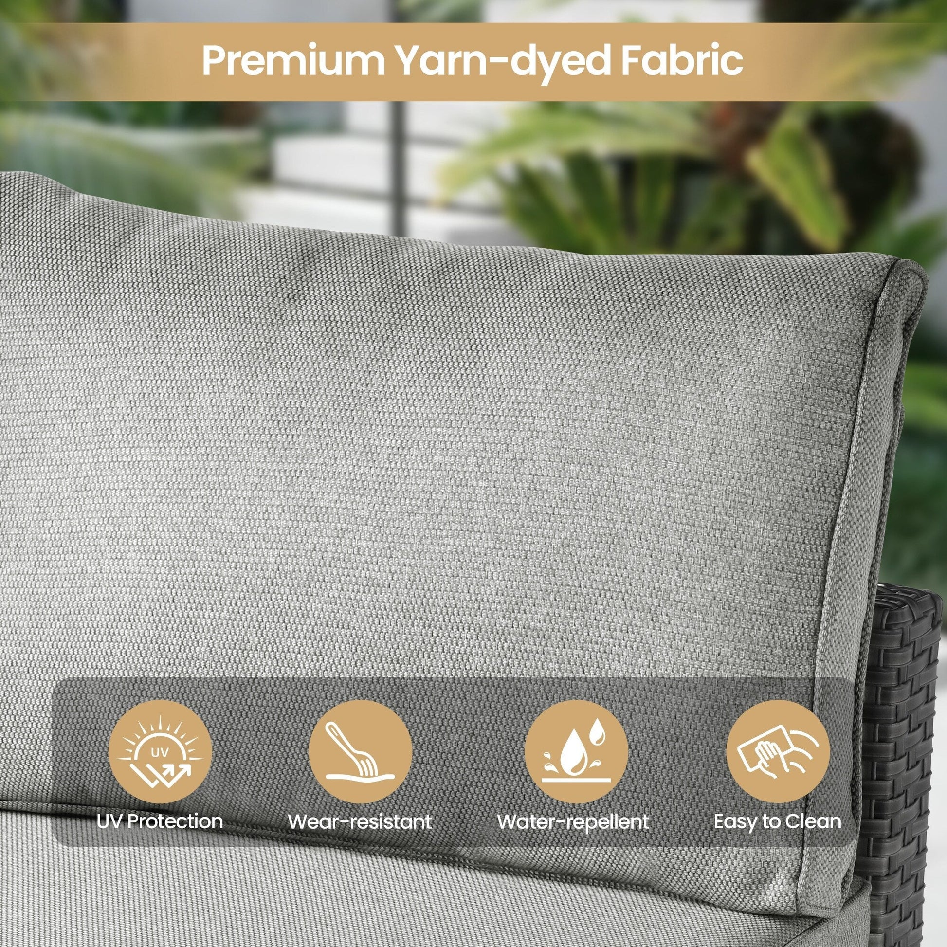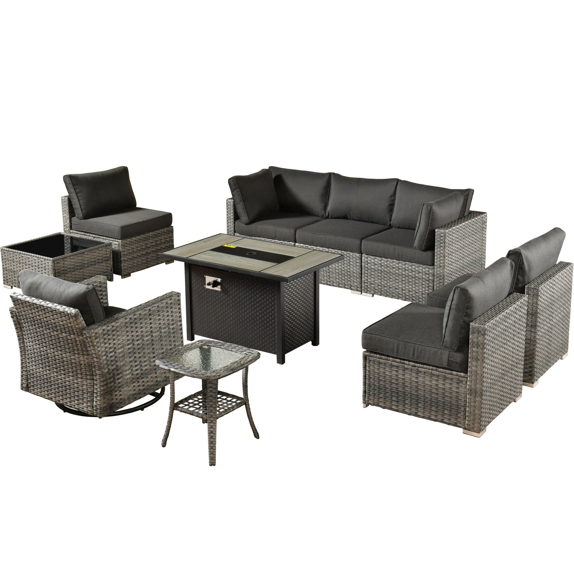 All weather grey PE wicker and solid steel frame make this rattan outdoor furniture set durable and sturdy. Enjoy the added comfort of 3.54'' thick high resilience sponge seat and soft back cushions. The firepit features stainless steel burner and ceramic tiles tabletop that works with standard 20 lbs liquefied petroleum gas. The fire table with electronic ignition system can adjust the flame easily and can create a warm and romantic party atmosphere for you and your family.?