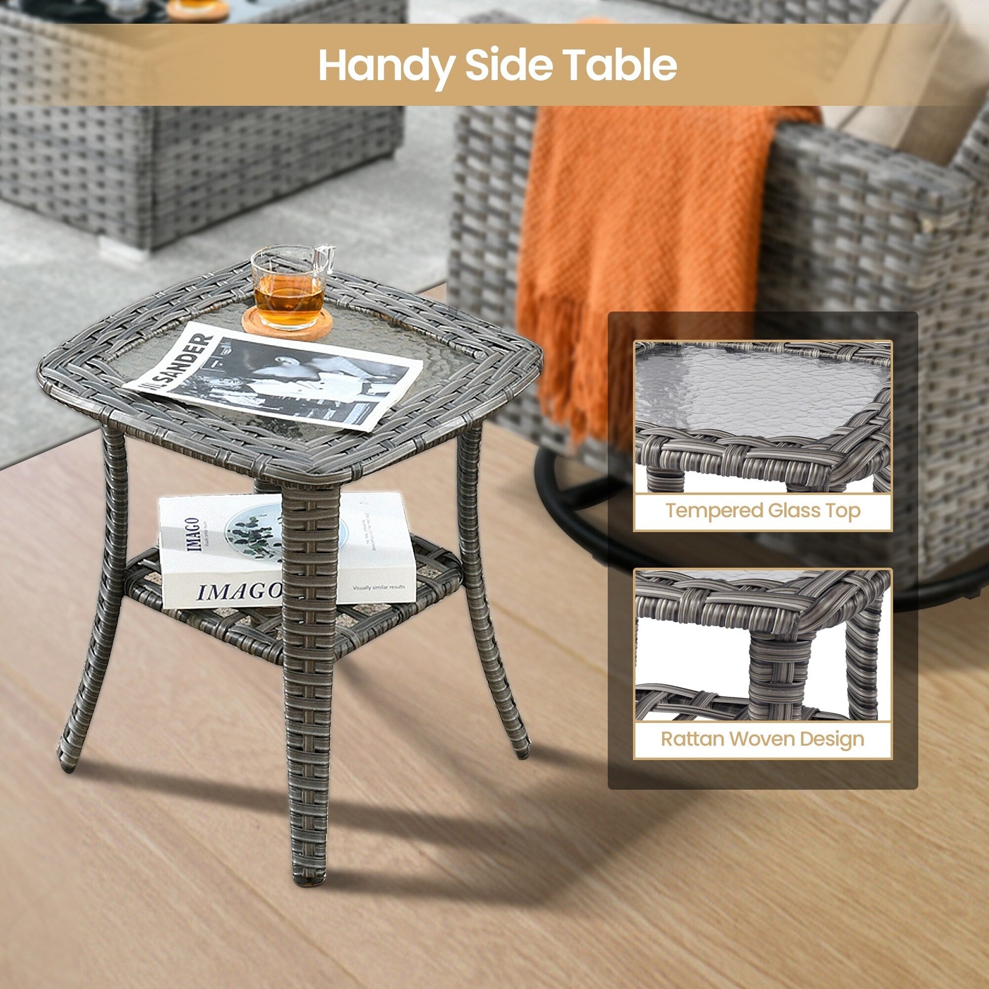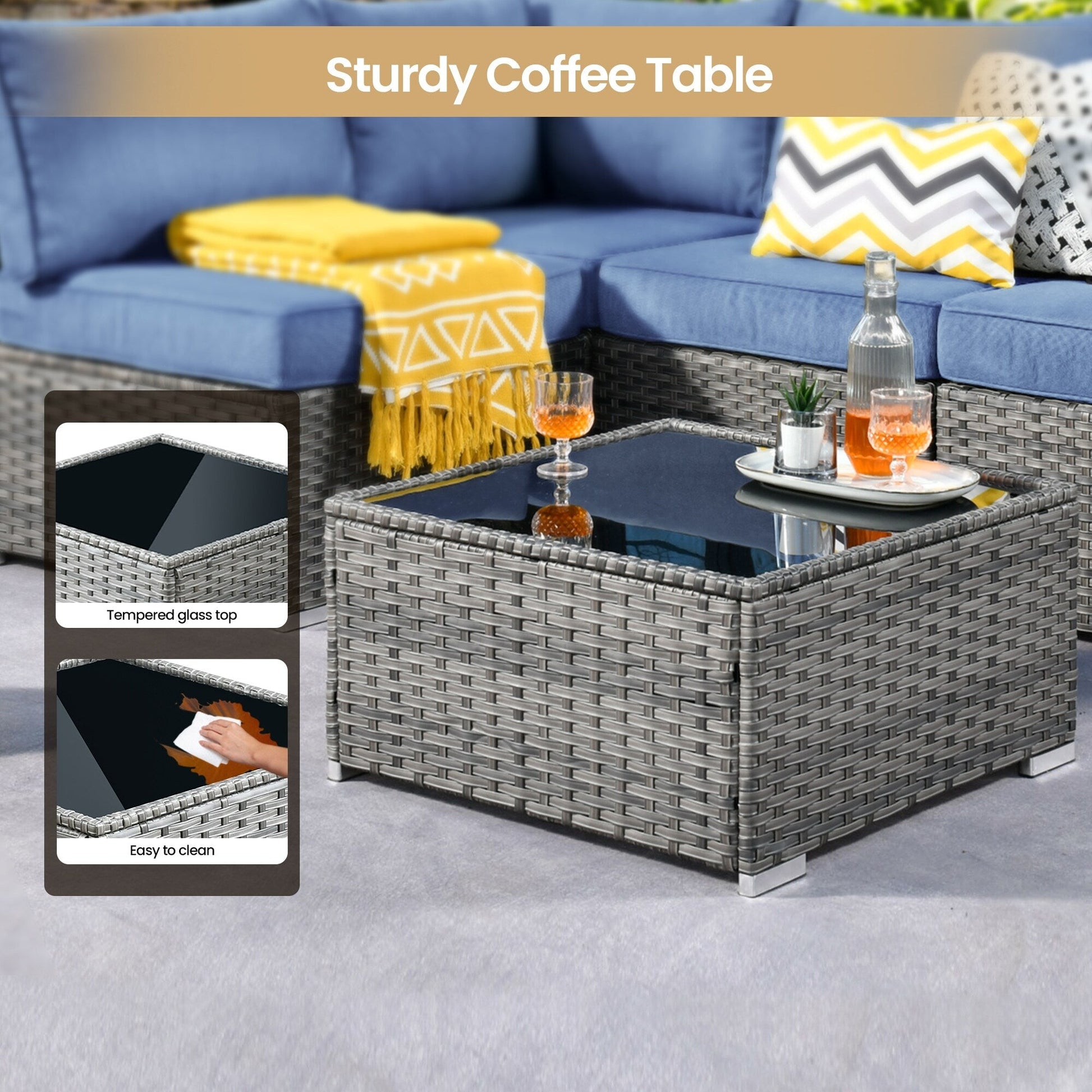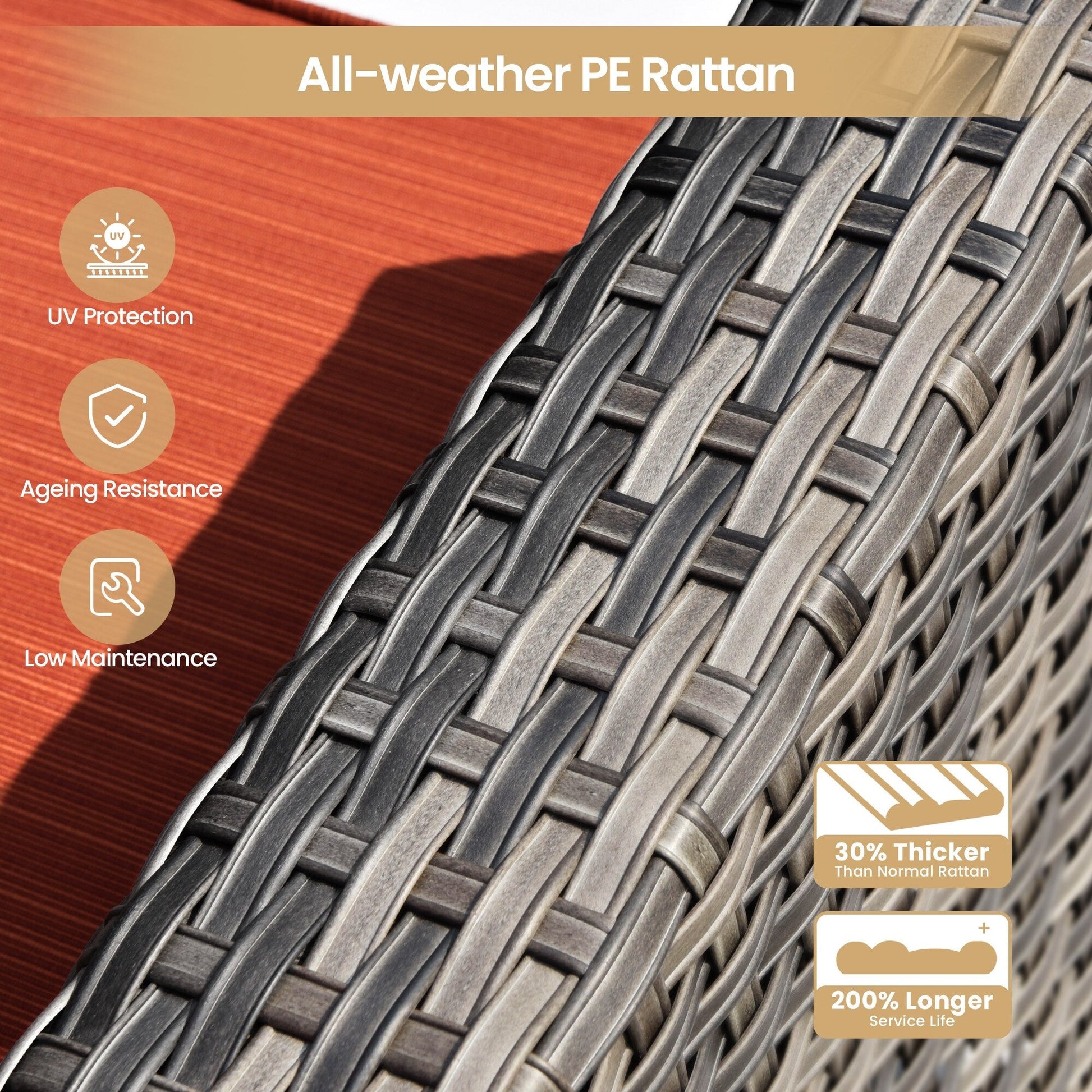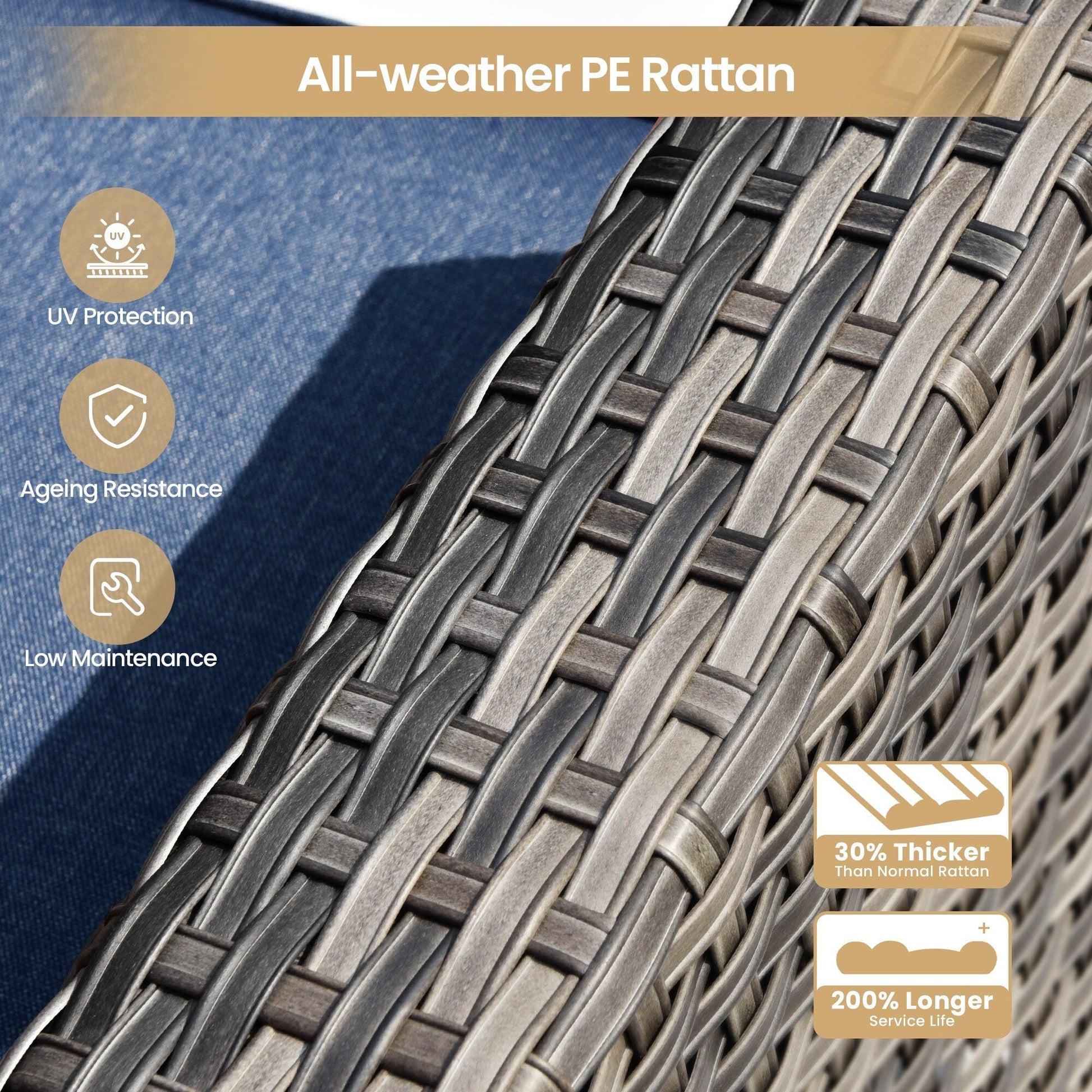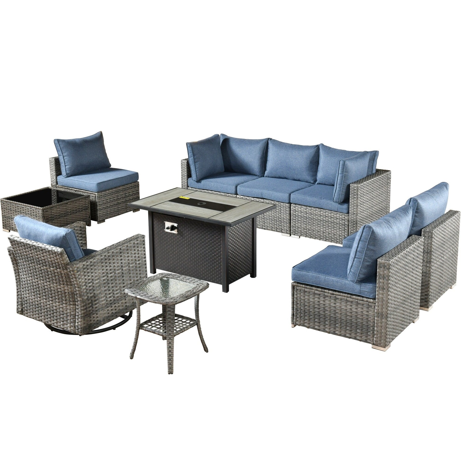 All weather grey PE wicker and solid steel frame make this rattan outdoor furniture set durable and sturdy. Enjoy the added comfort of 3.54'' thick high resilience sponge seat and soft back cushions. The firepit features stainless steel burner and ceramic tiles tabletop that works with standard 20 lbs liquefied petroleum gas. The fire table with electronic ignition system can adjust the flame easily and can create a warm and romantic party atmosphere for you and your family.?