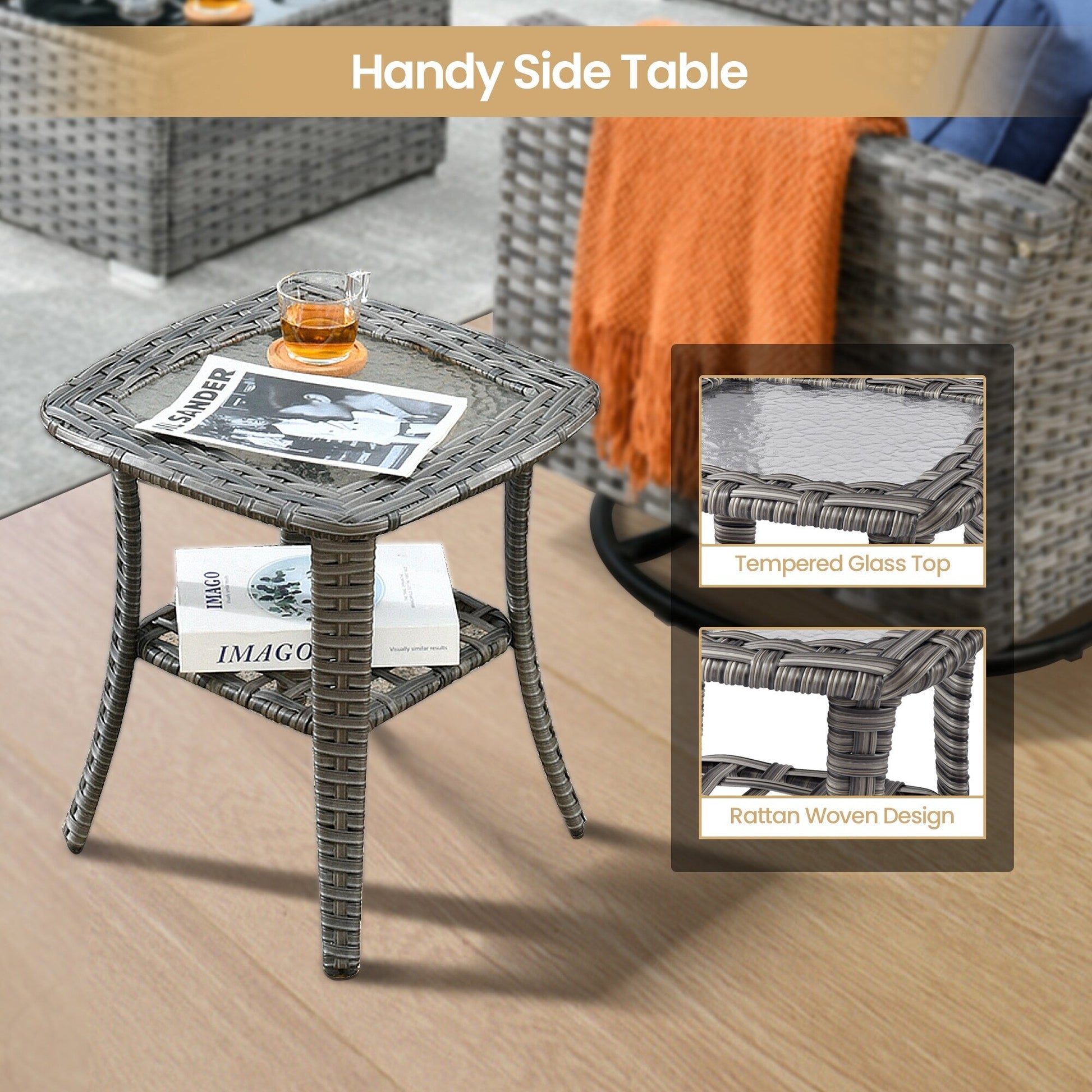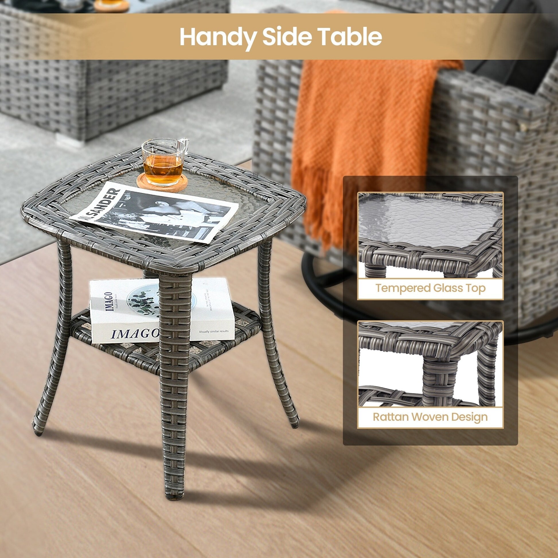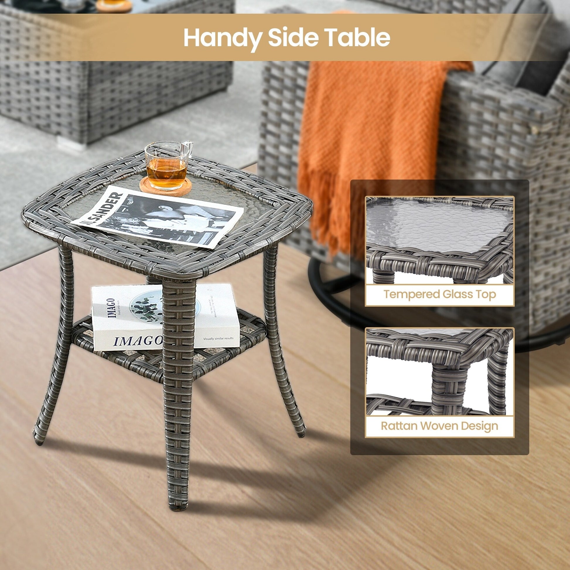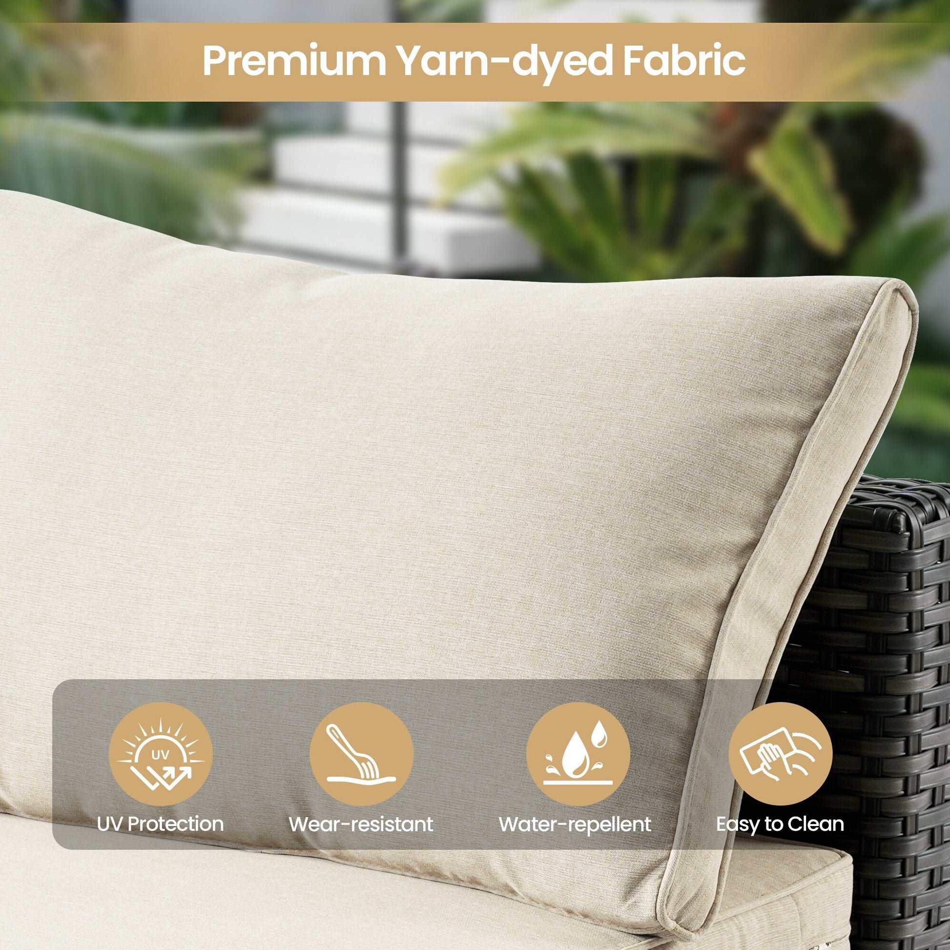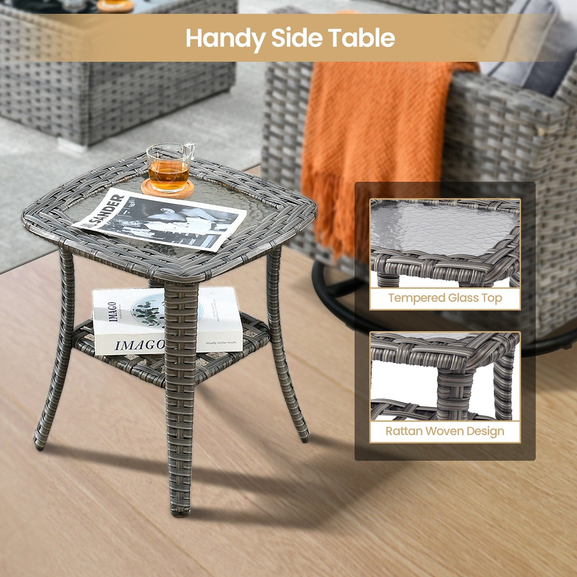All weather grey PE wicker and solid steel frame make this rattan outdoor furniture set durable and sturdy. Enjoy the added comfort of 3.54'' thick high resilience sponge seat and soft back cushions. The firepit features stainless steel burner and ceramic tiles tabletop that works with standard 20 lbs liquefied petroleum gas. The fire table with electronic ignition system can adjust the flame easily and can create a warm and romantic party atmosphere for you and your family.?