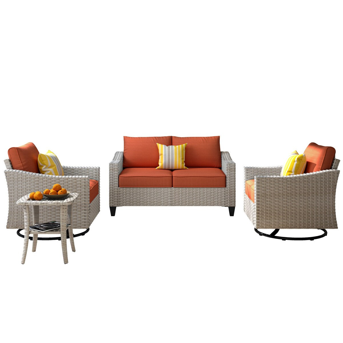 Relax and entertain with the XIZZI 4-piece rattan wicker furniture deep seat conversation sofa set. Constructed from all-weather handcrafted wicker and powder-coated metal frame, enhancing the stability considerably and ensuring your sofa set for years to come. ?The cushions are available in 5 colors and the covers feature superior water repellent fabric that is removable and easy to clean. Curved back and armrest design can give you more comfortable sitting experience. Swivel rocking chairs are more stable with solid base structure and can rotate 360 degree and rock back or forth smoothly.